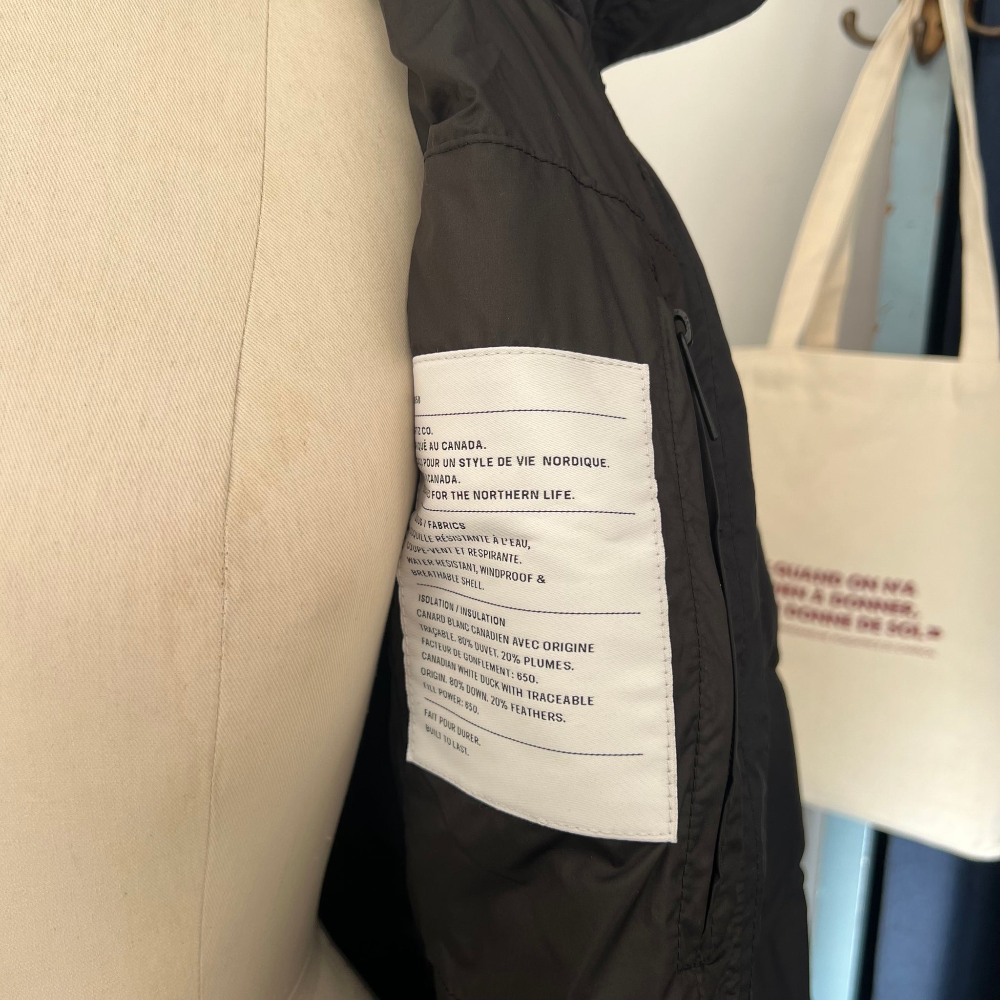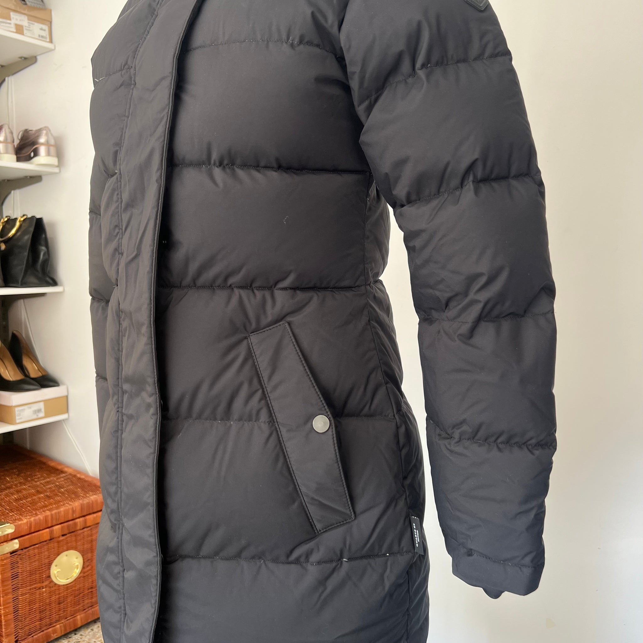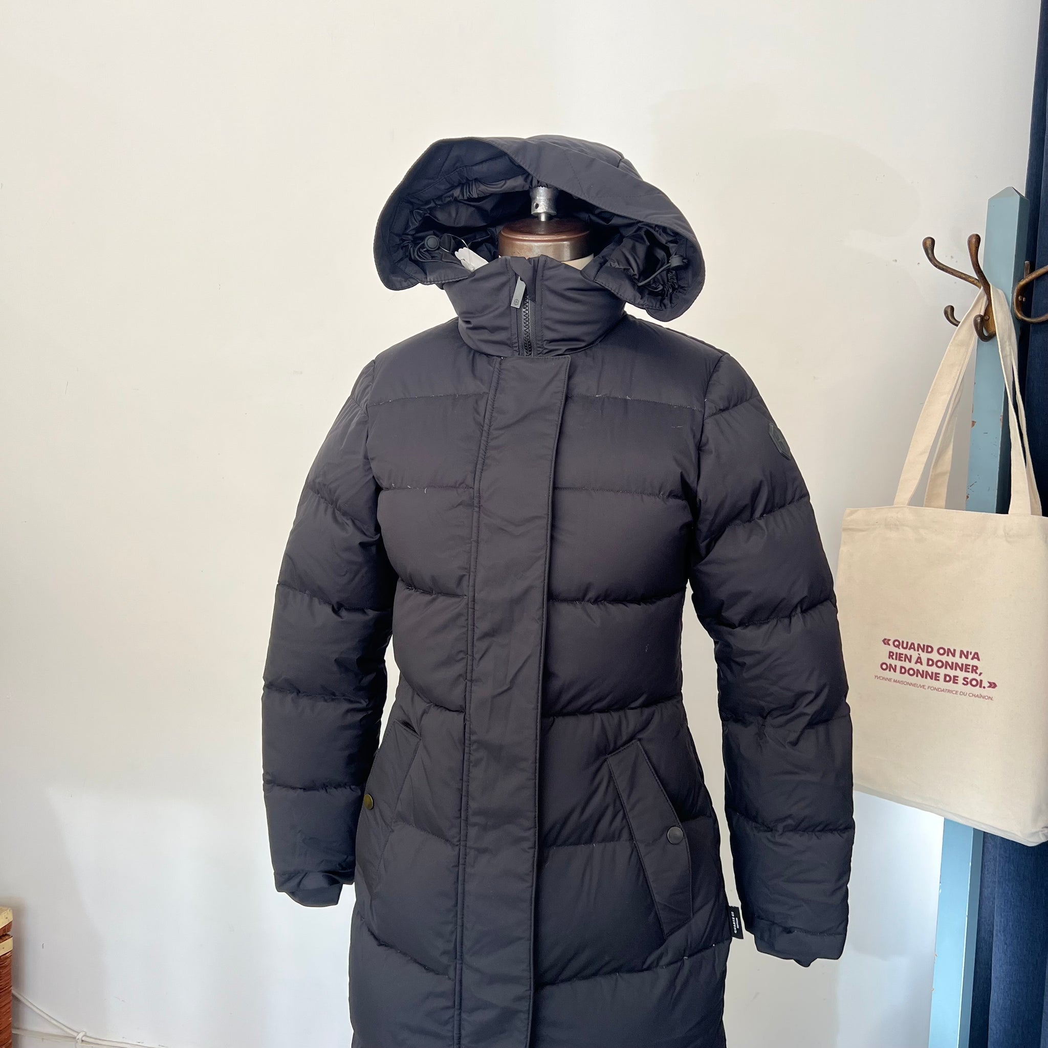 Manteau de la marque Quartz Co, modèle Jane en duvet. Manteau d’hiver à coupe semi-ajustée. Modèle isolé de duvet de canard blanc canadien 650 (provenant de fermes éthiques et d’origine traçable certifiée). Caractéristiques principales : tissu extérieur respirant et traité avec un déperlant, capuchon fixe avec fourrure de coyote canadien amovible et fermeture à glissière bidirectionnelle. D'une valeur de plus de 1 000$