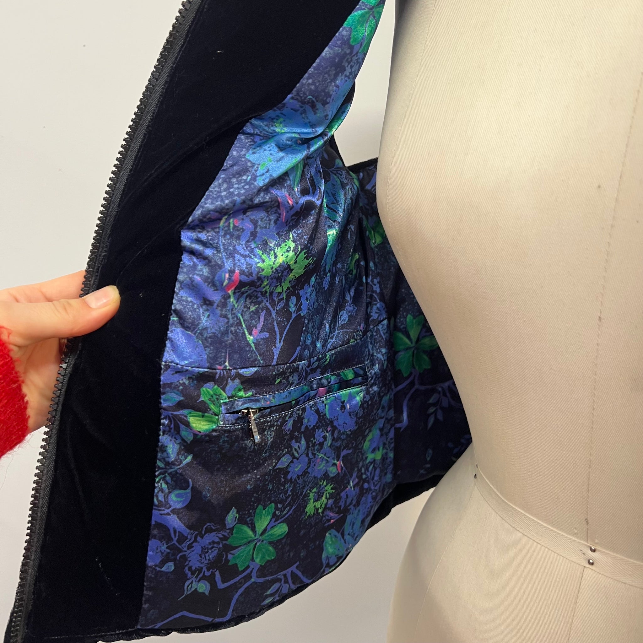 Doudoune sans manches signée Elie Tahari modèle Judy Vest. Col montant orné d'une somptueuse fourrure indigo. Finition en velours indigo. Deux poches avant discrètes et pratiques. Doublure intérieure à motif floral avec une poche à fermeture éclair.