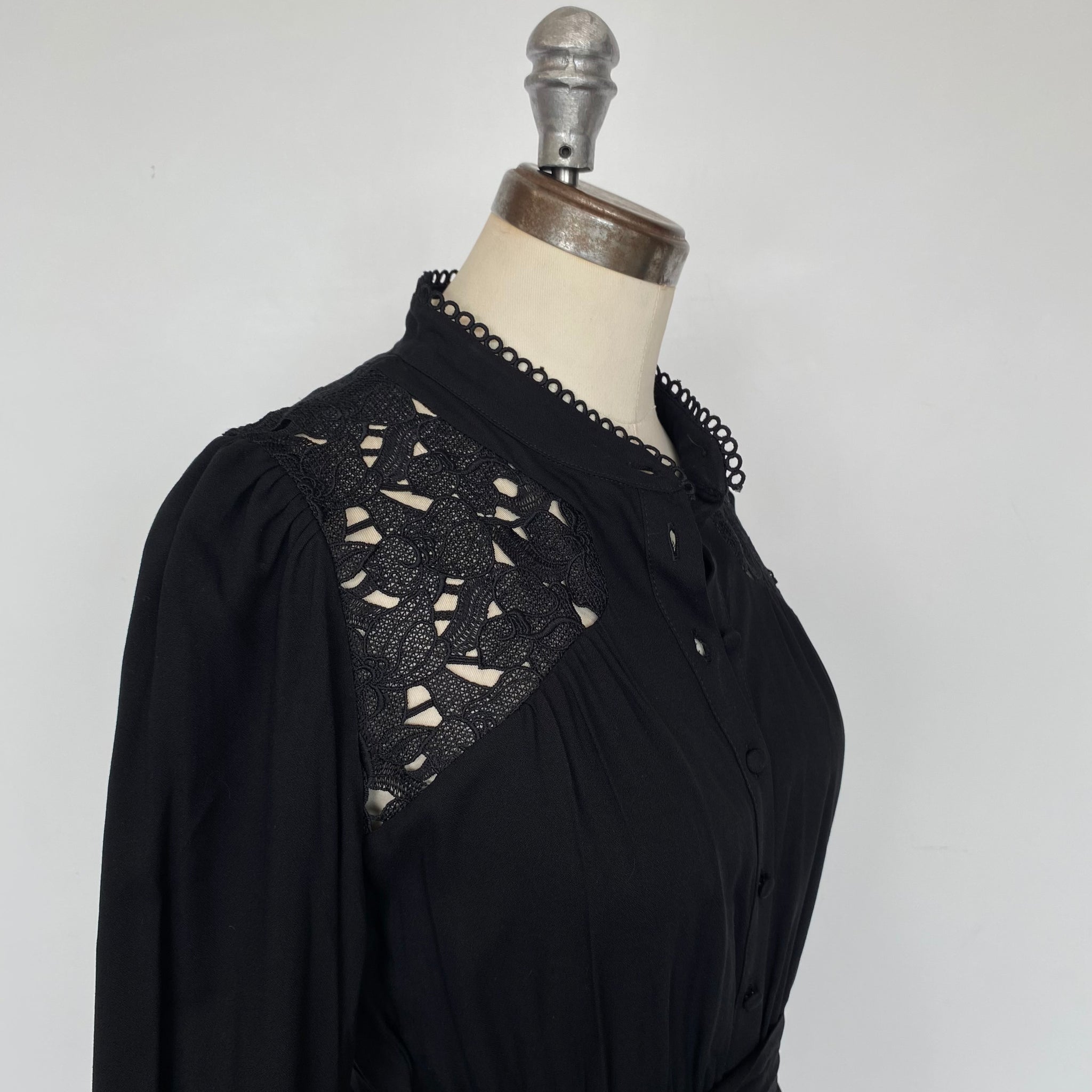 Robe romantique de la marque Suncoo Paris à manches longues. Modèle Civi. Avec boutonnière à l'avant, ceinture amovible à la taille, décorations de style dentelle aux manches et à la poitrine. Tissu non doublé mais opaque, parfait peu importe la saison! D'une valeur de 285,00$.