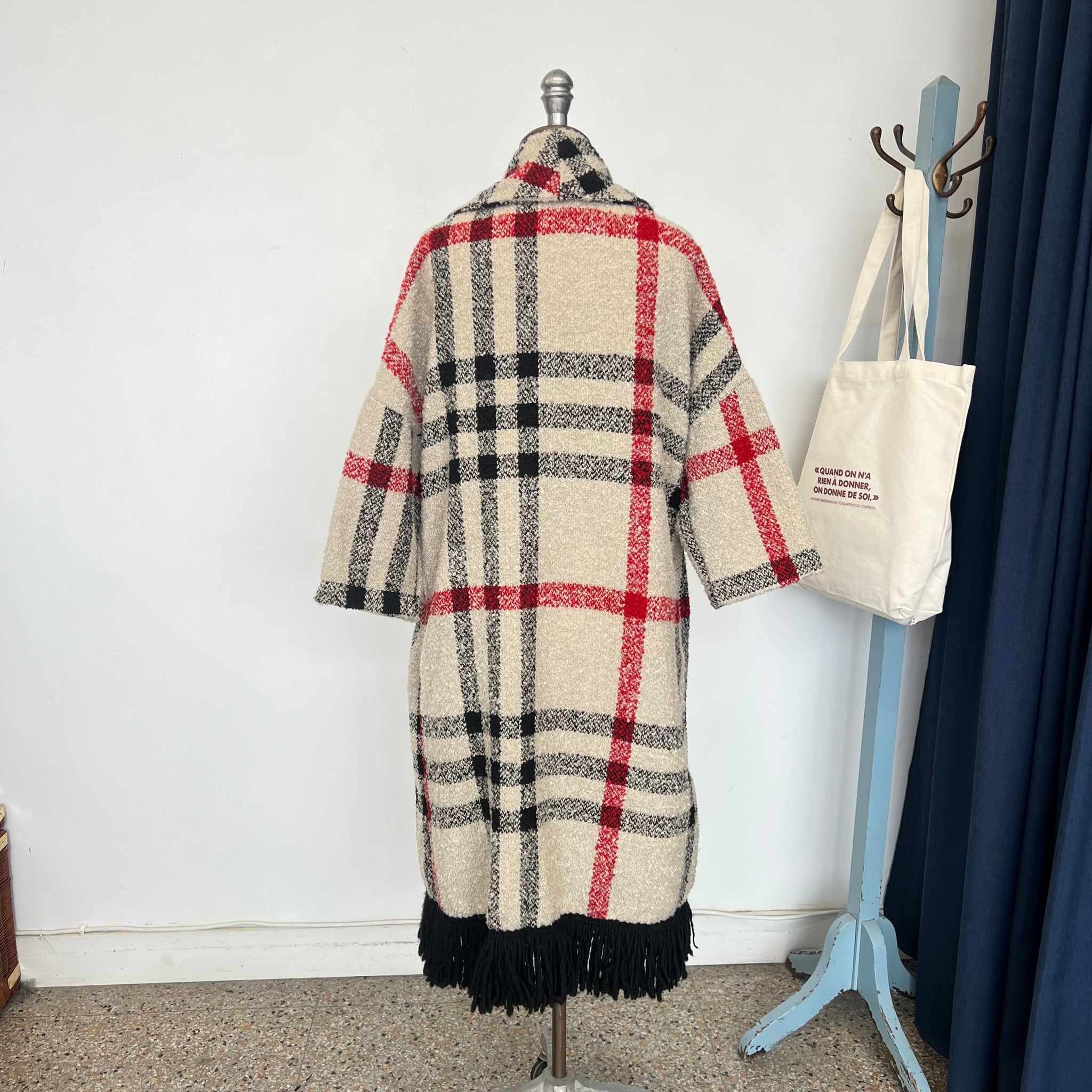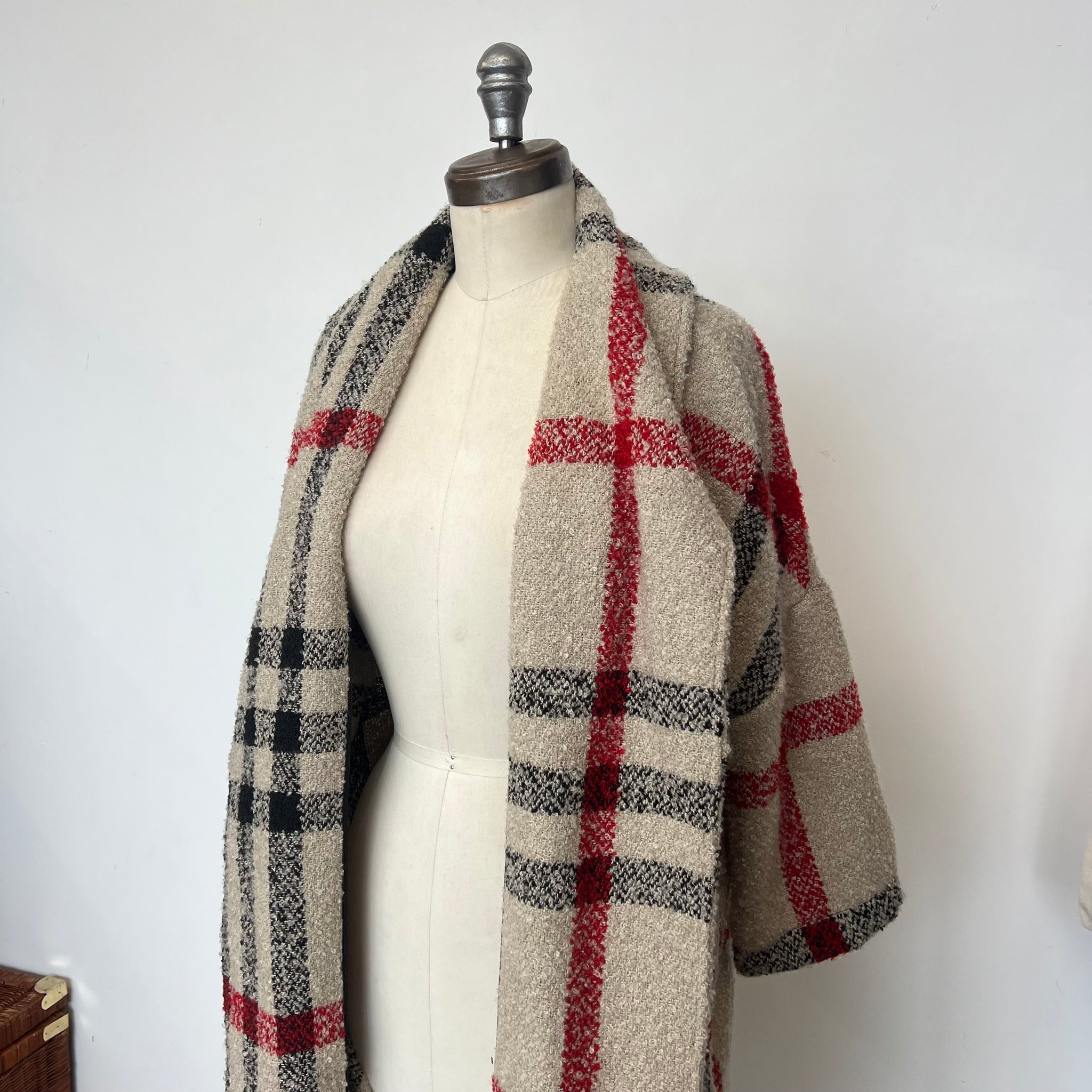 Veste longue ouverte à carreaux de la marque Uchuu. Tissu confortable en molleton non doublé, avec franges noires au bas.. Avec deux poches latérales. Peut faire comme manteau lors de températures plus chaudes sinon comme une veste pour rester au chaud à la maison!