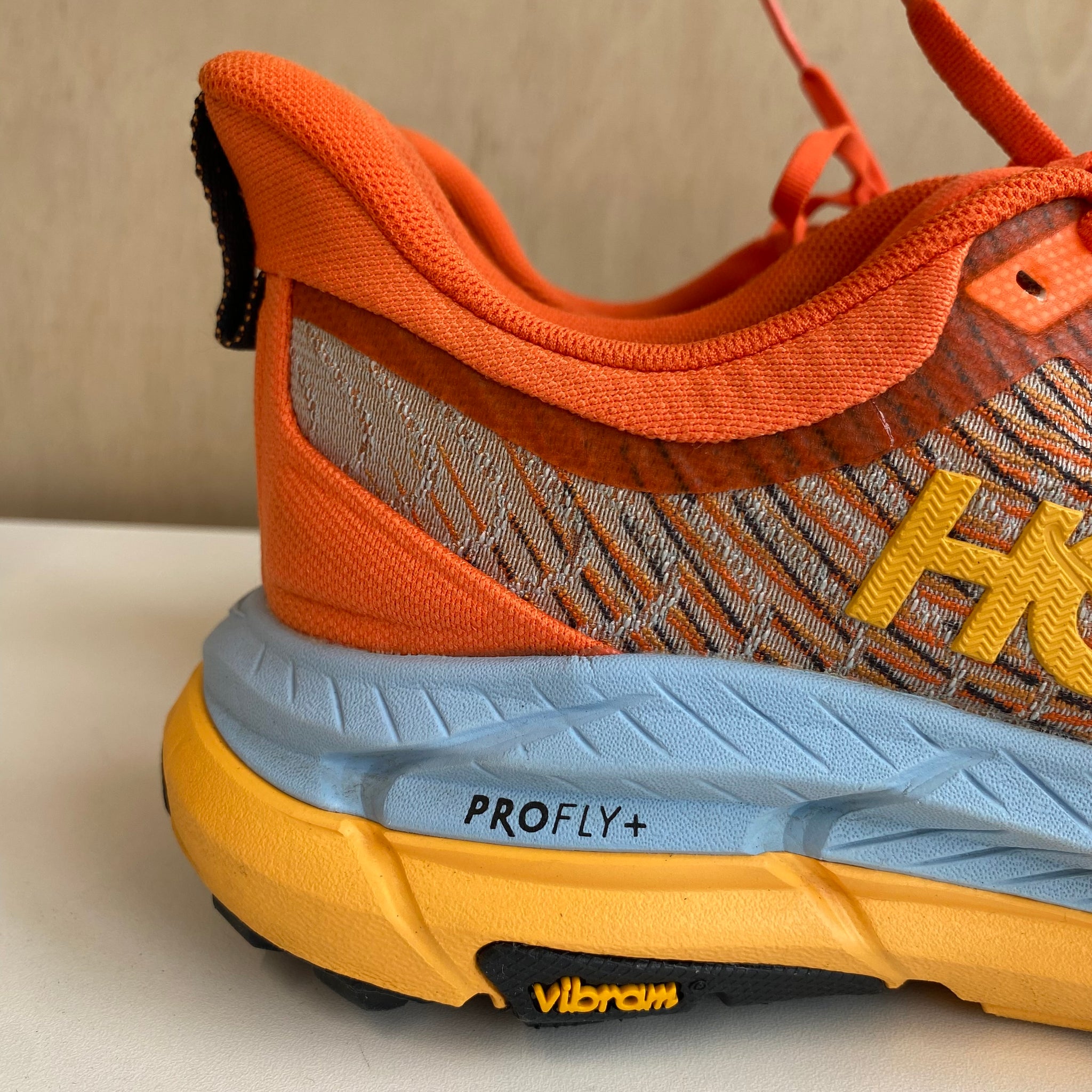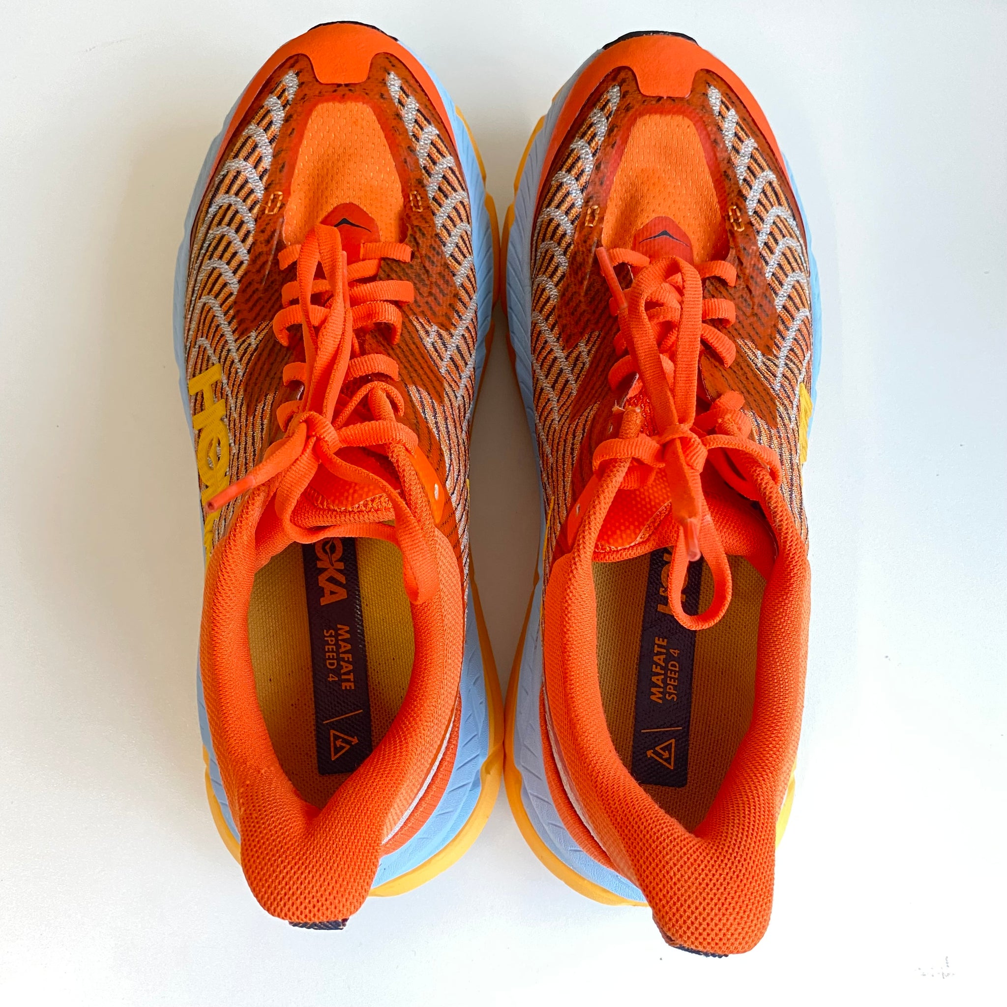 Chaussures de course sur sentier pour homme de la marque Hoka modèle Mafate Speed 4. Modèle phare de la course sur sentiers techniques. La tige est faite de maille jacquard monocouche respirante et la semelle intercalaire PROFLY+™ en deux parties intègre la mousse Hoka la plus légère et la plus réactive sous le pied. Semelle Vibram MegaGrip de 5 mm avec technologie Litebase et crampons de traction. D'une valeur de 225$.