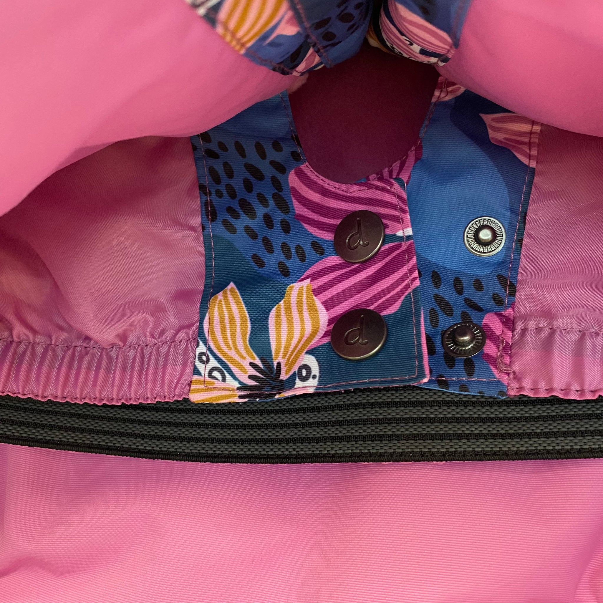 Manteau d'hiver à imprimé de fleurs et de jungle de la marque Deux par Deux. Chaud et résistant, conçu pour affronter l’hiver jusqu’à -30 °C (-22 °F). Doublé en polar (corps, dos, col, capuchon), il offre une excellente isolation en fibres de polyester (capuchon 57 g, corps 170 g, manches 170 g). Le tissu est imperméable (5000 mm) et respirant (5000 g/m²/24h), idéal pour les jeux actifs et les sports d’hiver. Capuchon amovible et ajustable, avec fausse fourrure détachable.