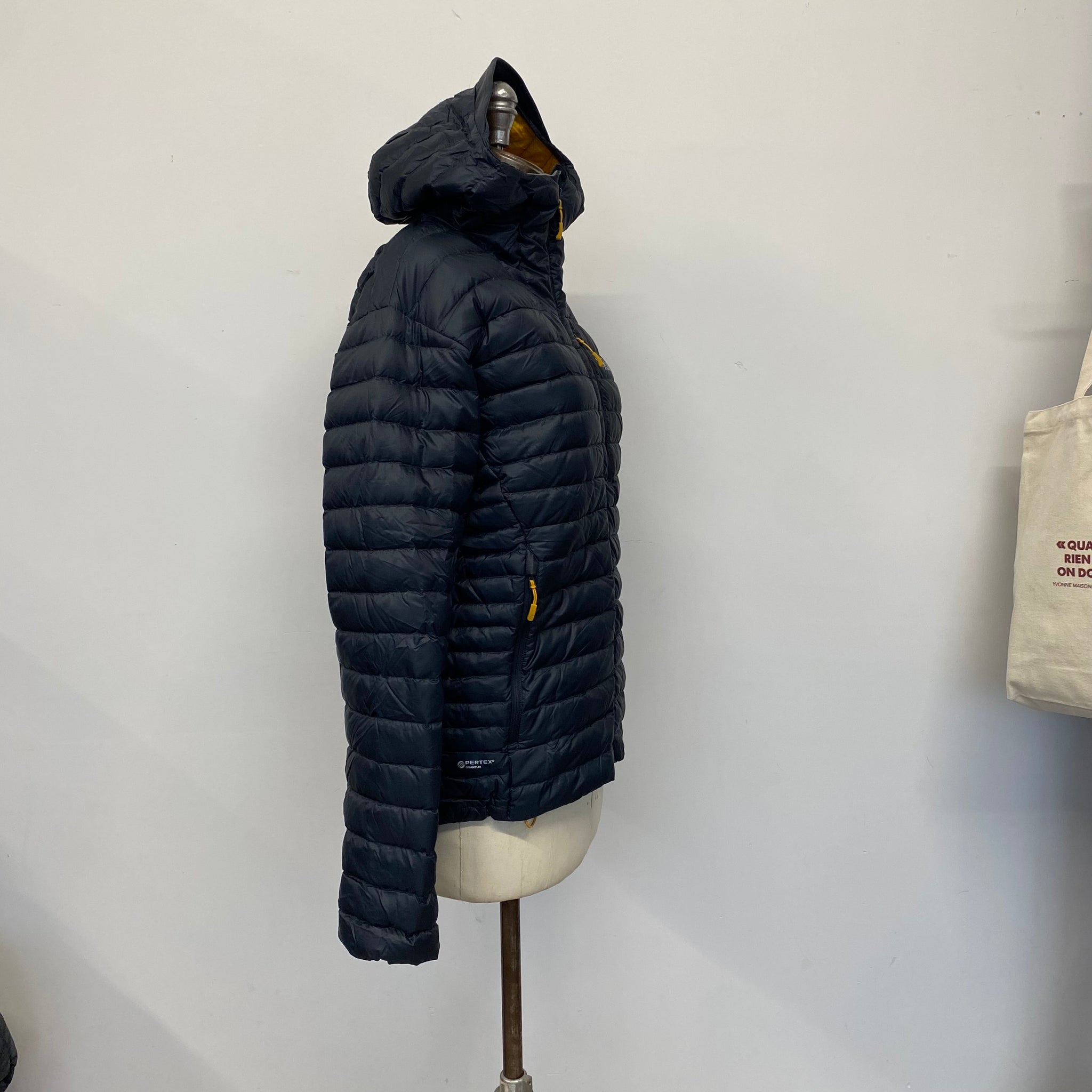 Doublure: nylon 20D recyclé, 38g / m² Isolation : Duvet recyclé, pouvoir gonflant de 700 cuin, finition Nikwax hydrophobe (étanche) Tissu extérieur 100 % polyamide recyclé avec doublure 100 % polyamide recyclé