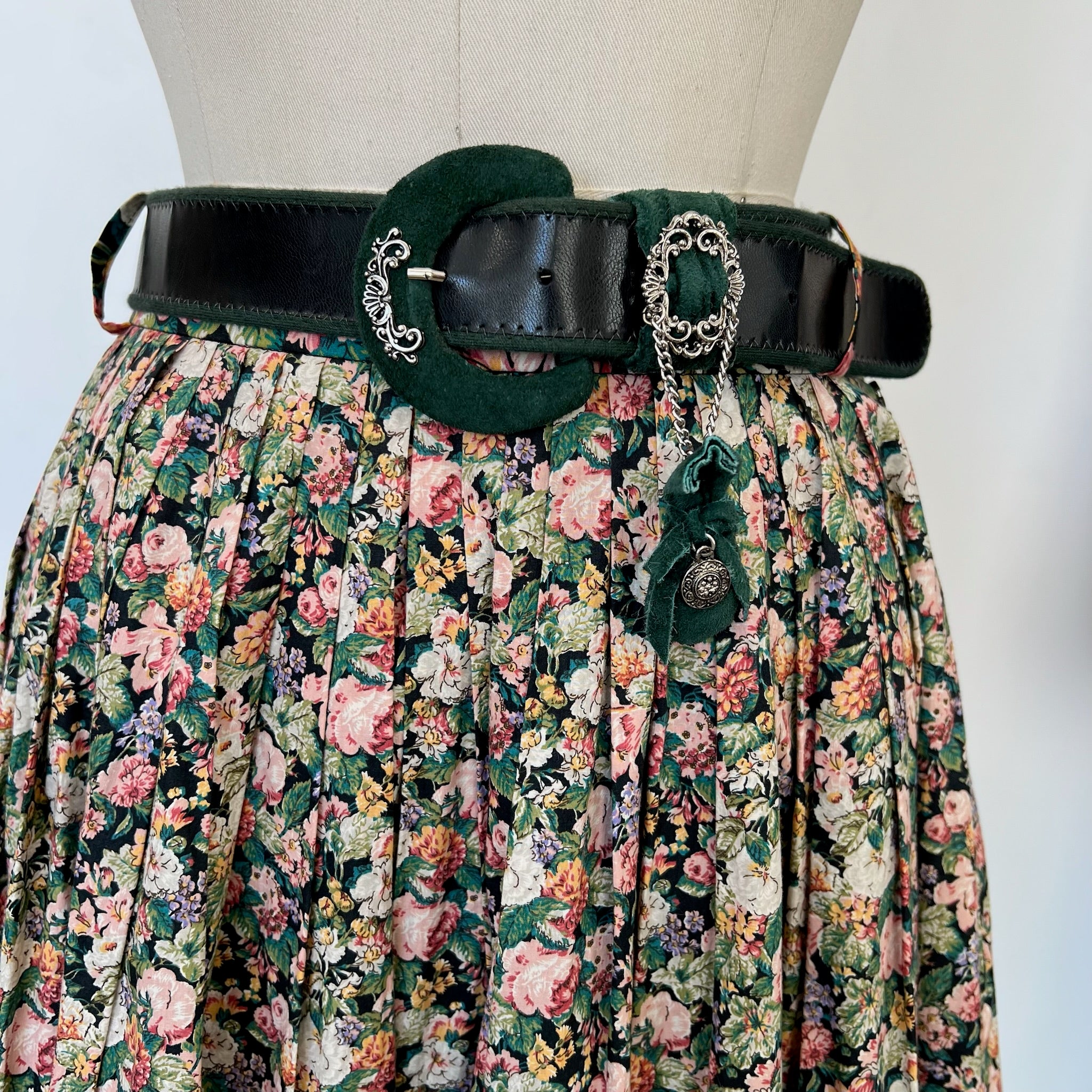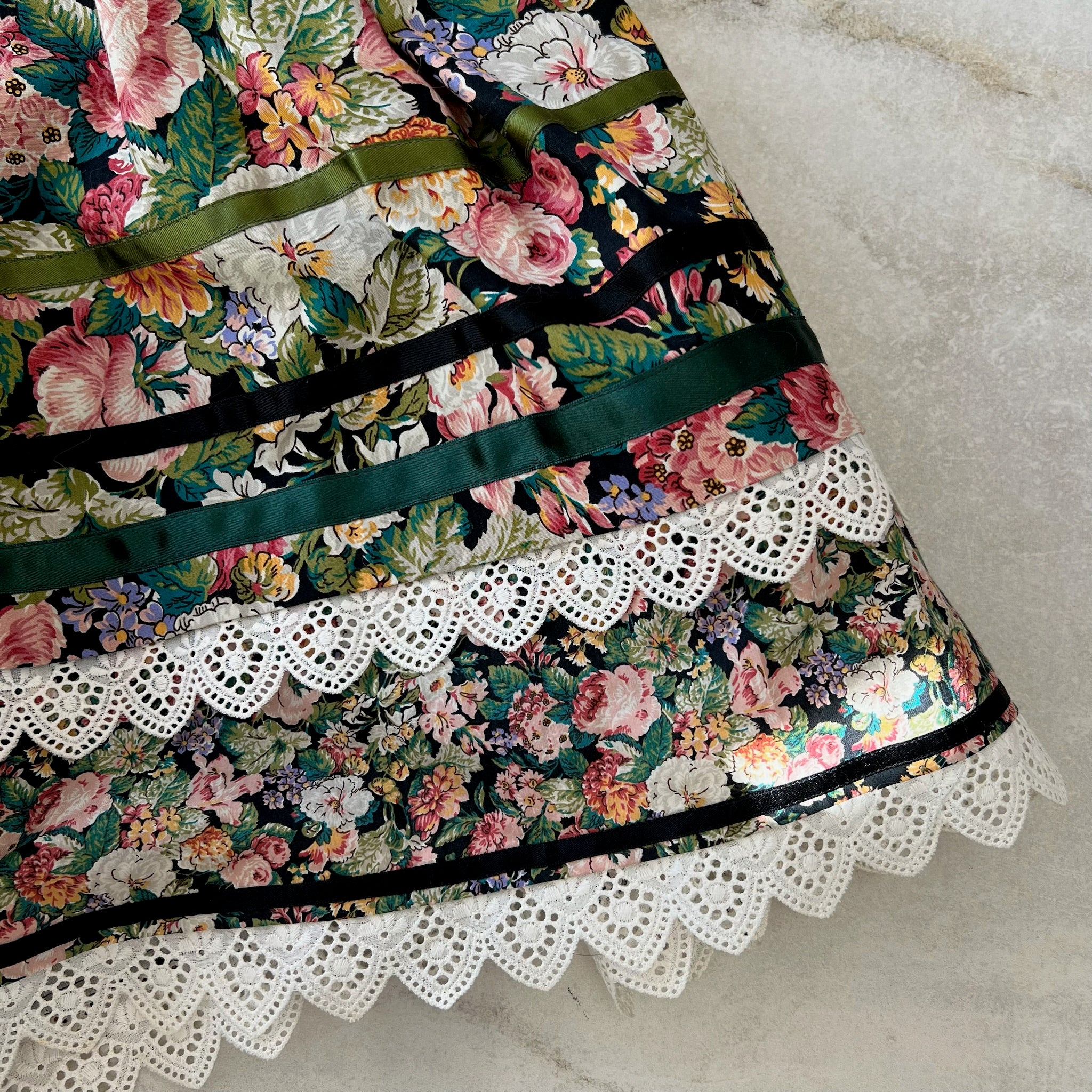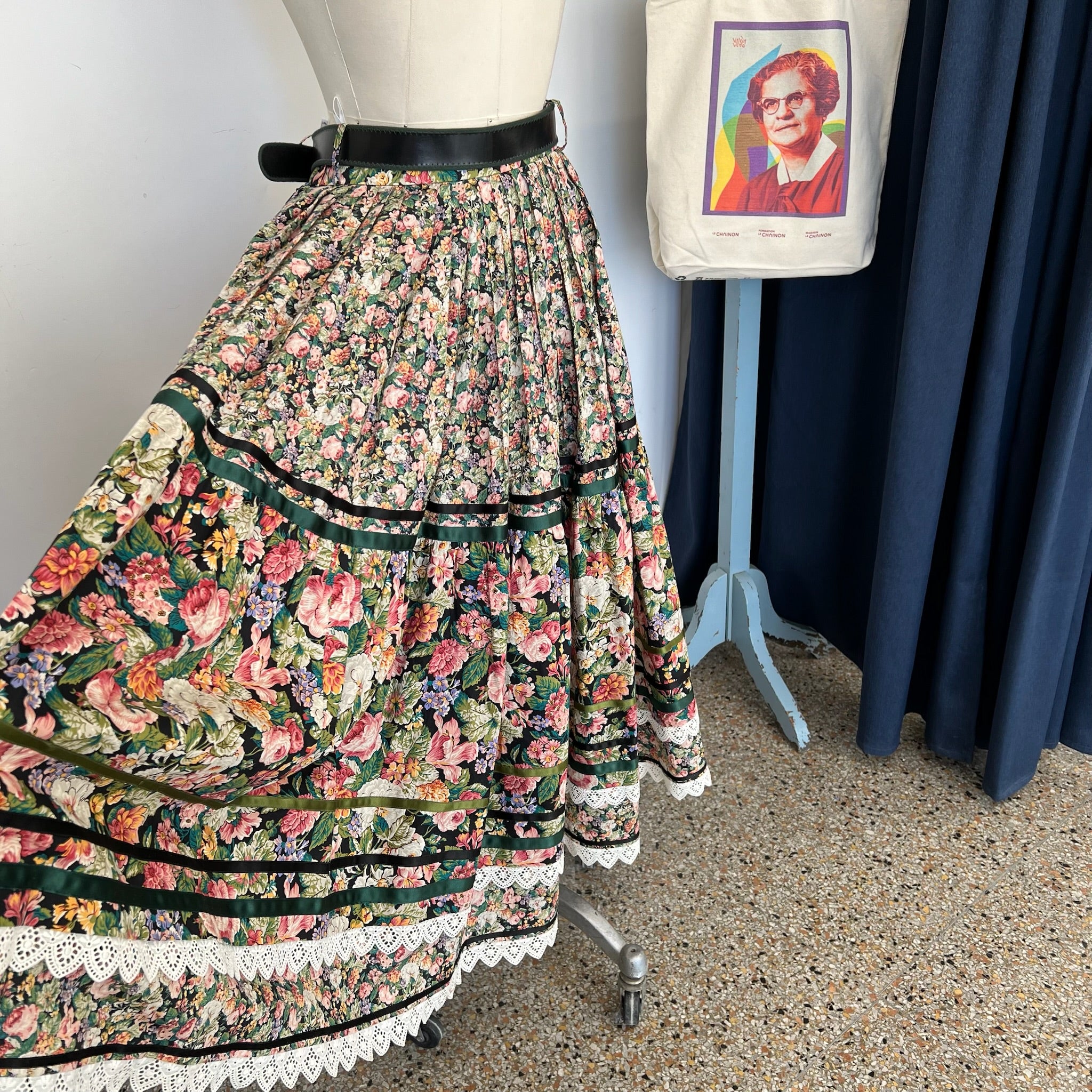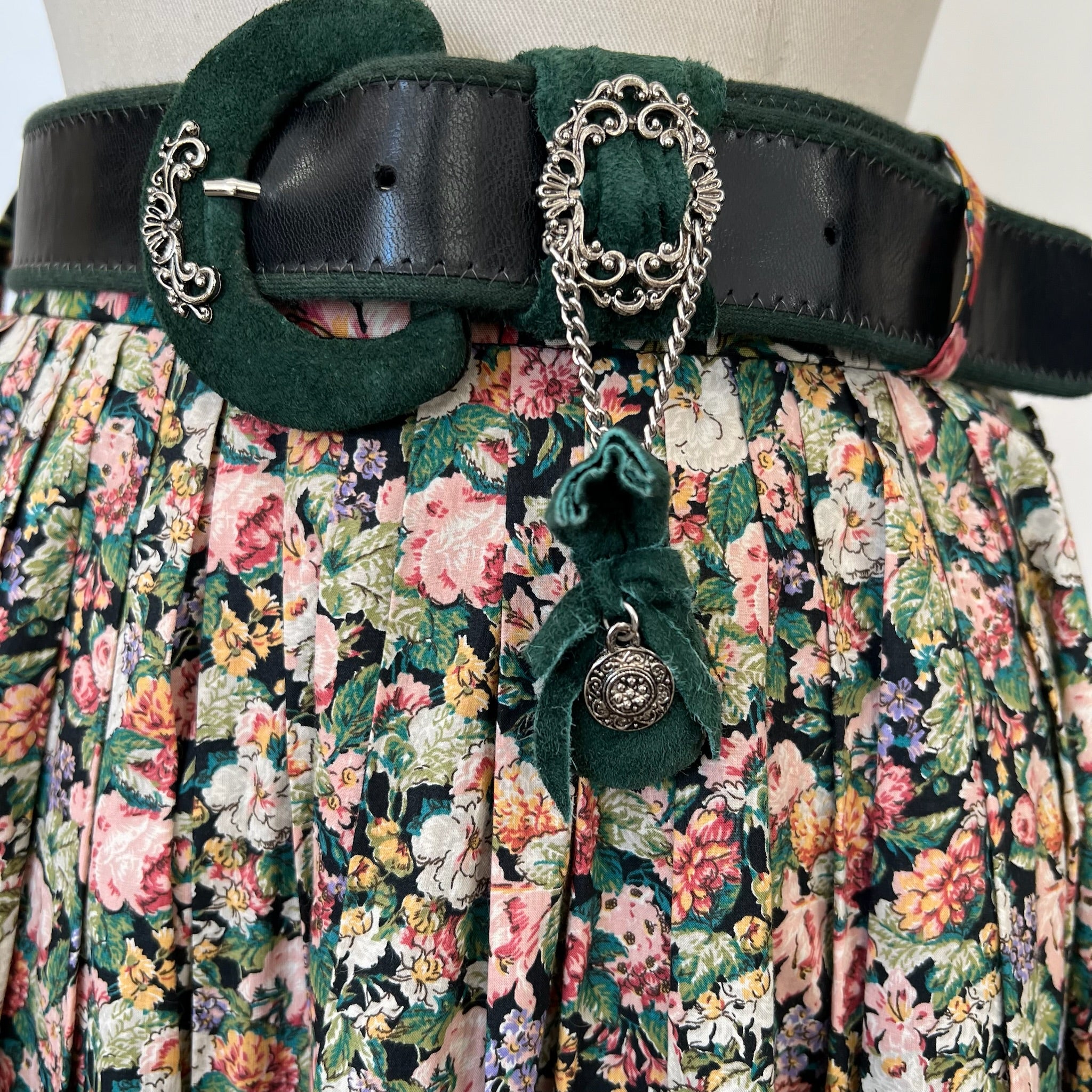 Magnifique jupe fleurie en coton de la marque Star. Avec mince doublure, tissu plissé orné de rubans assortis, avec majestueuse ceinture qui se retire, orné de décoration argentées et d'une petit breloque fausse pochette. Avec fermeture éclair sur le coté.