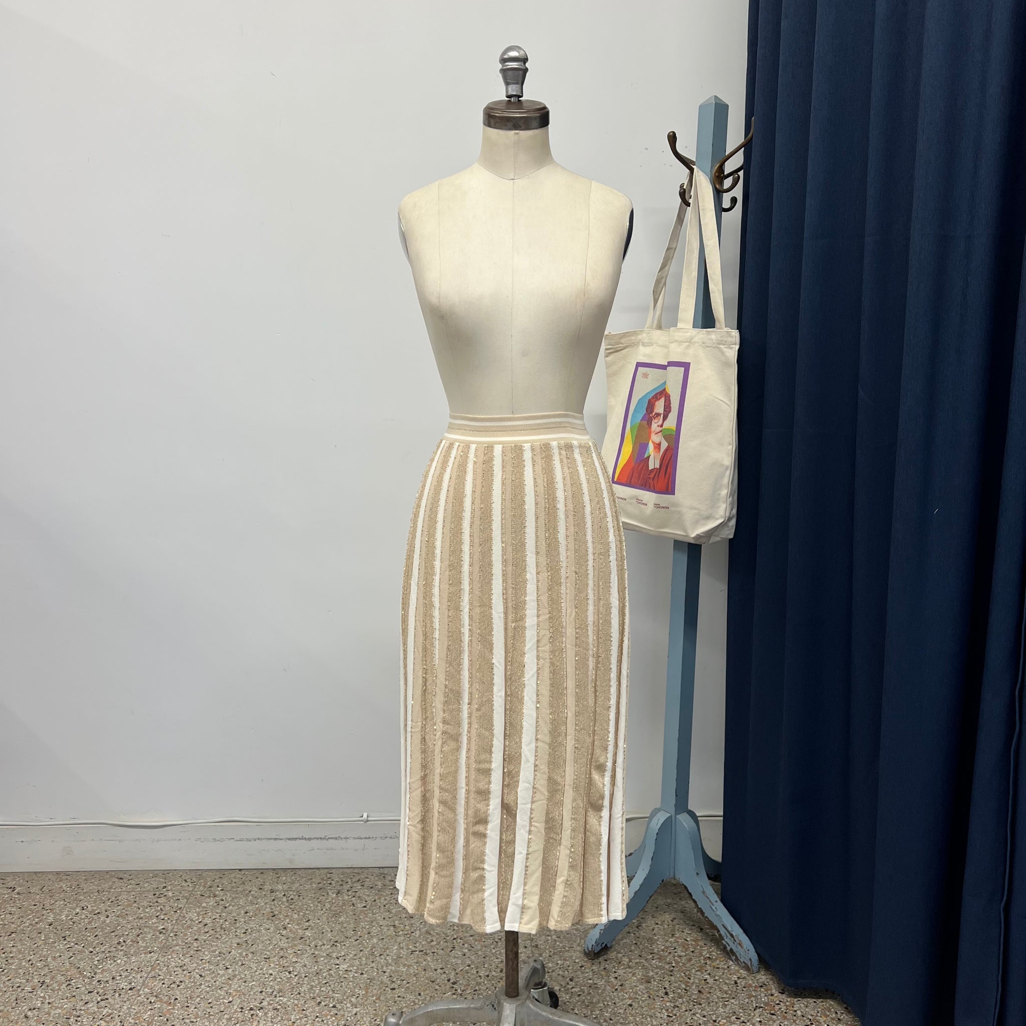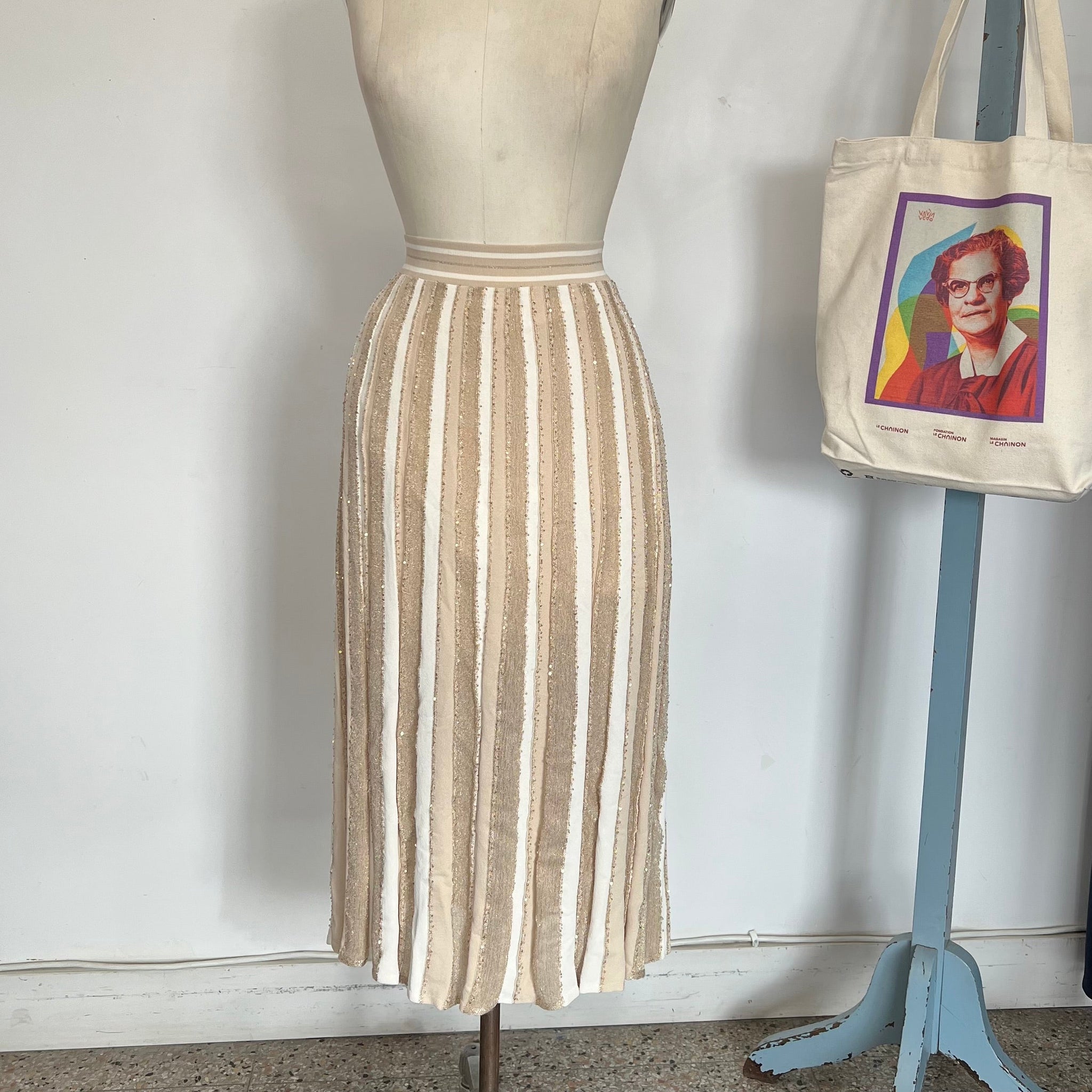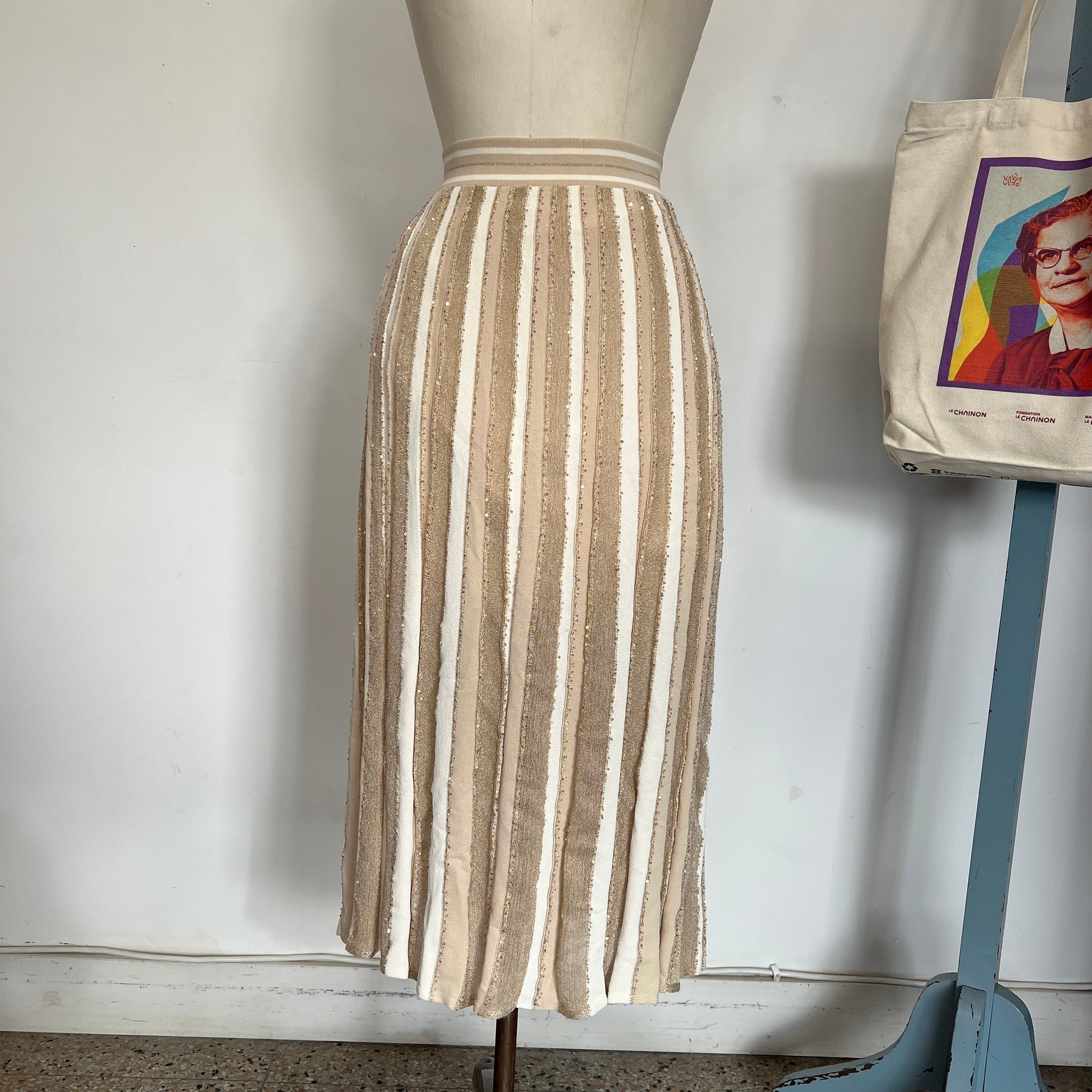 Jupe scintillante de la marque D. Exterior. Avec lignes en tricot léger (légèrement transparent), d'autres ornées de paillettes dorées. Avec doublure, bande élastique à la taille. D'une valeur de 990$.