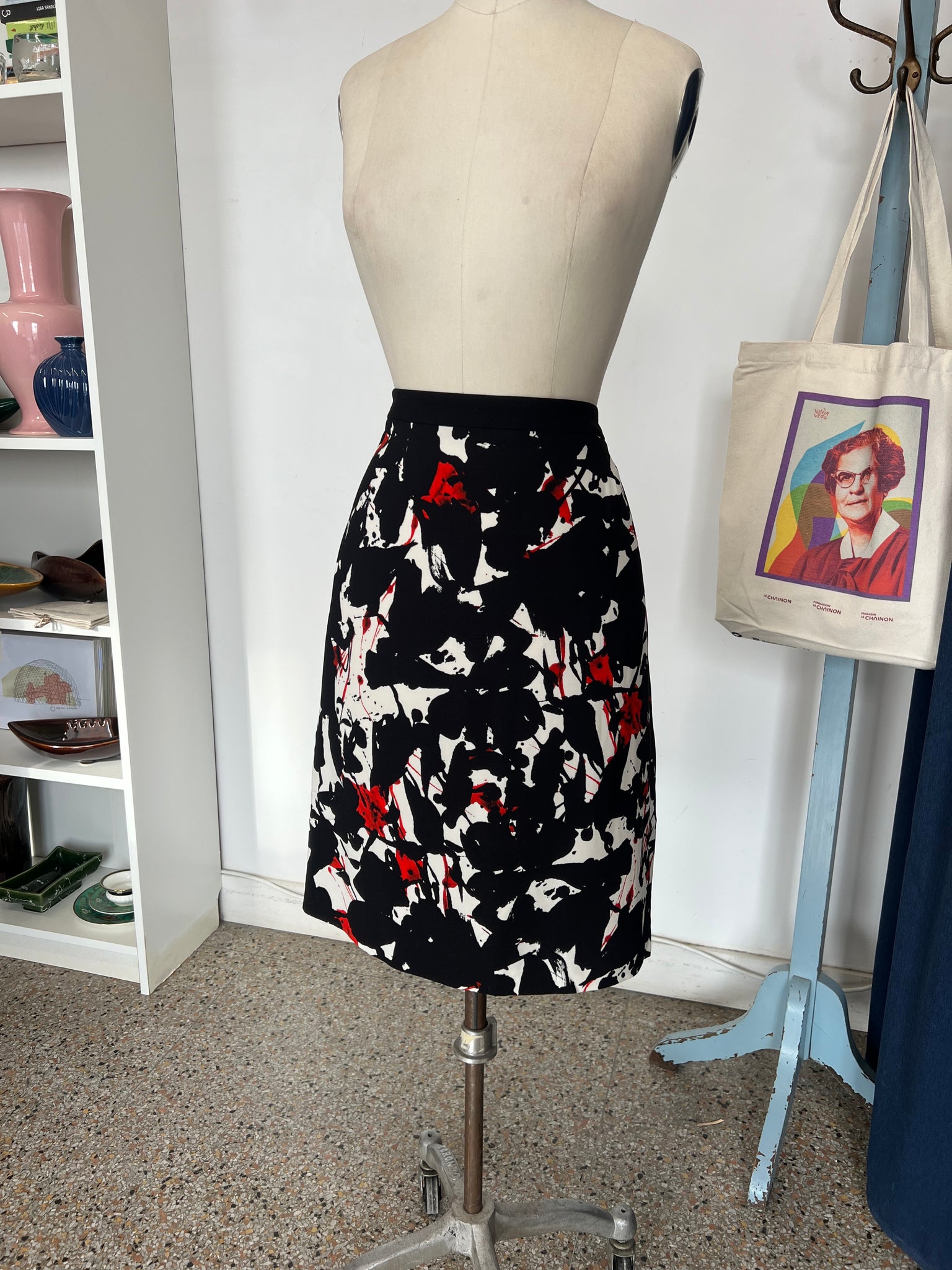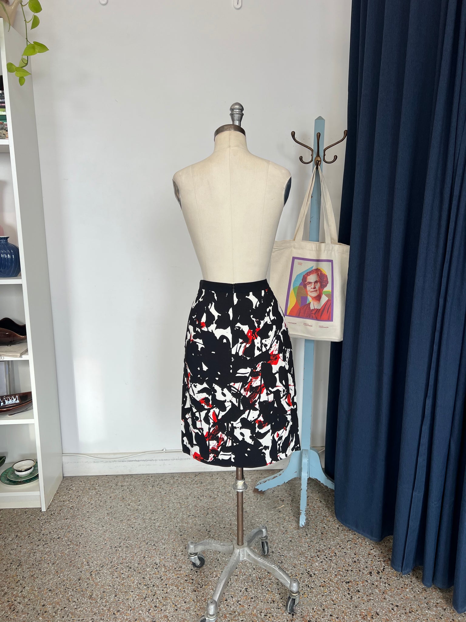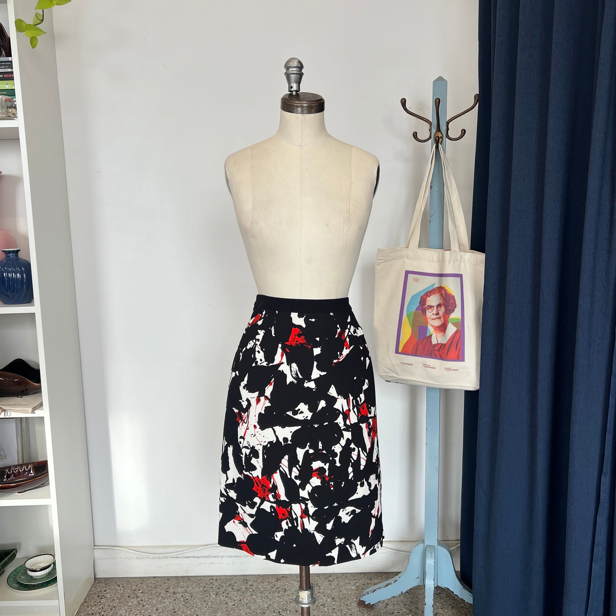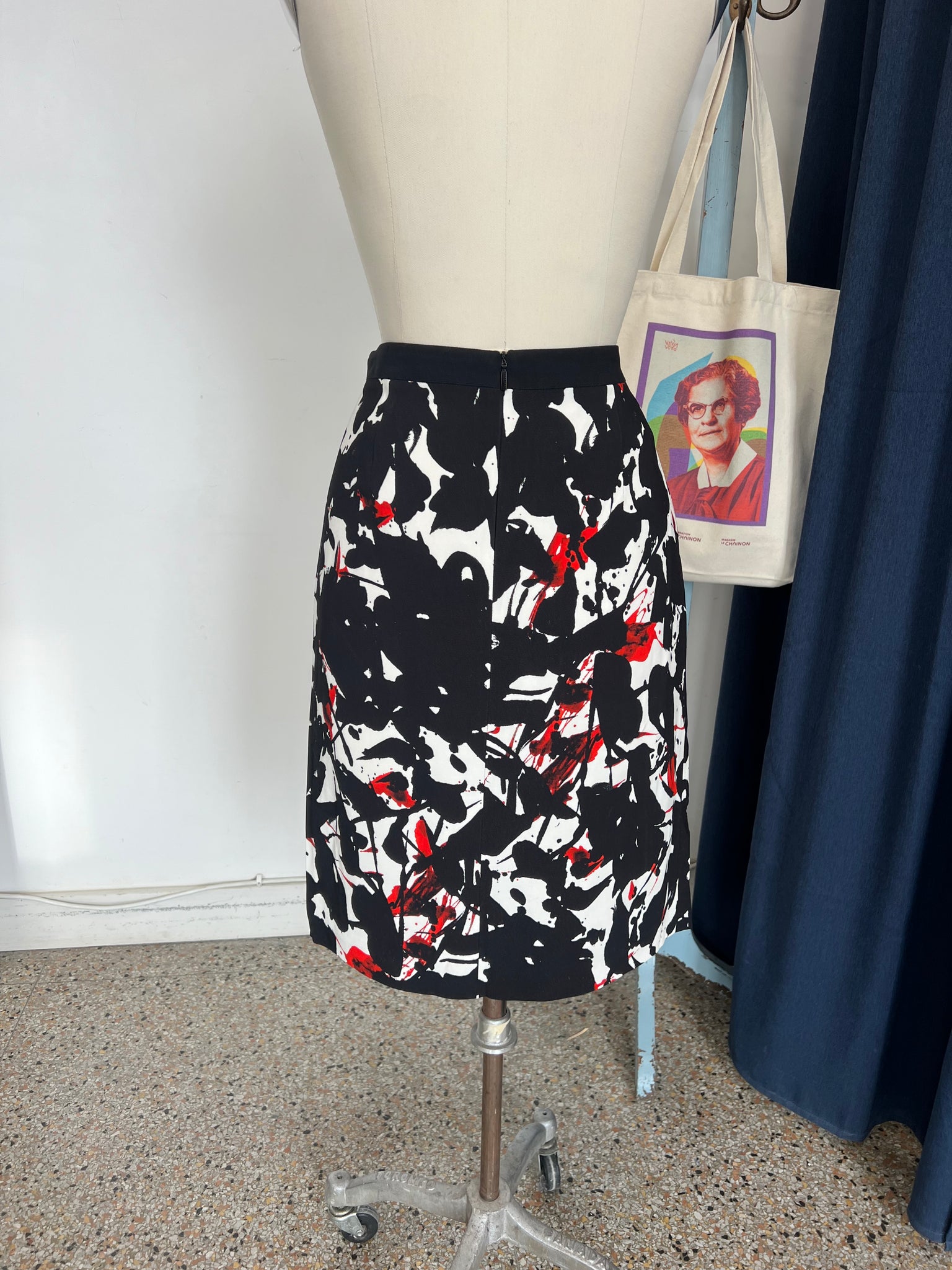 Jupe de la marque Hugo Boss. Avec motifs originaux imitant de la peinture. Fermeture éclair au milieu au dos. Mince doublure,