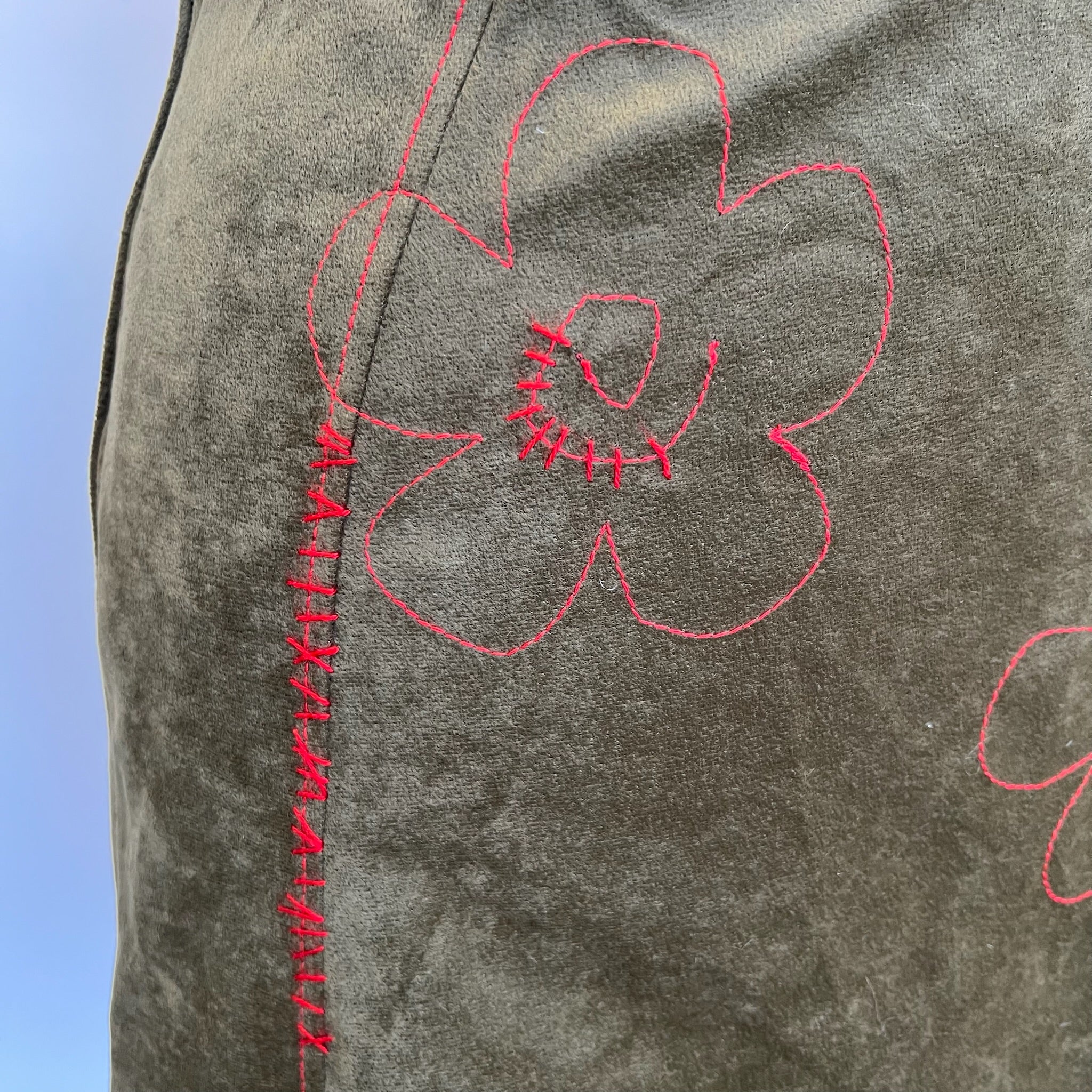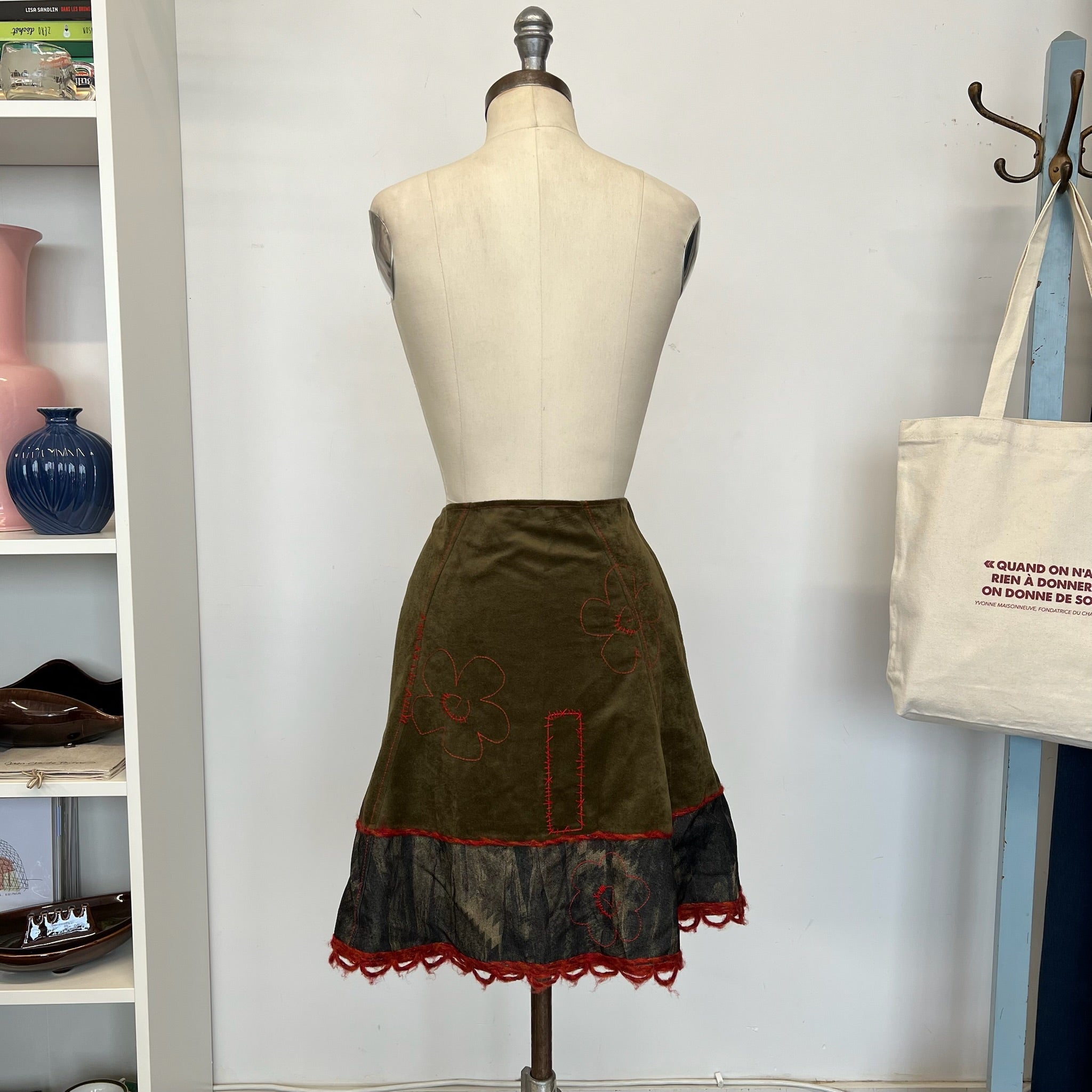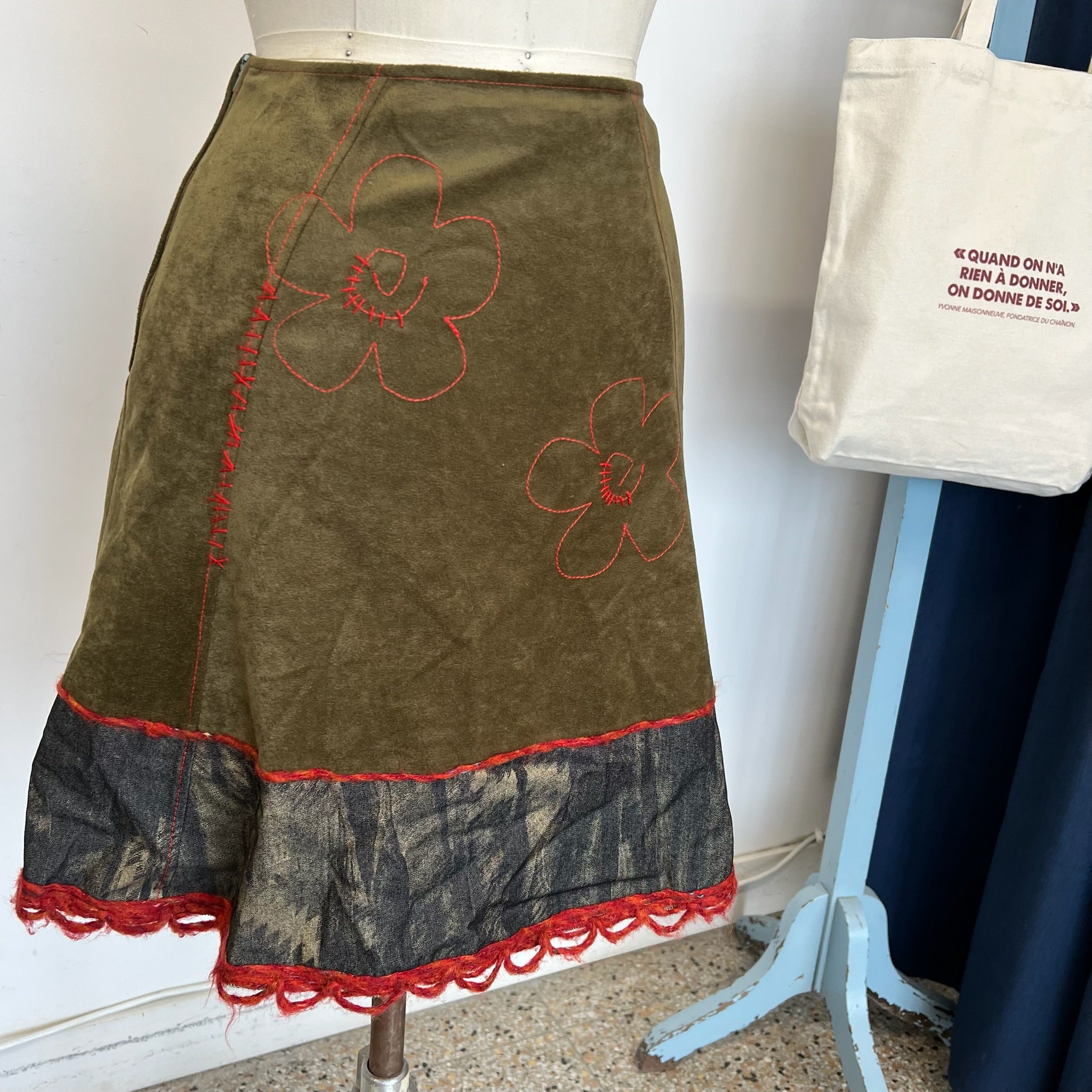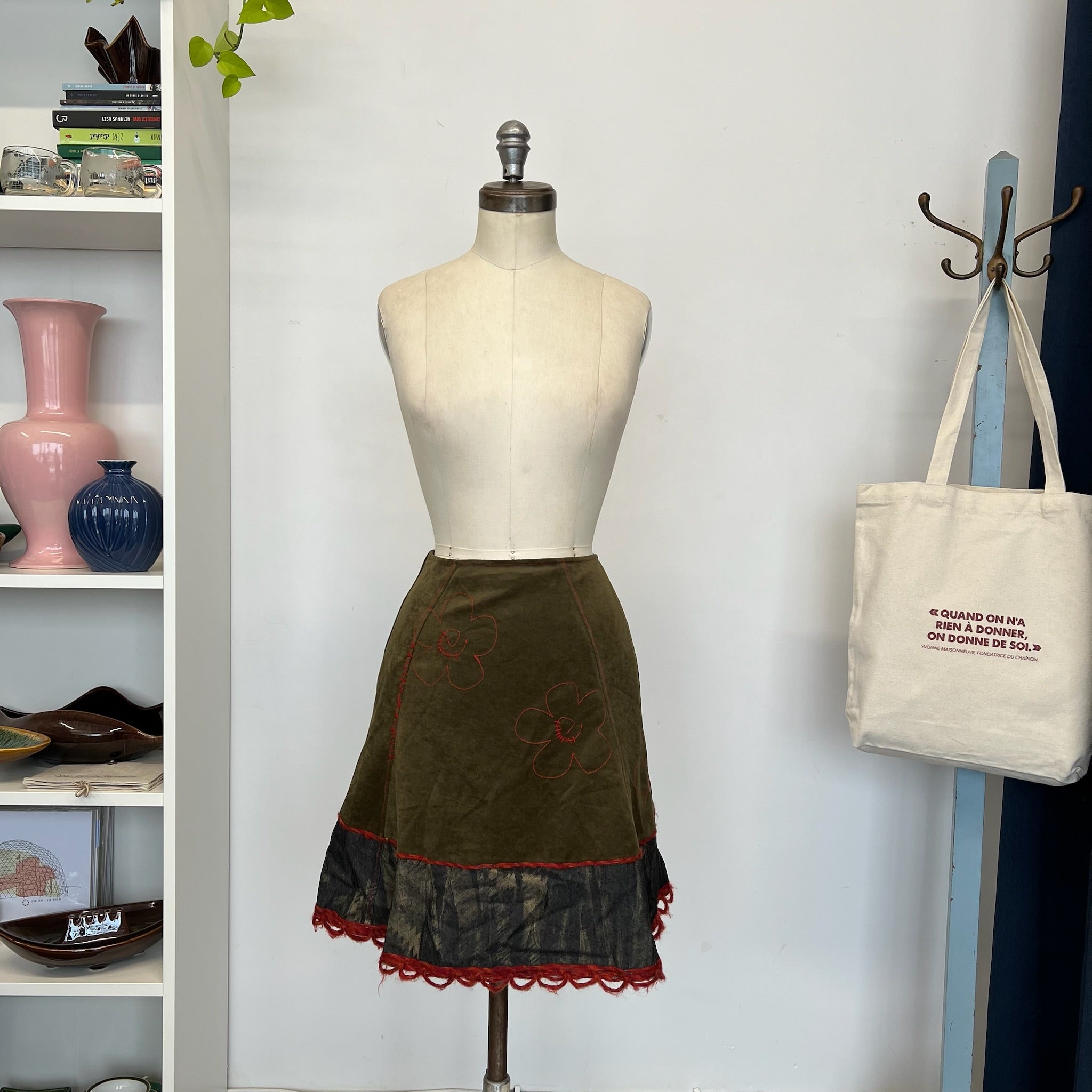 Jupe vintage de la marque québécoise Main Gauche. Avec fermeture éclair sur le coté, mince doublure. Tissu unique garni de décorations florales et texturées.