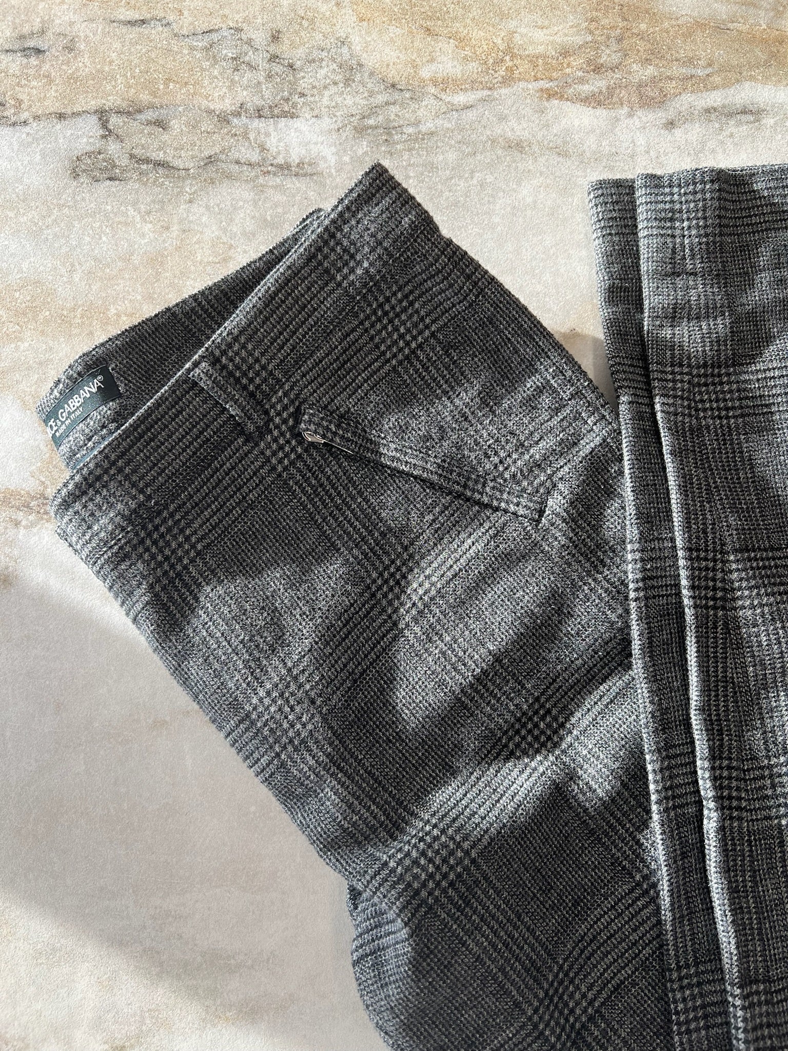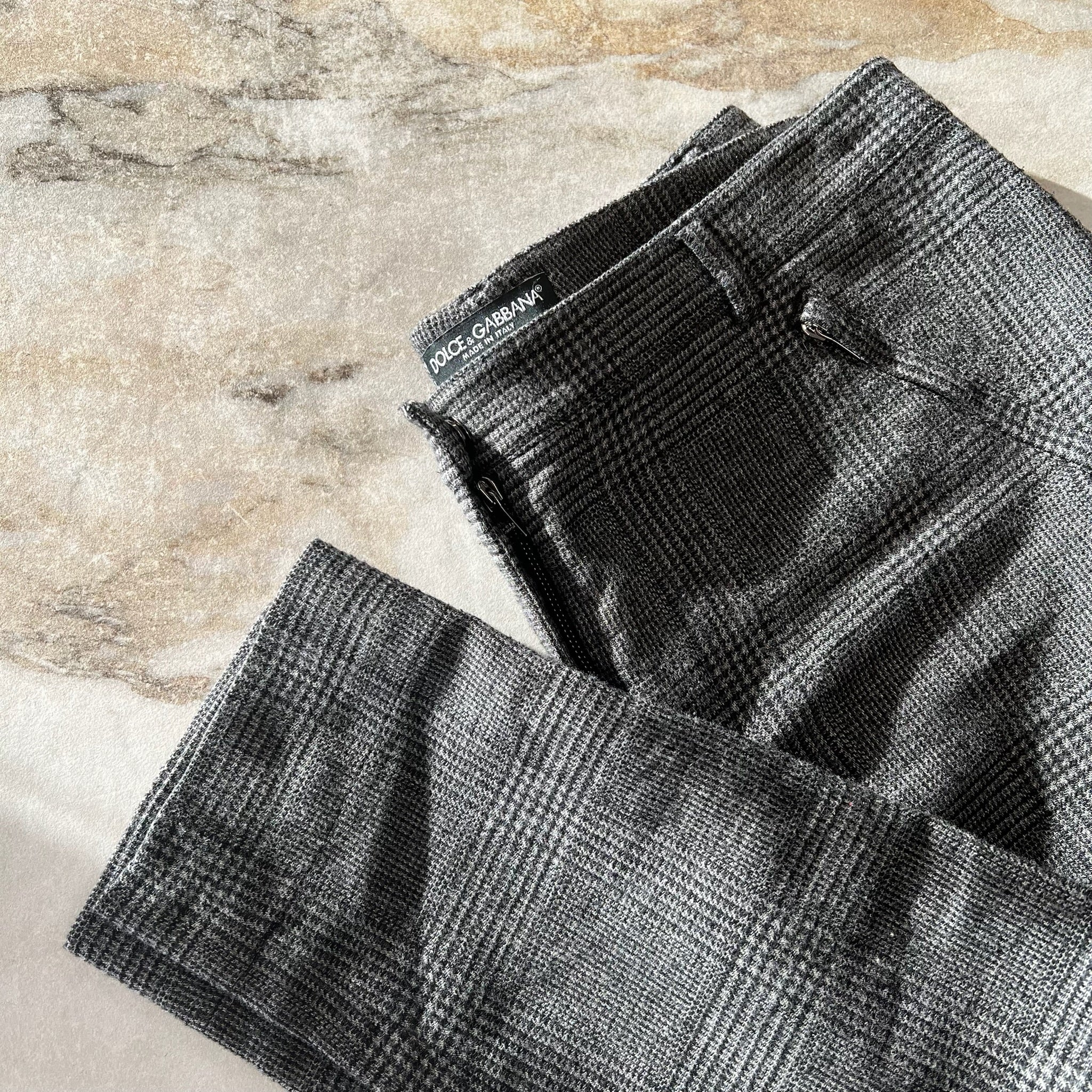 Pantalon à jambe droite de la marque Dolce & Gabbana. Taille régulière, petites poches à fermeture éclair. Avec imprimé carreauté, ganses pour la ceinture.