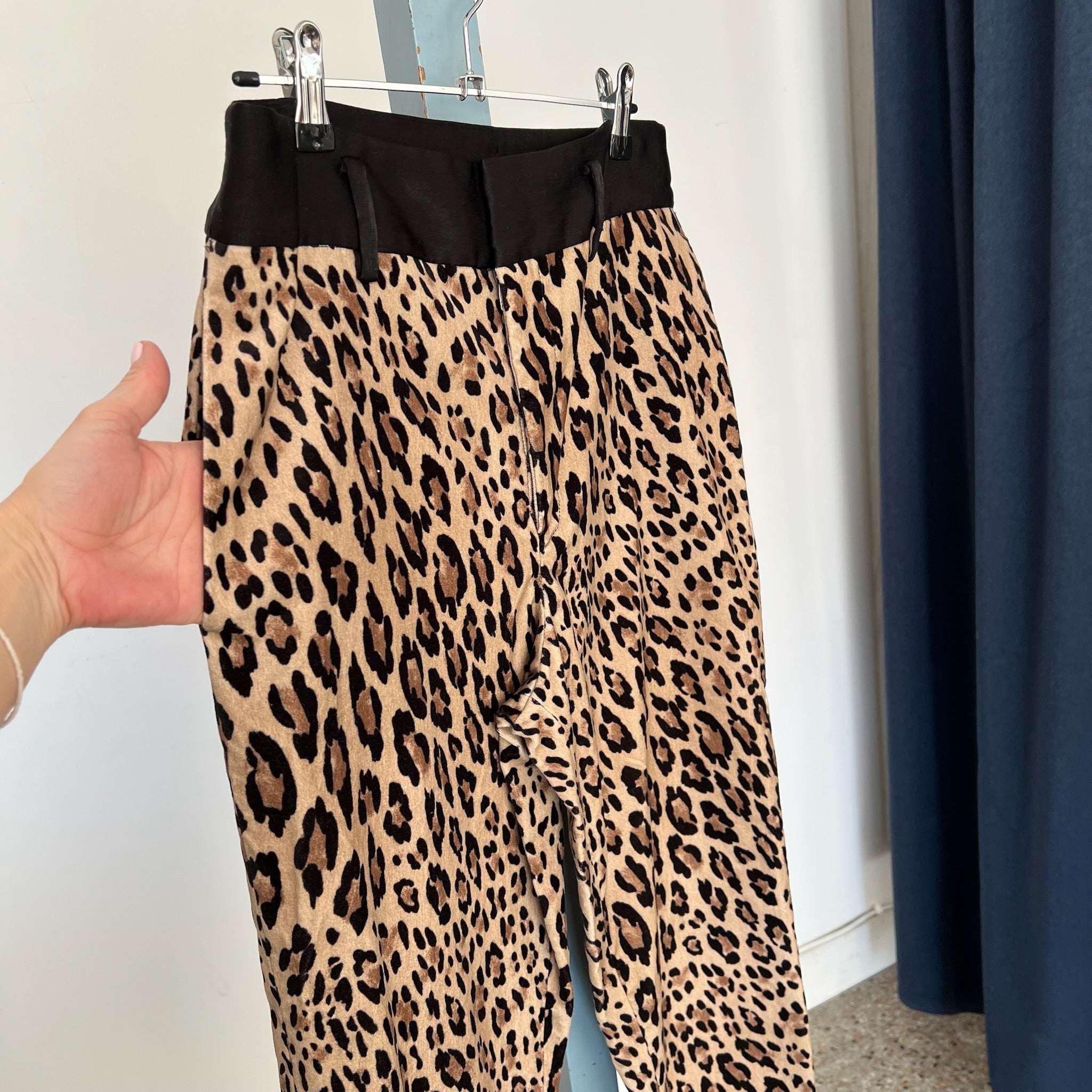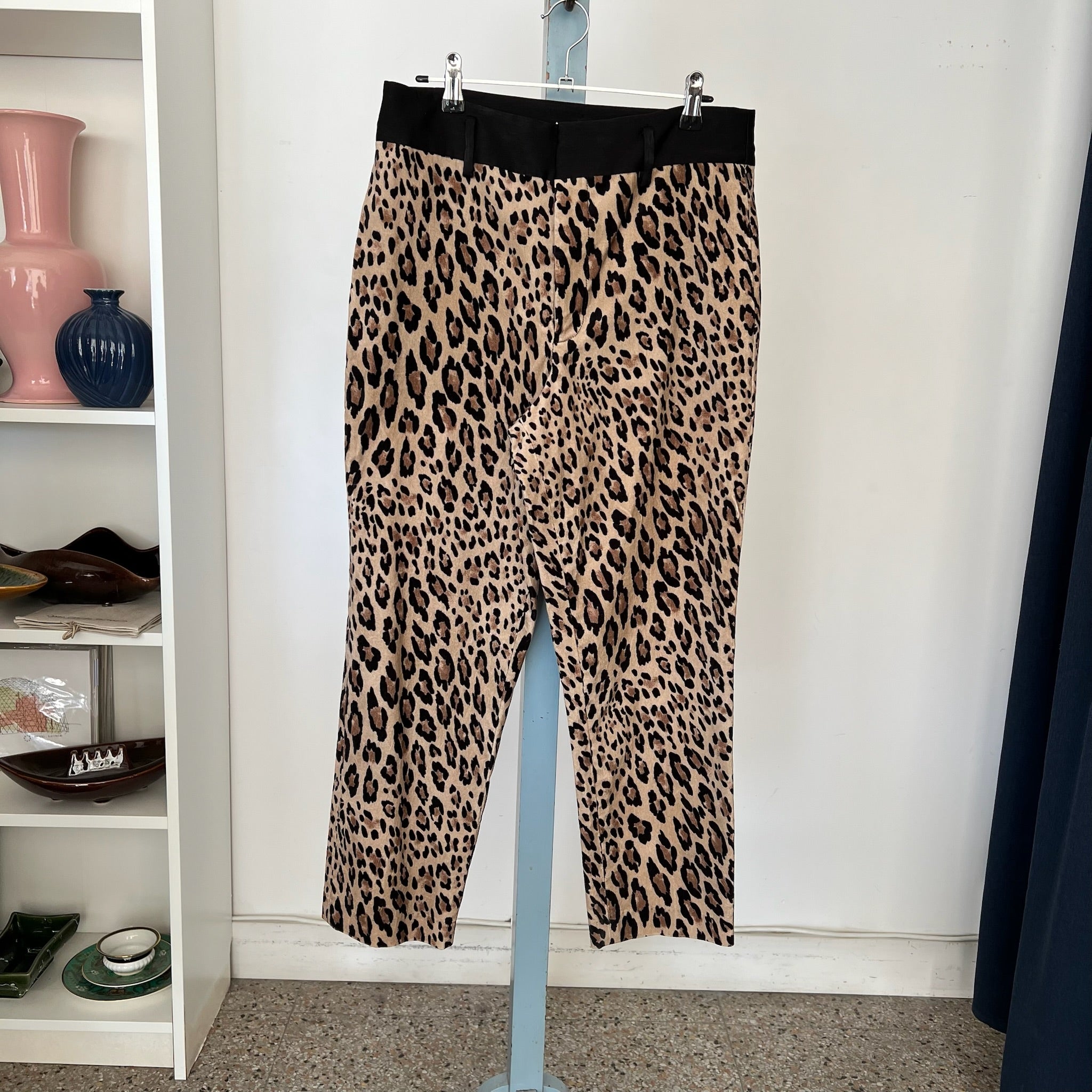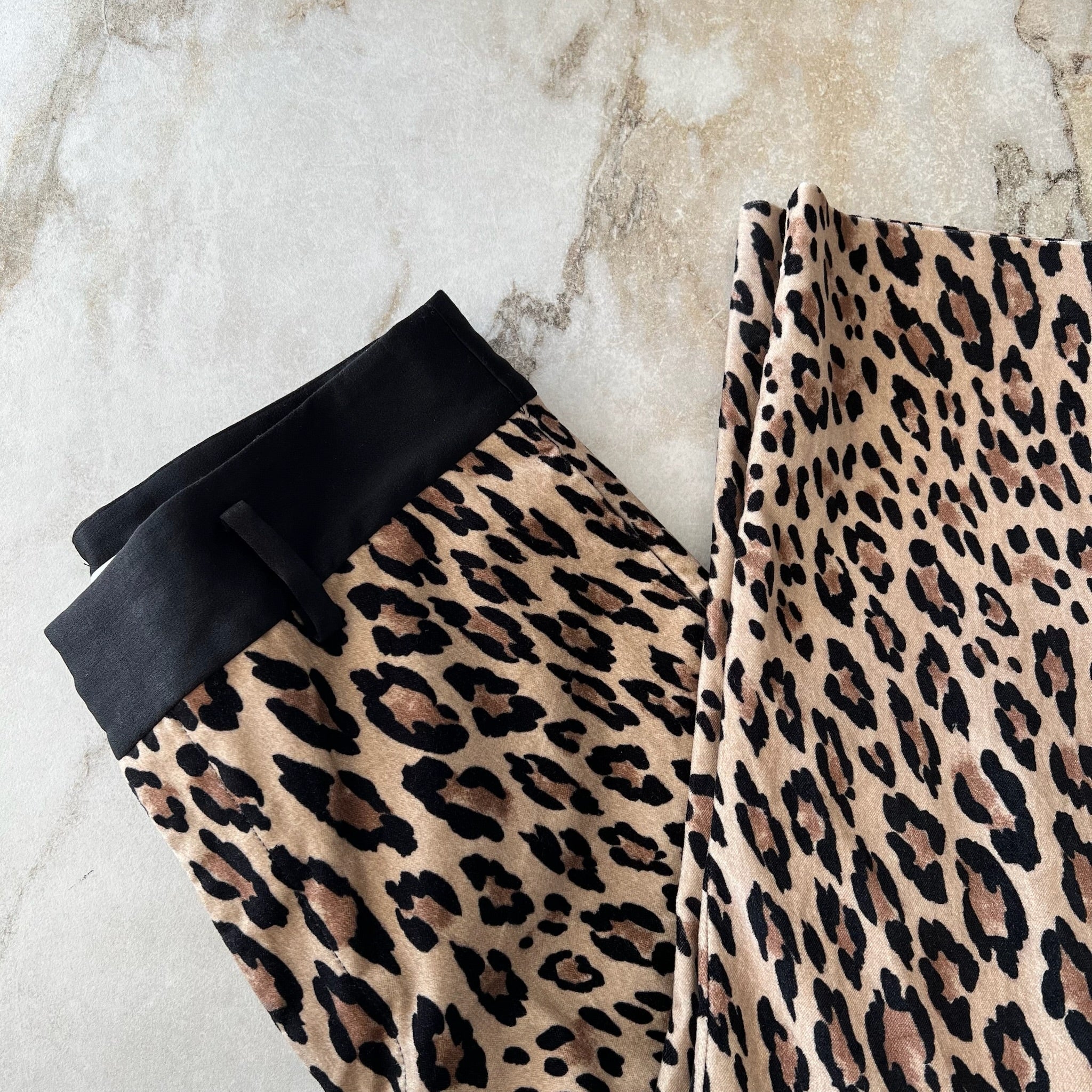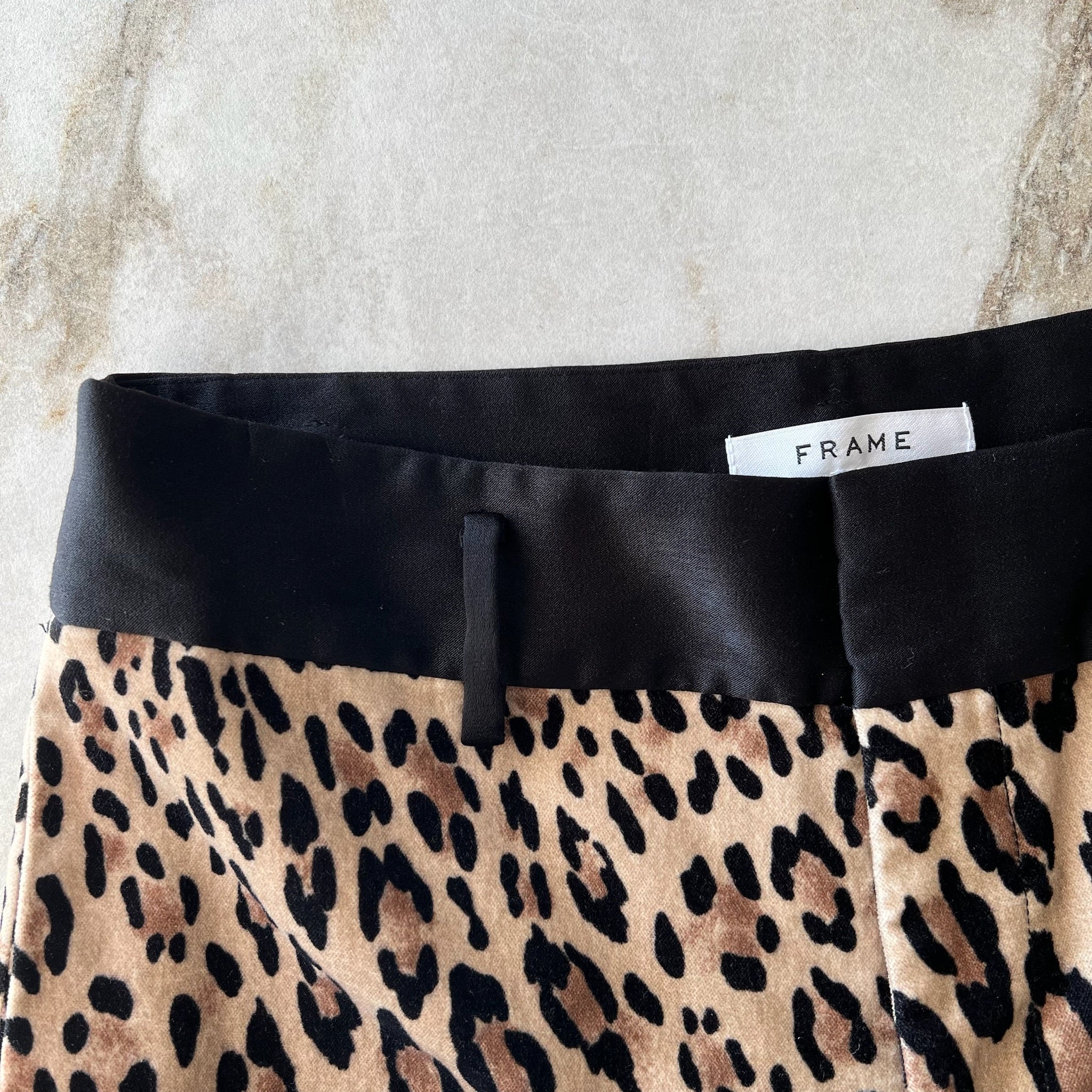 Pantalon à imprimé léopard de la marque Frame. Avec bande noire à la taille, poches latérales, tissu velours doux, coupe décontractée.