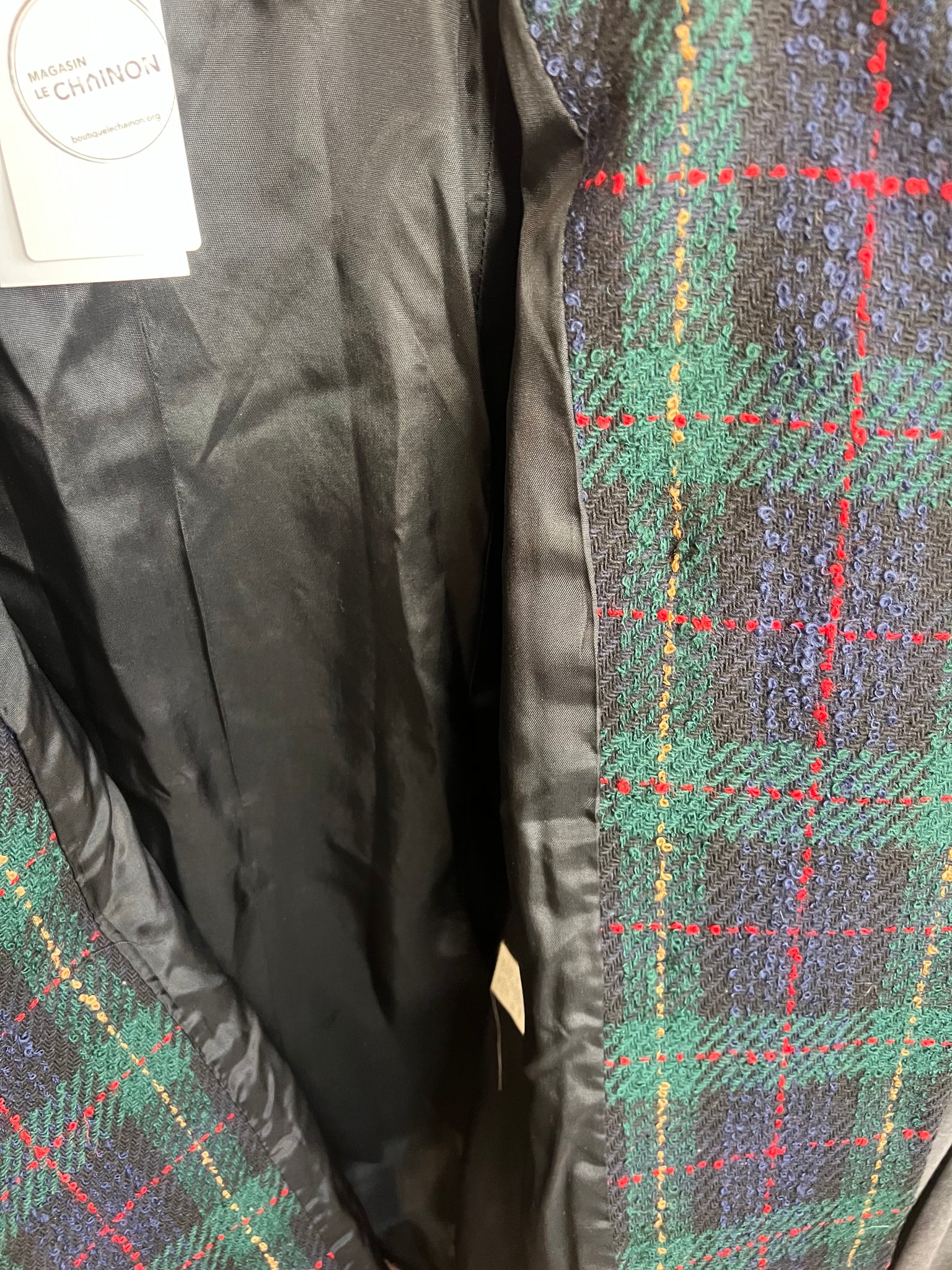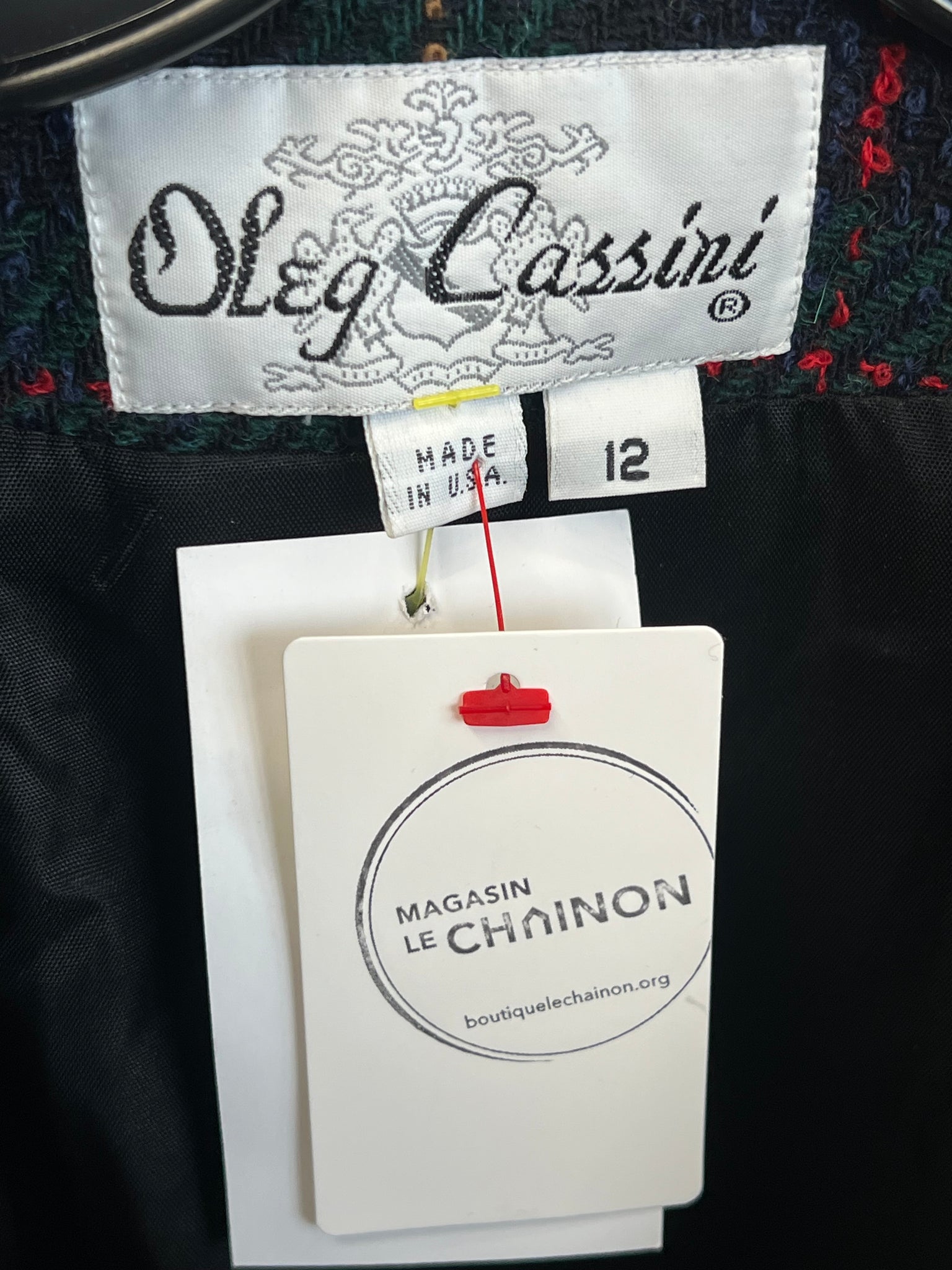 Ensemble vintage à carreaux de la marque Oleg Cassini. Tissu épais avec doublure. Jupe droite avec poches latérales et fermeture éclair. Veston agencé avec boutons dorés et col de velours, avec imposantes épaulettes intégrées, deux poches à rabat verticales.