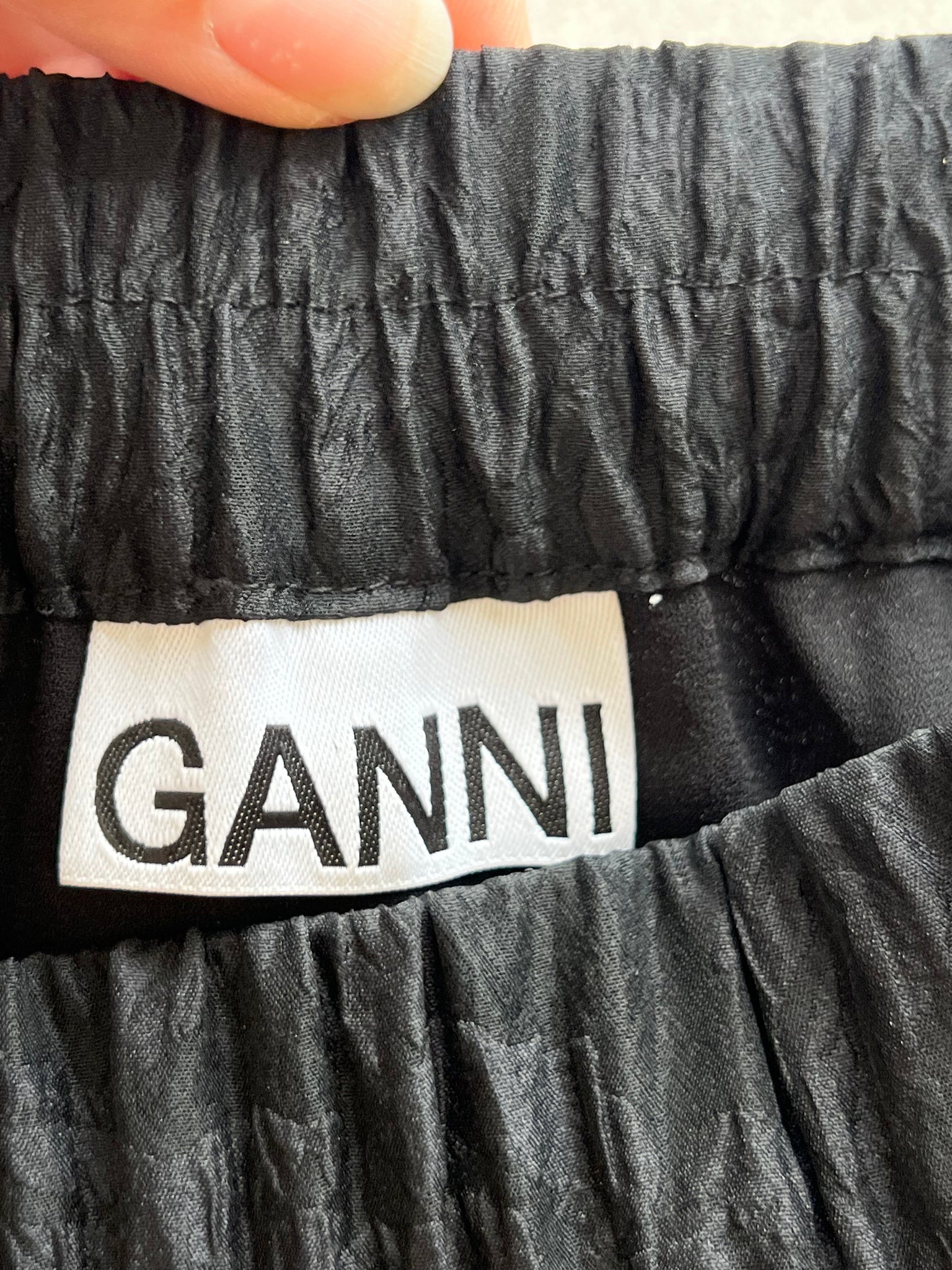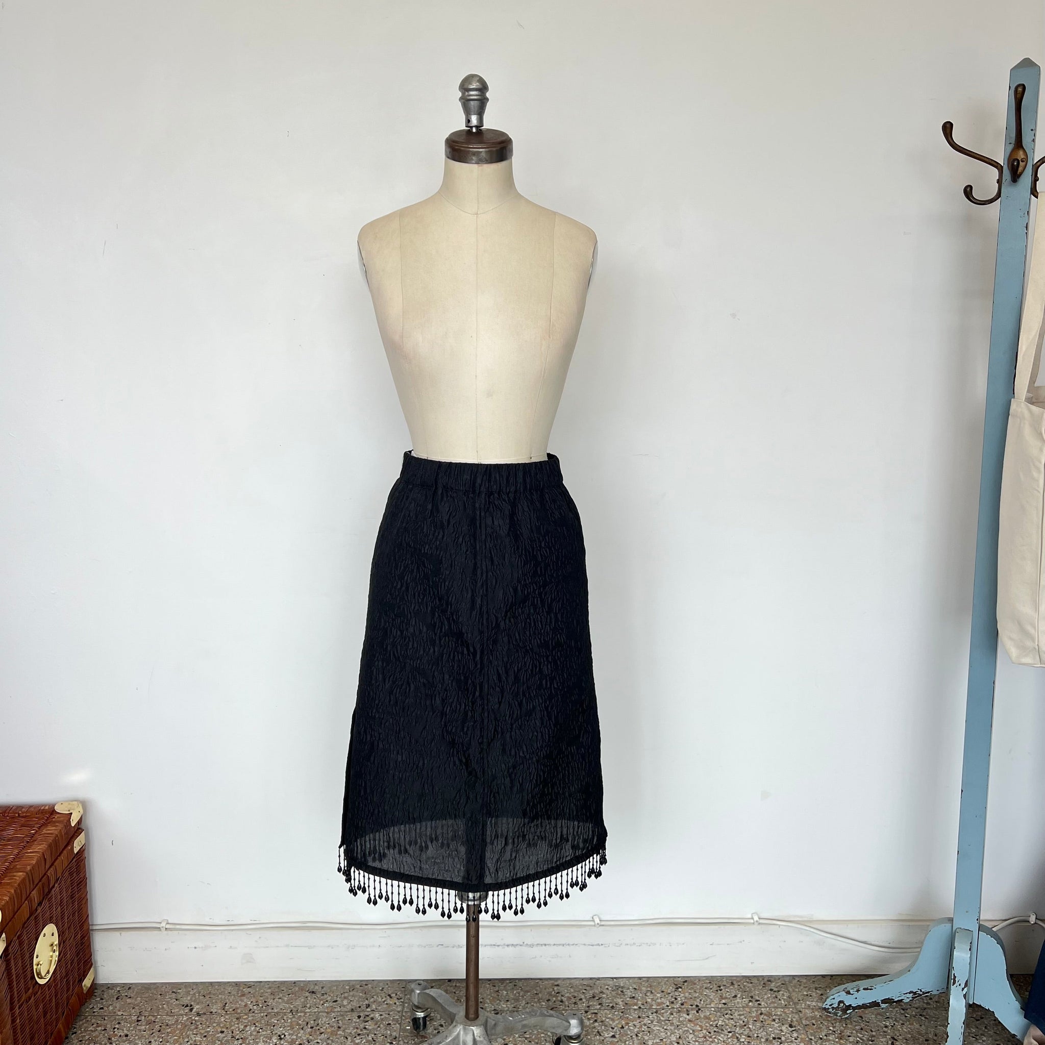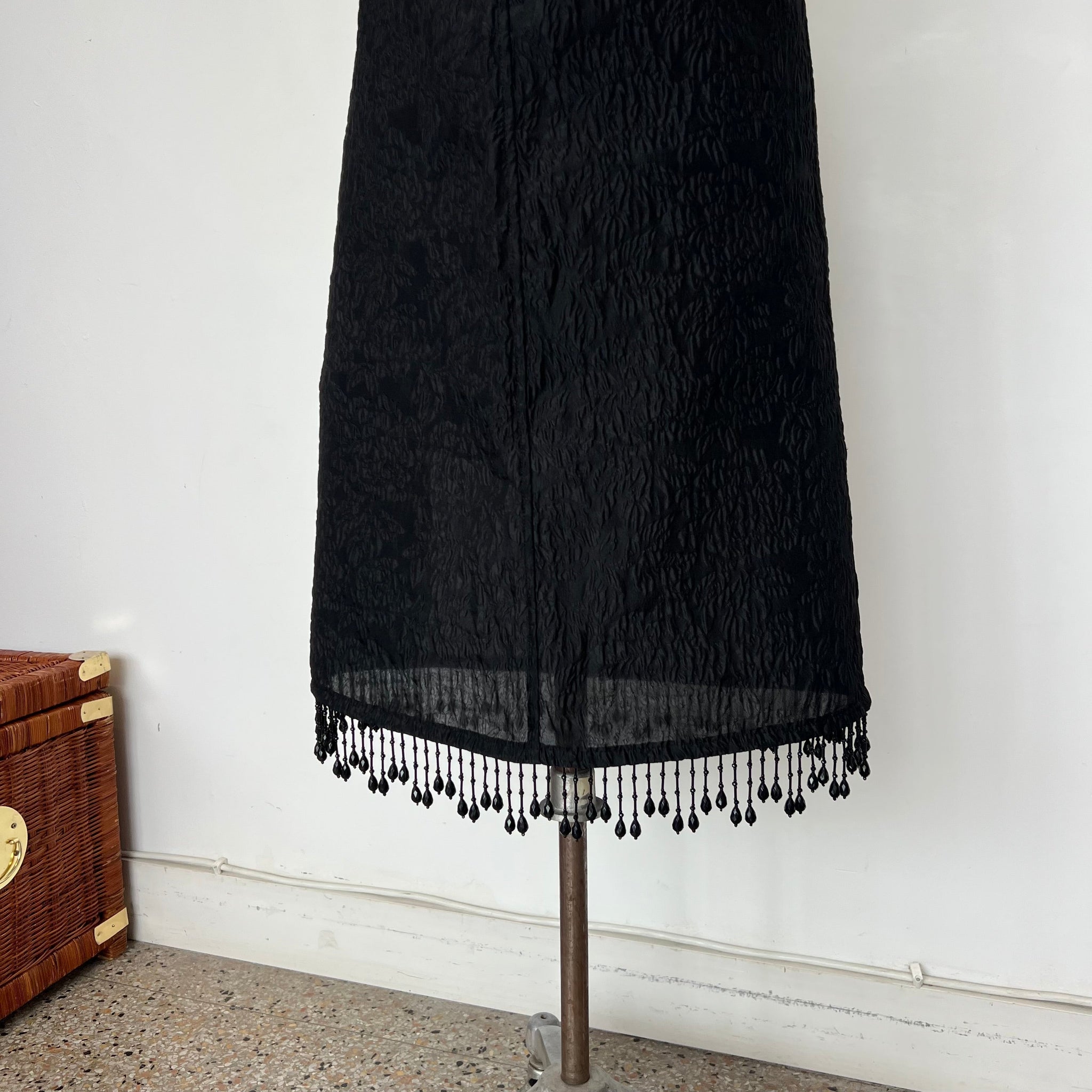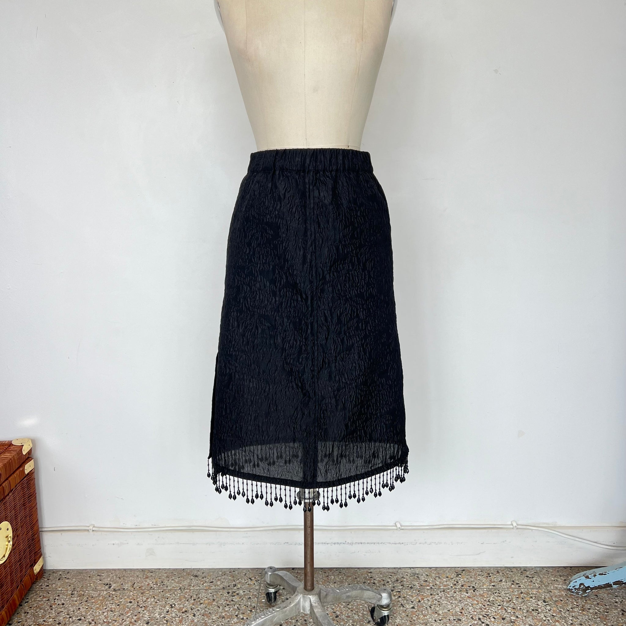Jupe mi-longue noire à frange et à perles. Jupe en cloqué de polyester recyclé et nylon. Motif fleuri en tissu jacquard sur l'ensemble.