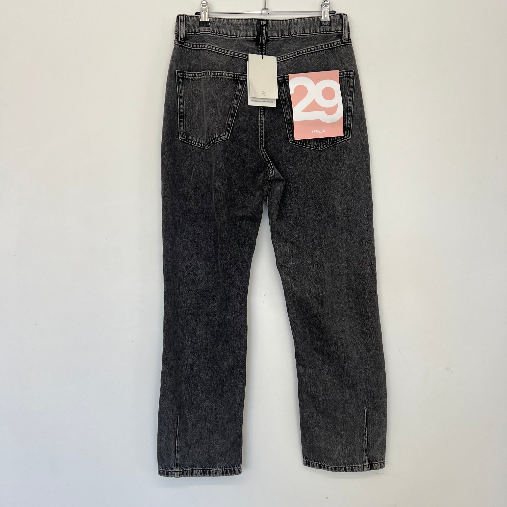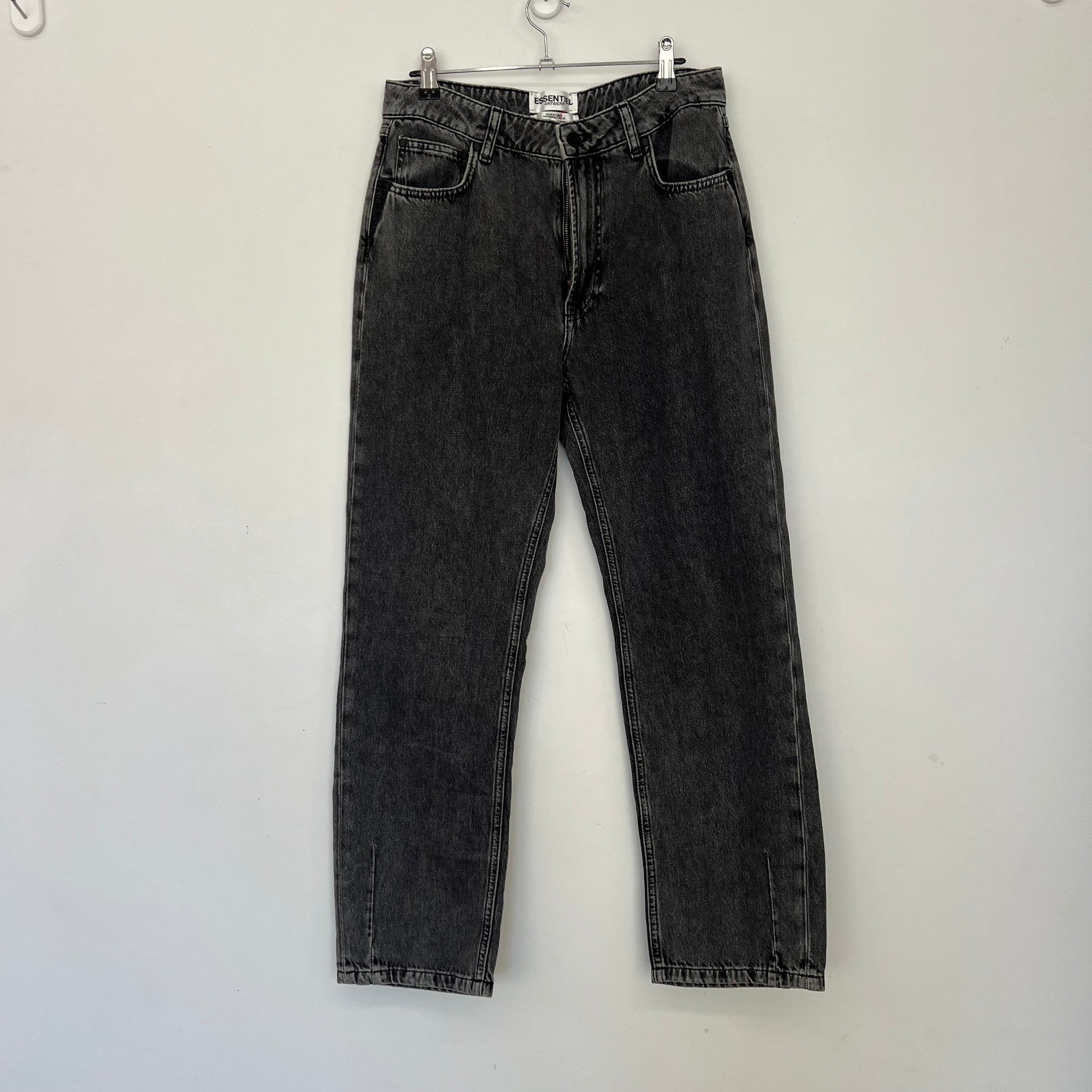 Pantalon jeans de la marque Essentiel Antwerp. Coupe droite. En denim non-extensible. Effets délavé sur l'ensemble. Détail de couture verticale sur l'avant-côté en bas de chaque jambe. Taille haute, passants de ceinture, braguette: fermeture éclair et bouton. D'une valeur de 350$.