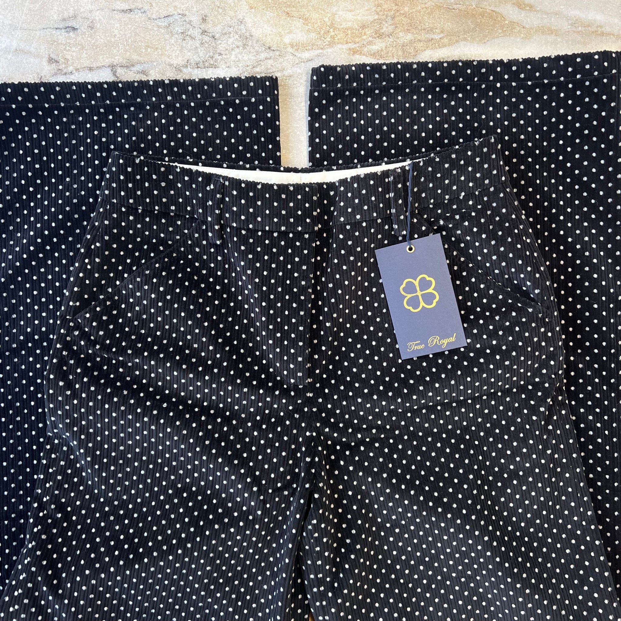 Pantalons noirs texturés à pois blancs en tissu velours côtelé, avec poches. S'attache avec fermeture éclair, ganses pour ceinture. Taille haute, jambe large. D'une valeur de 495$.