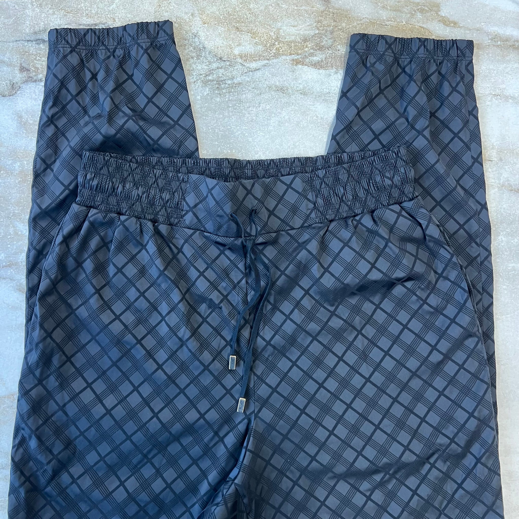 Pantalon de la marque de skinwear Wolford modèle Jyn Trousers criss cross pattern - satin optic. Tissu mince non doublé. Avec cordon ajustable à la taille et poches latérales. Élastique à la cheville. D'une valeur de 323$