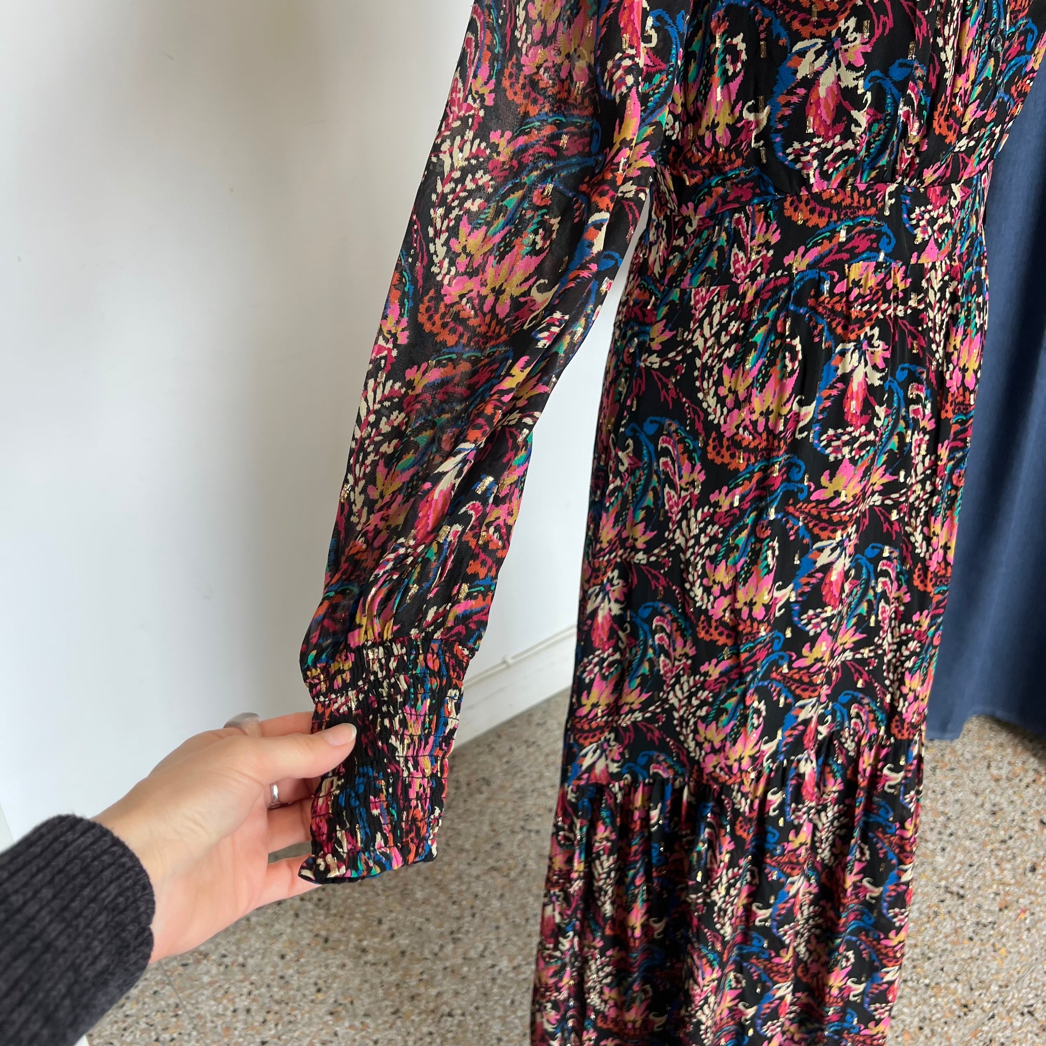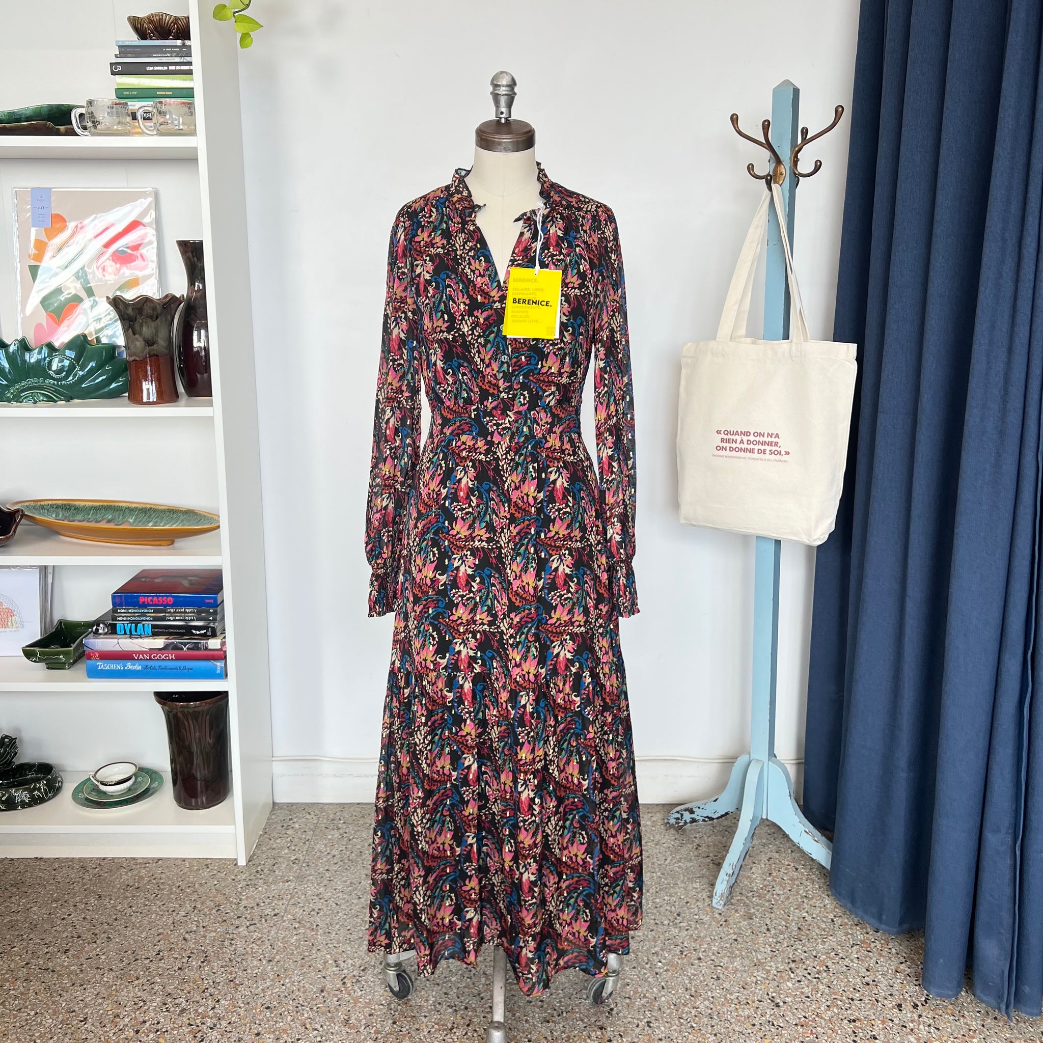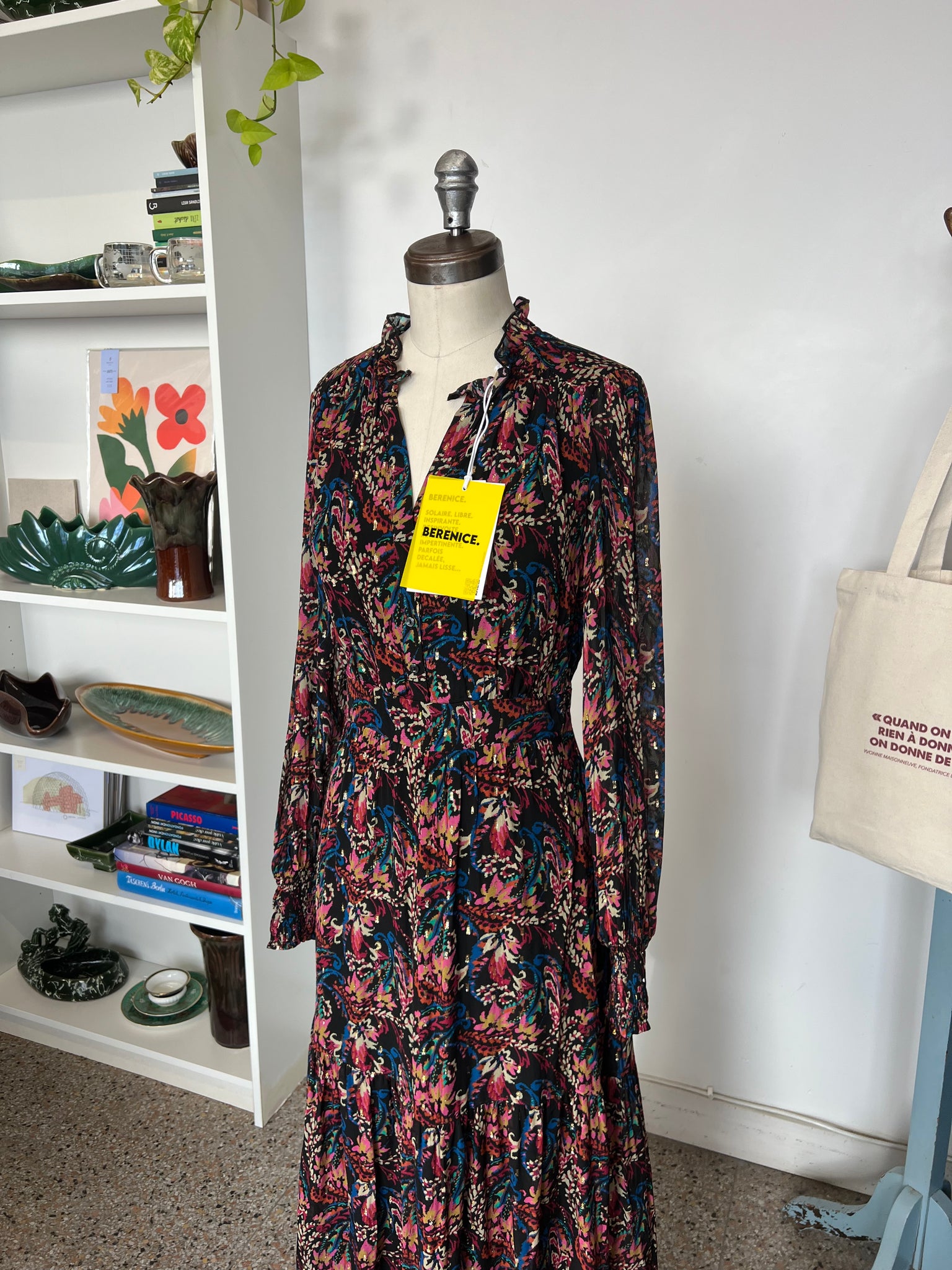 La robe RILA allie élégance et brillance avec son imprimé flower lurex délicat. Sa coupe longue fluide, son col V boutonné et ses manches longues offrent un style sophistiqué et confortable, idéal pour les occasions chic. Avec mince doublure noire. D'une valeur de 625$.