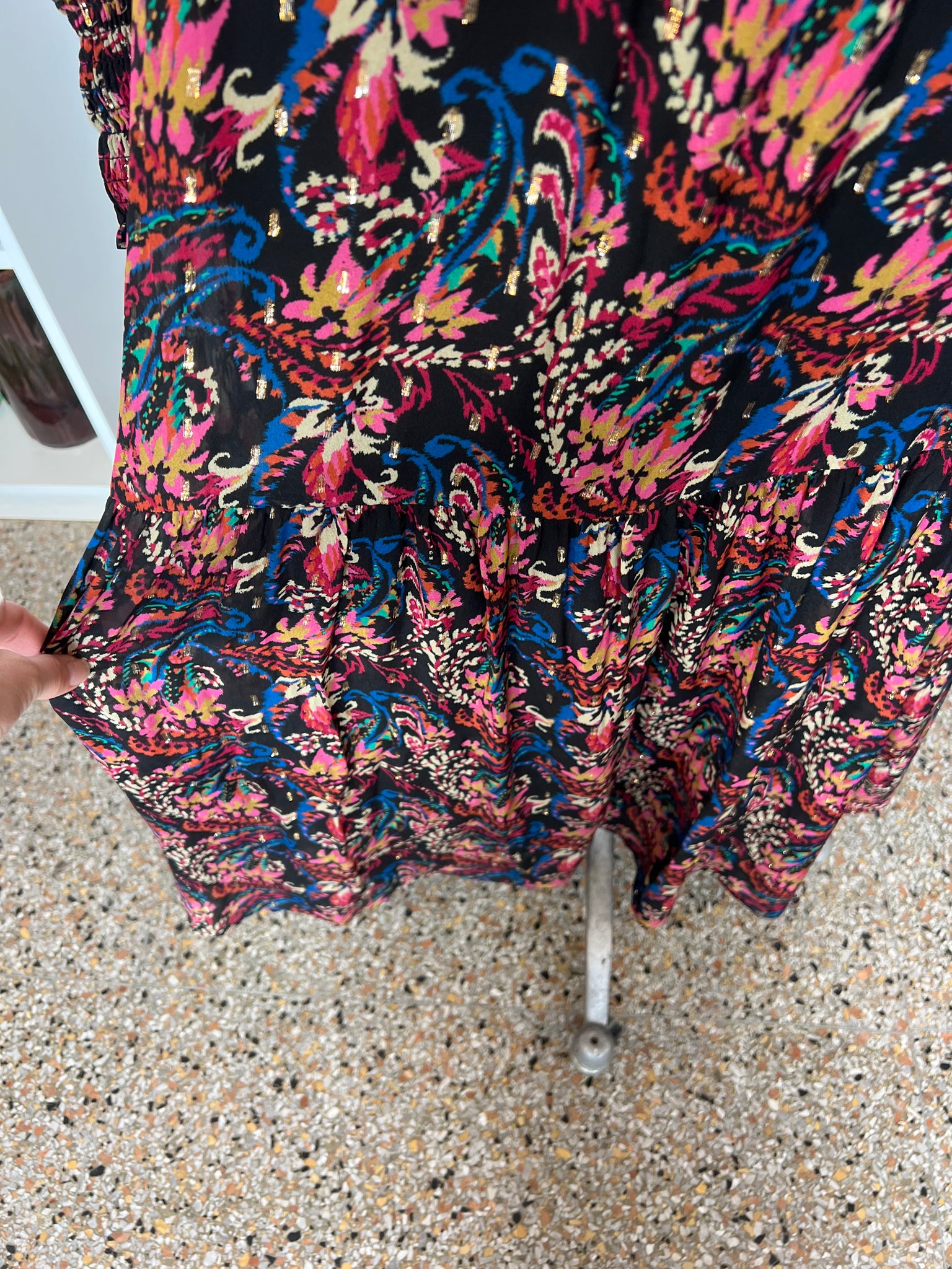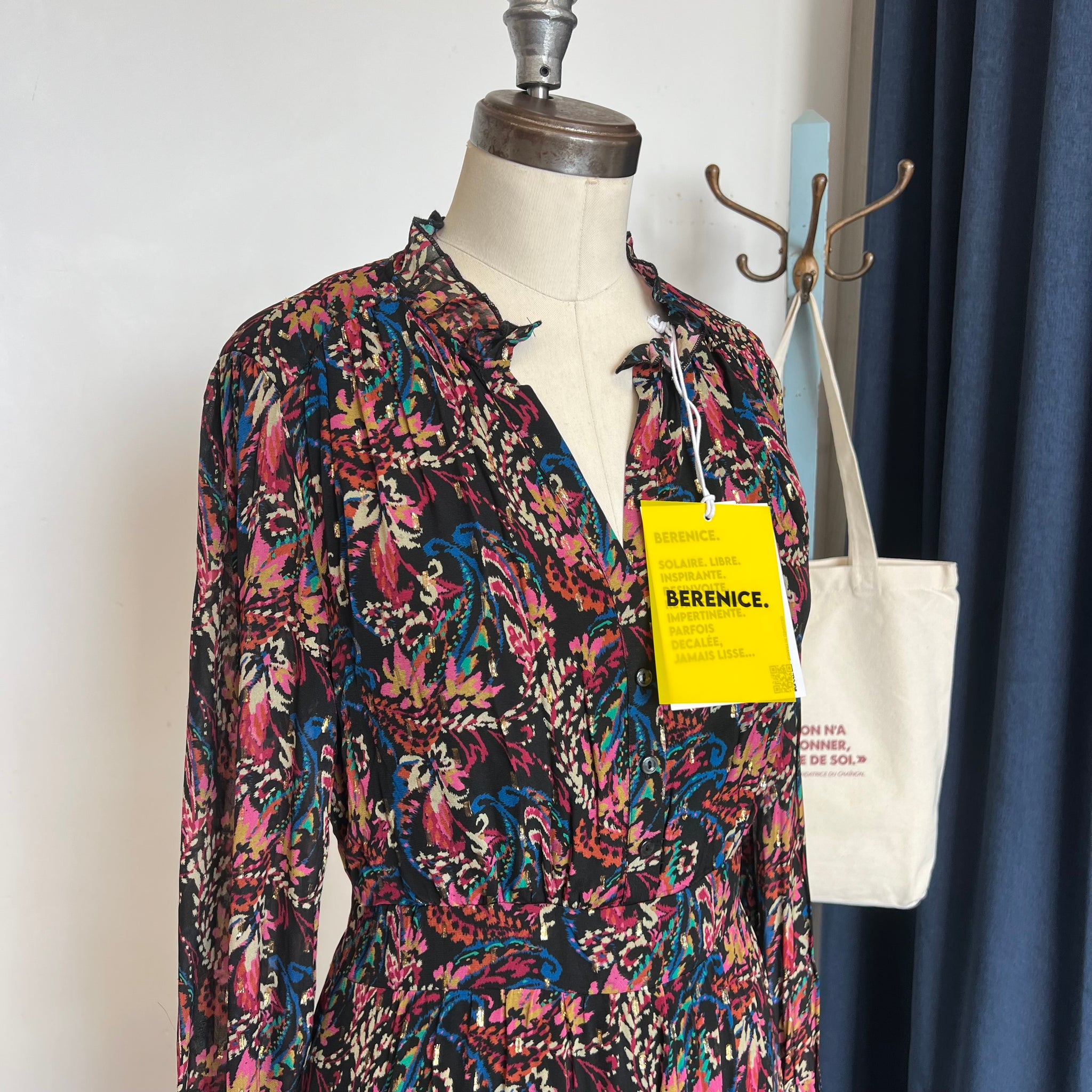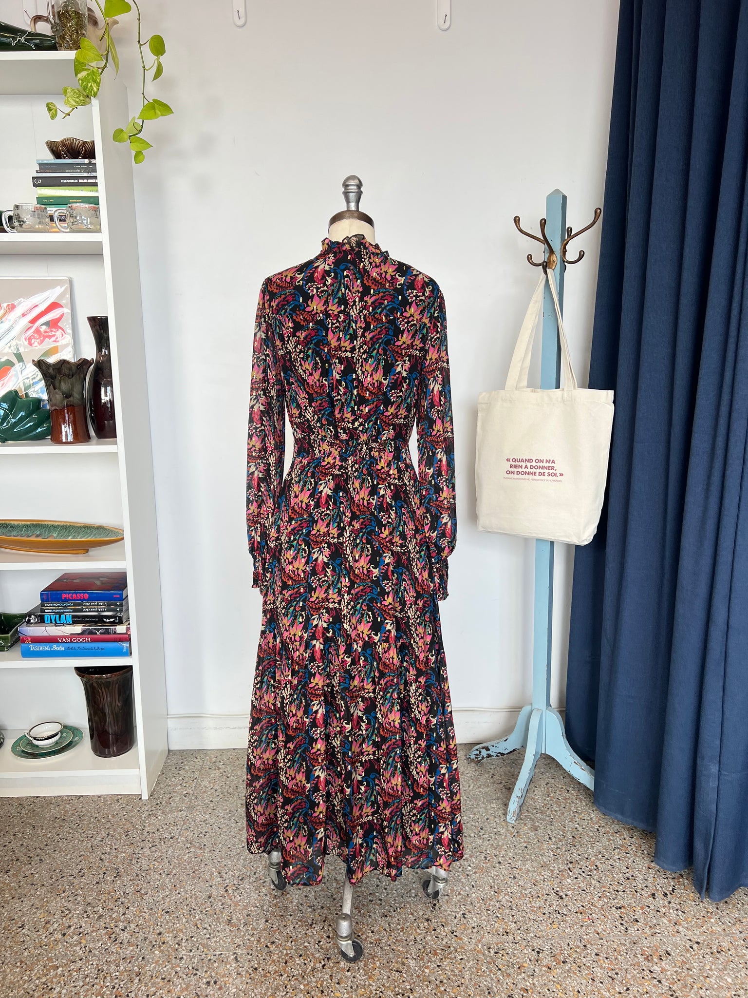 La robe RILA allie élégance et brillance avec son imprimé flower lurex délicat. Sa coupe longue fluide, son col V boutonné et ses manches longues offrent un style sophistiqué et confortable, idéal pour les occasions chic. Avec mince doublure noire. D'une valeur de 625$.