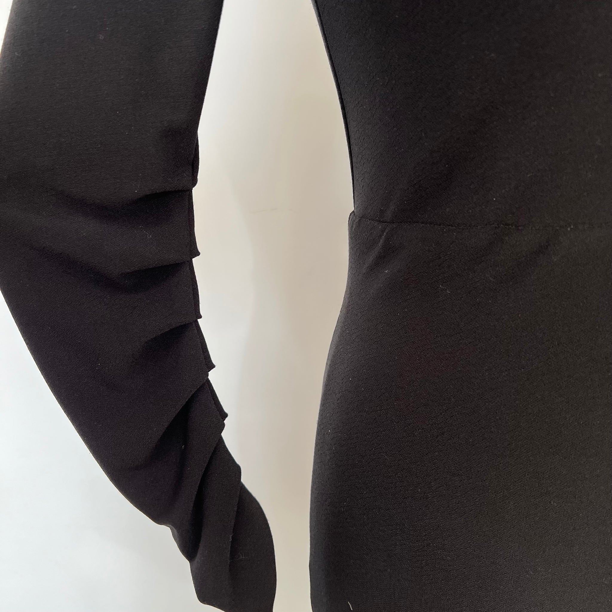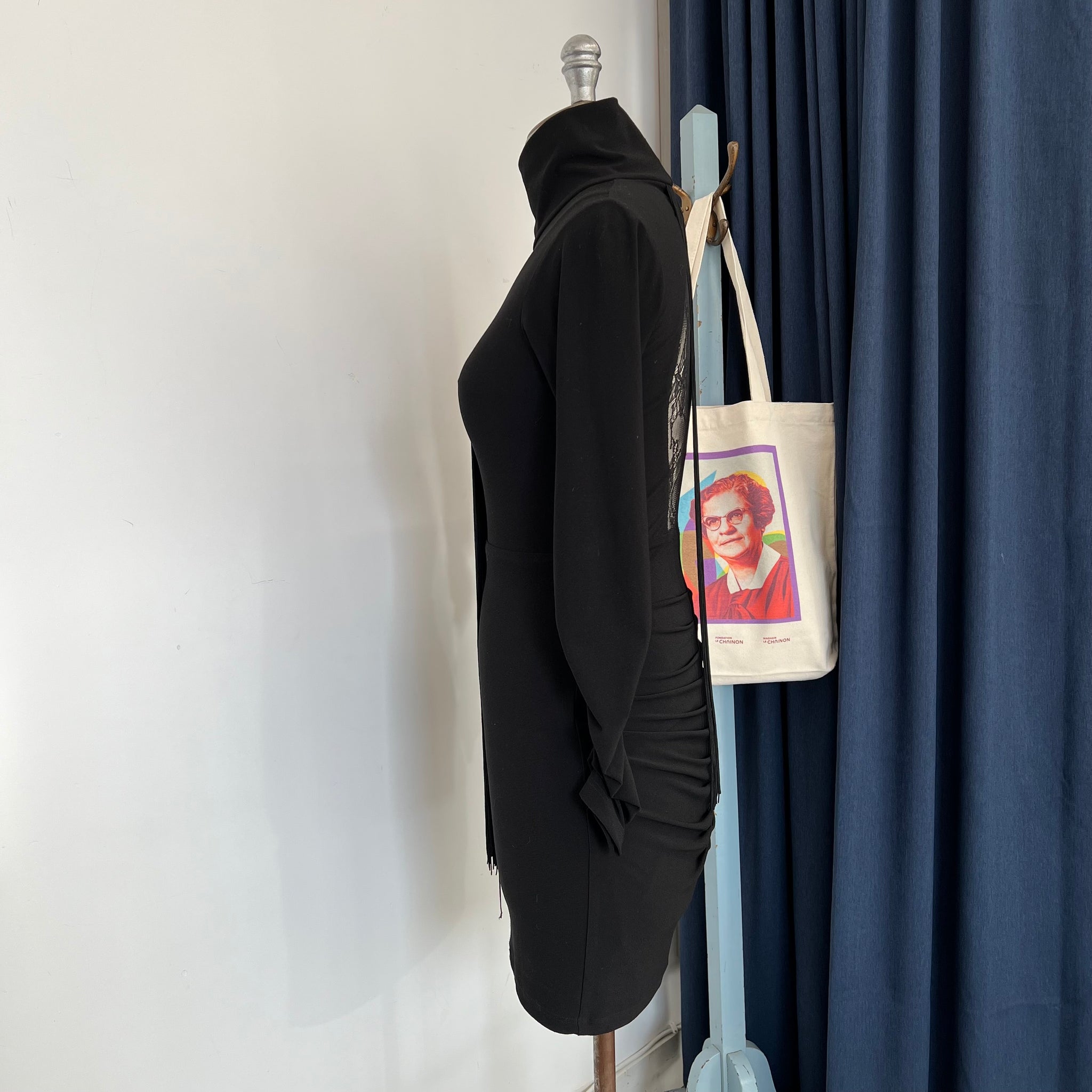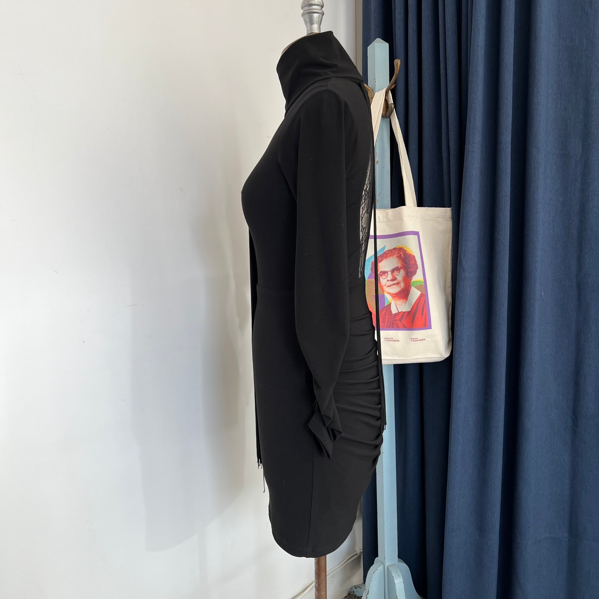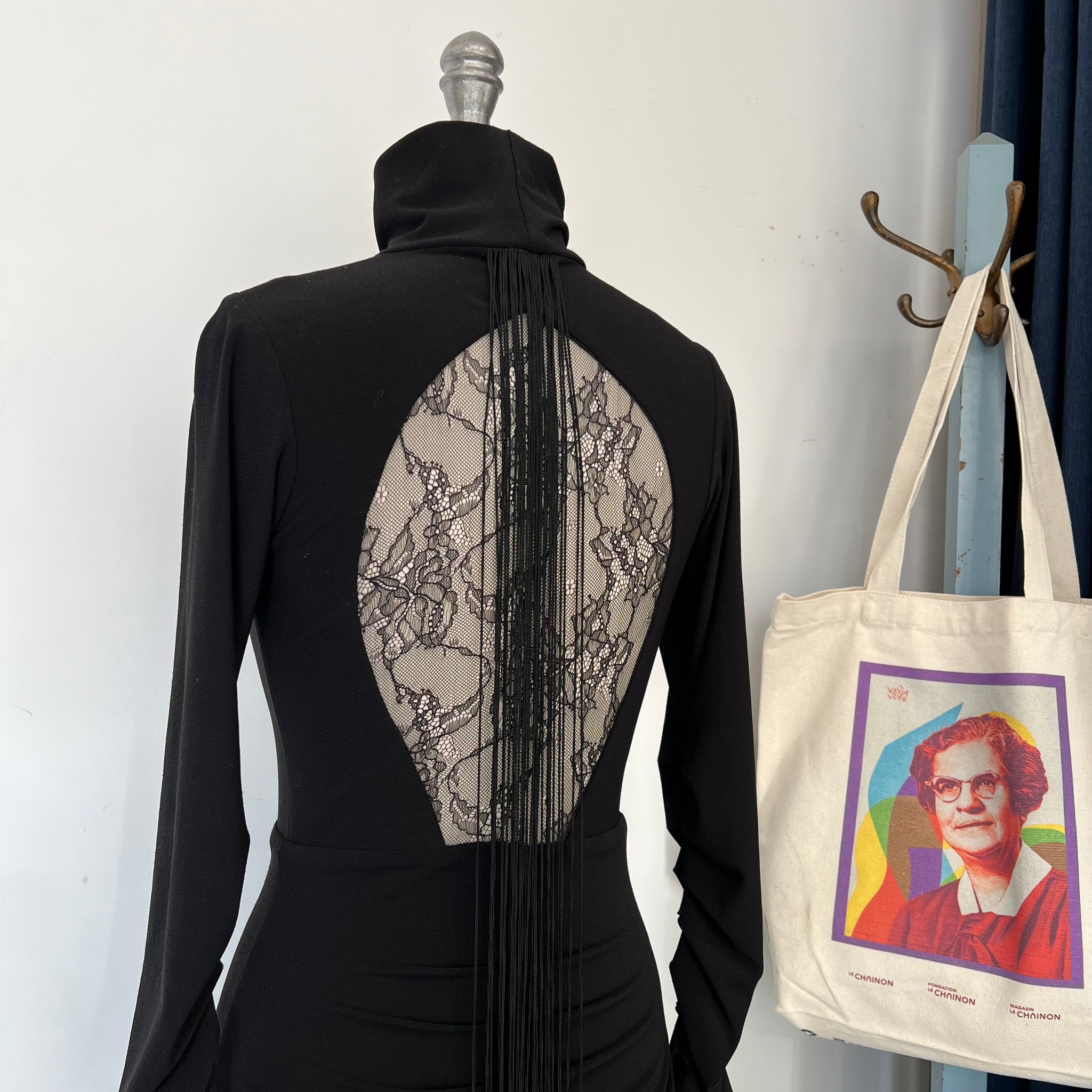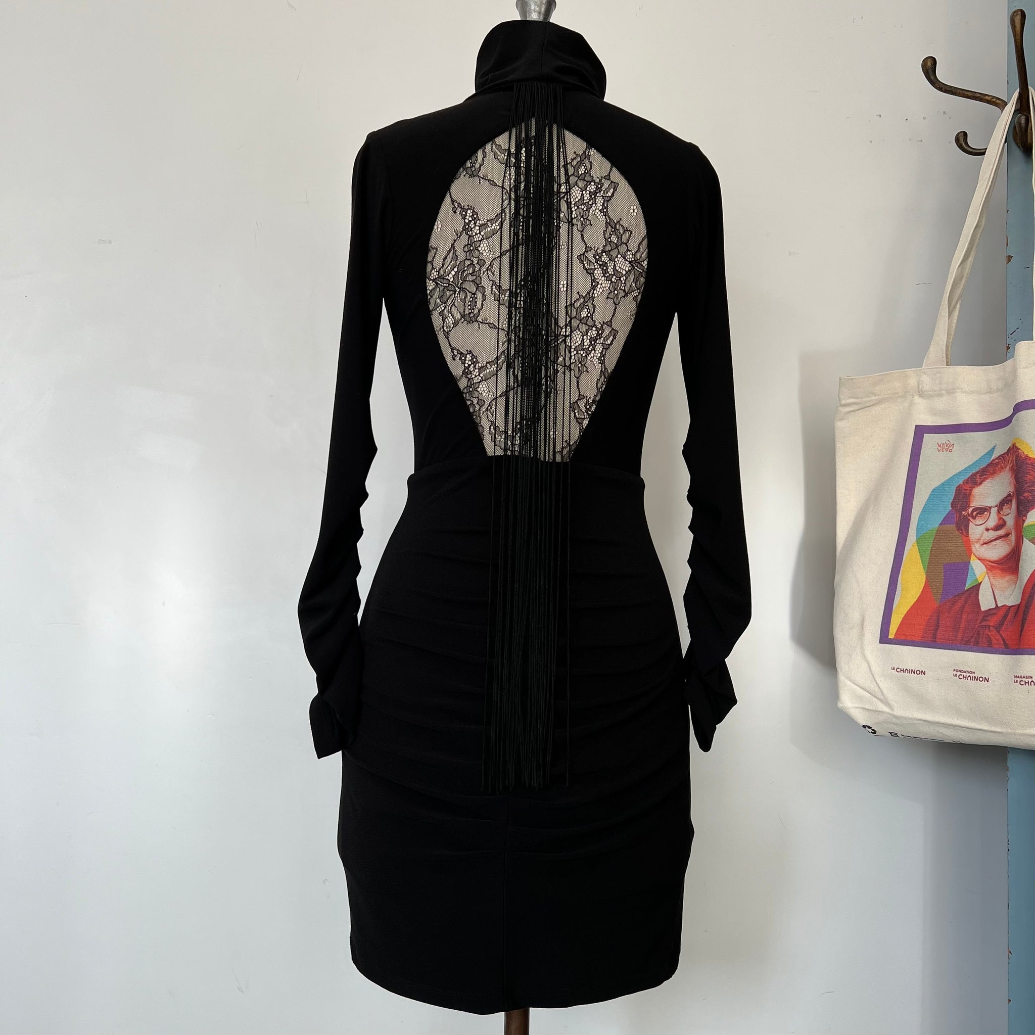 Robe de la marque québécoise Ève Gravel. Avec franges décoratives à l'avant et dos ouvert en tissu dentelle. Col montant. Tissu non doublé, extensible.