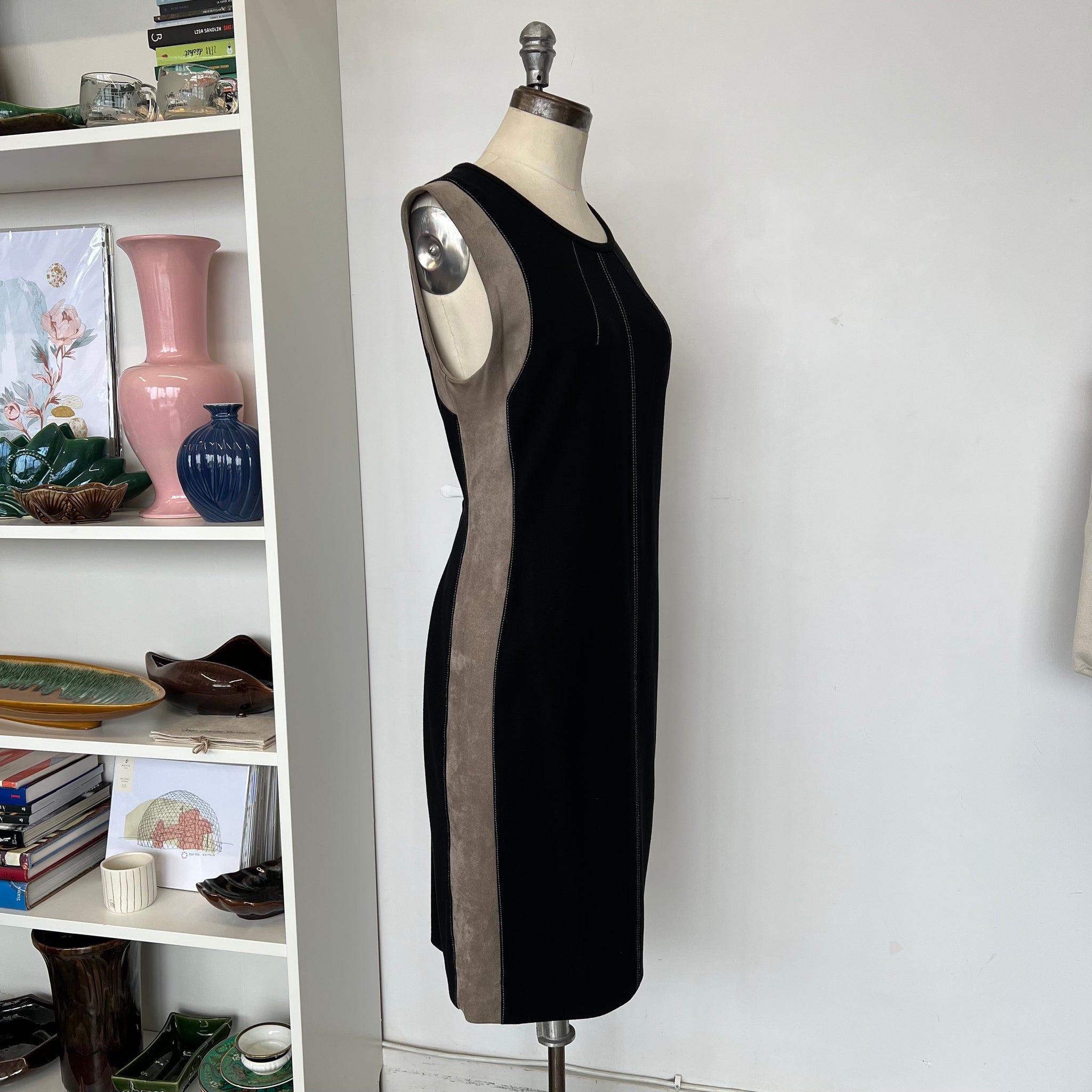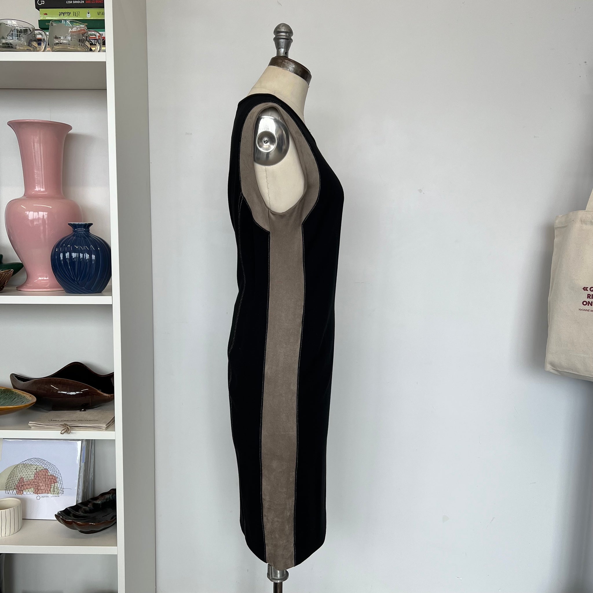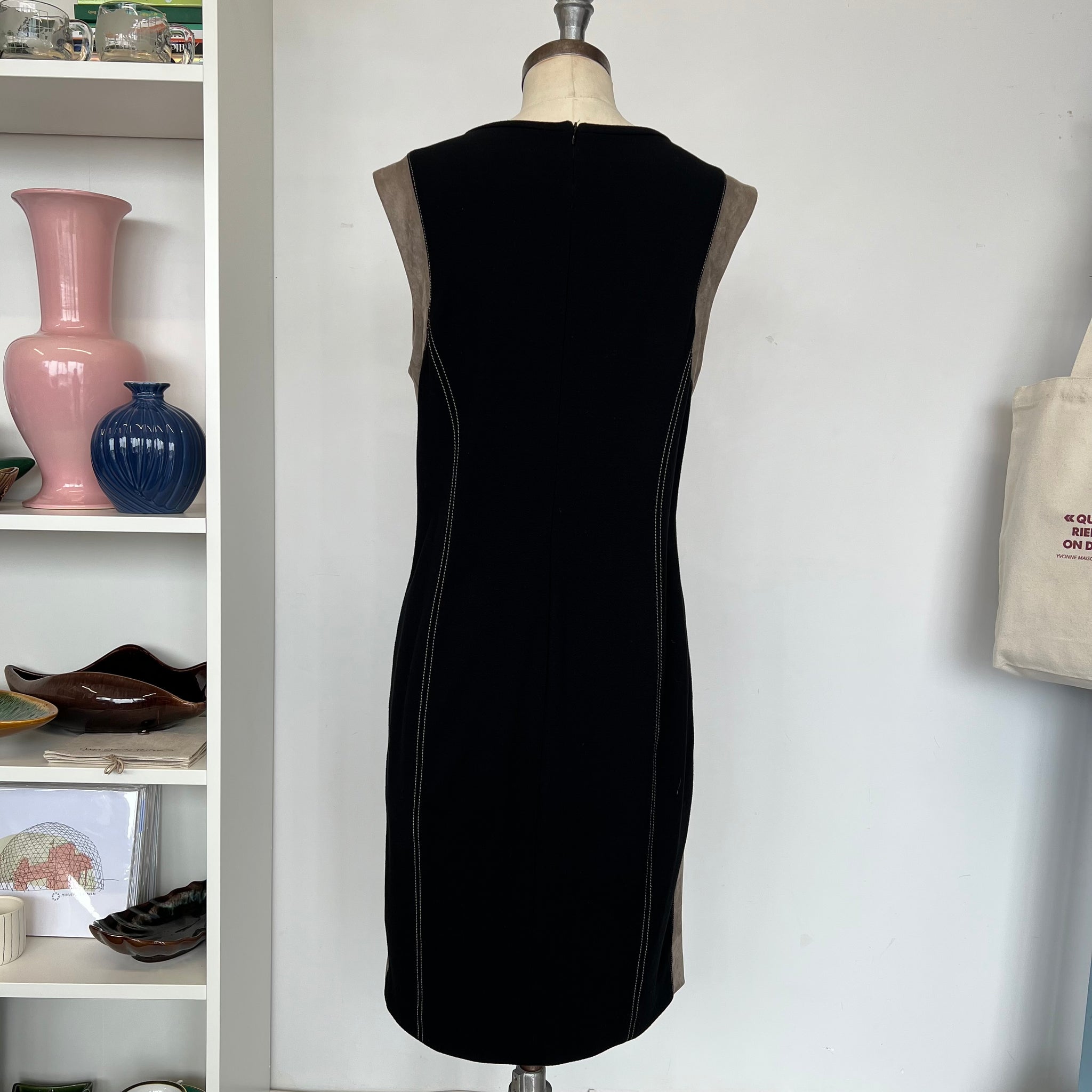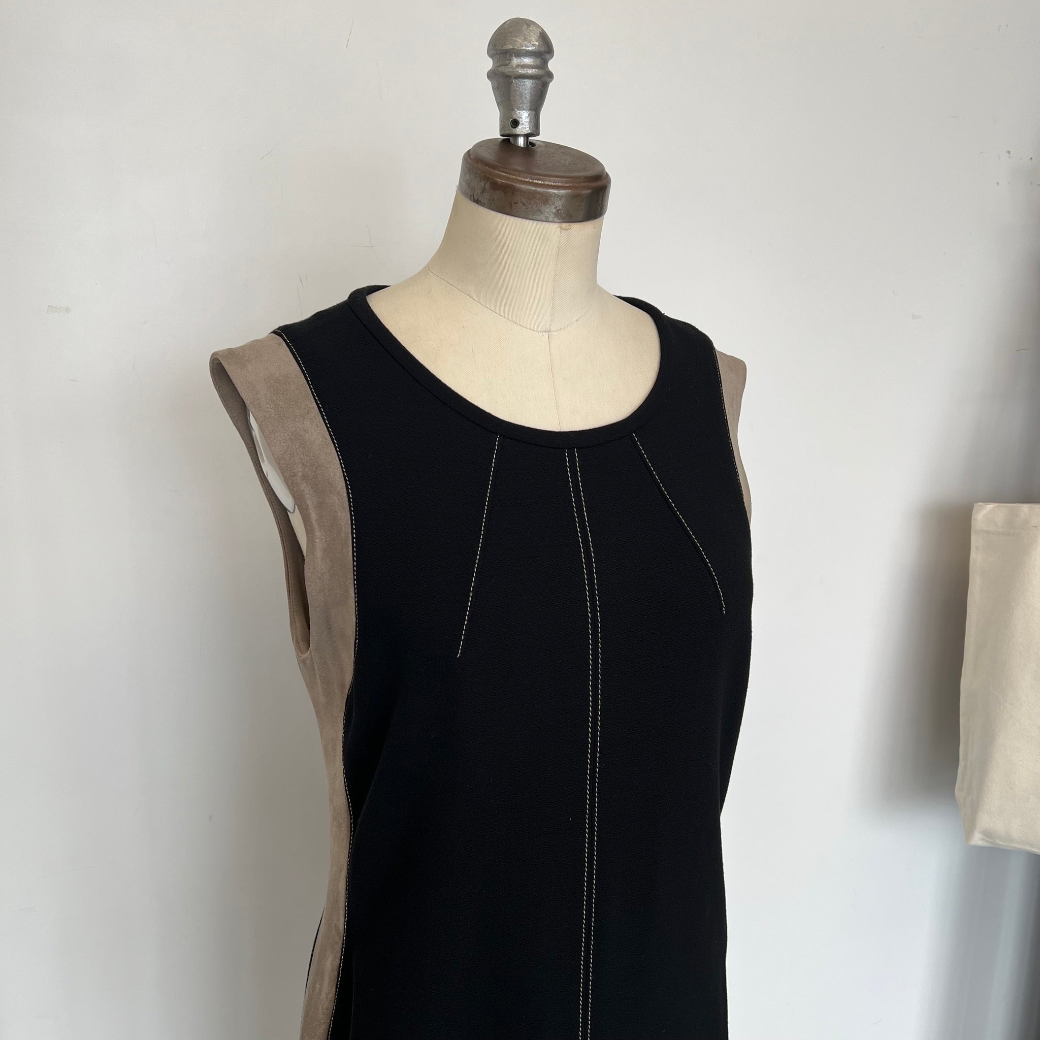 Magnifique robe sans manches de la marque Marc Cain. Longueur genoux, en viscose stretch et bande imitant du suède sur les cotés. Avec détails surpiqué beige. Col rond, fermeture éclair au dos.