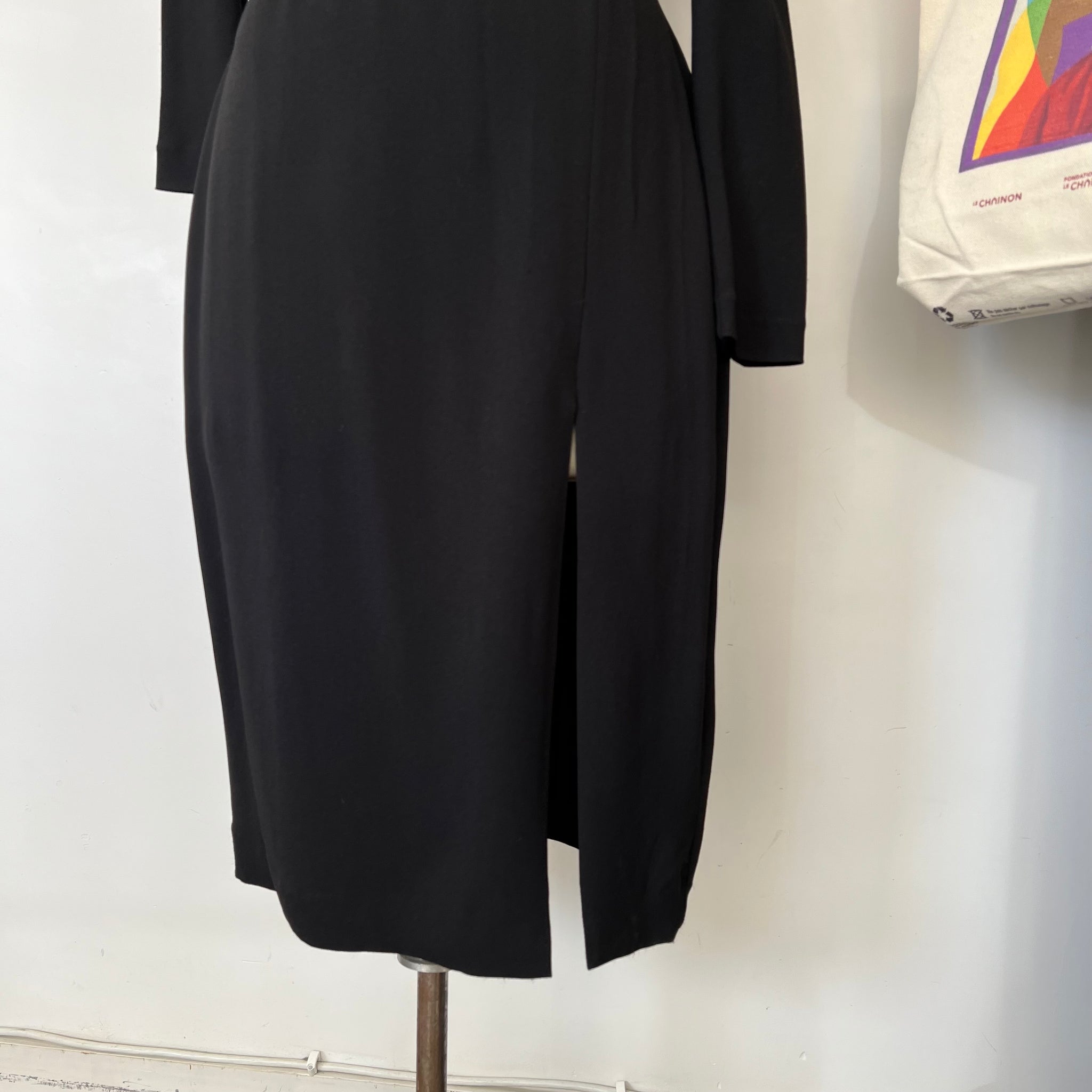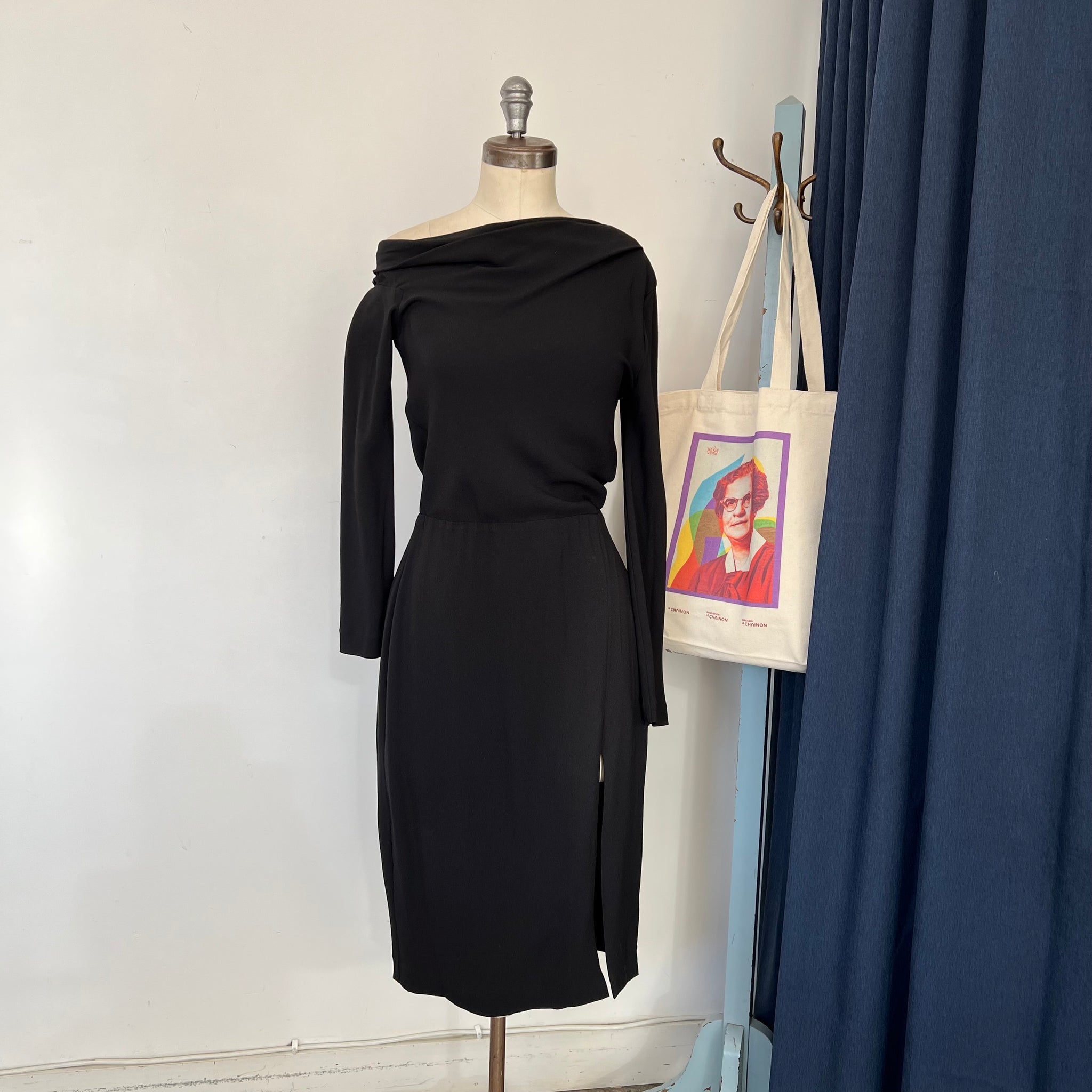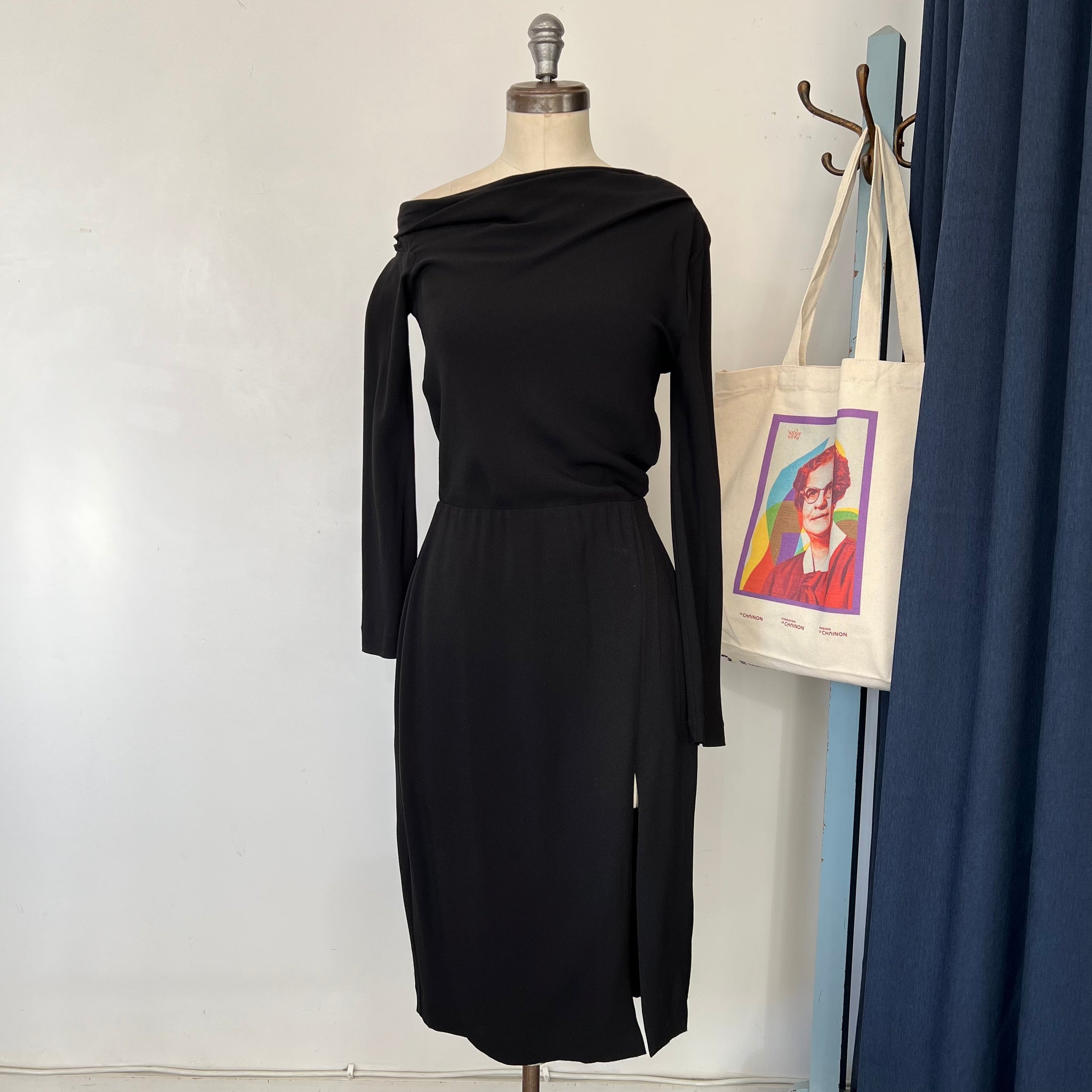 Robe offshoulder de la marque Theory modèle Rosania Crepe 2. Mi-longue avec une épaule dénudée, design asymétrique, manches longues et fente avant latérale. Tissu non stress d'épaisseur moyen. Coupe cintrée au buste et à la taille, plus ample au niveau des hanches. D'une valeur de plus de 800$.