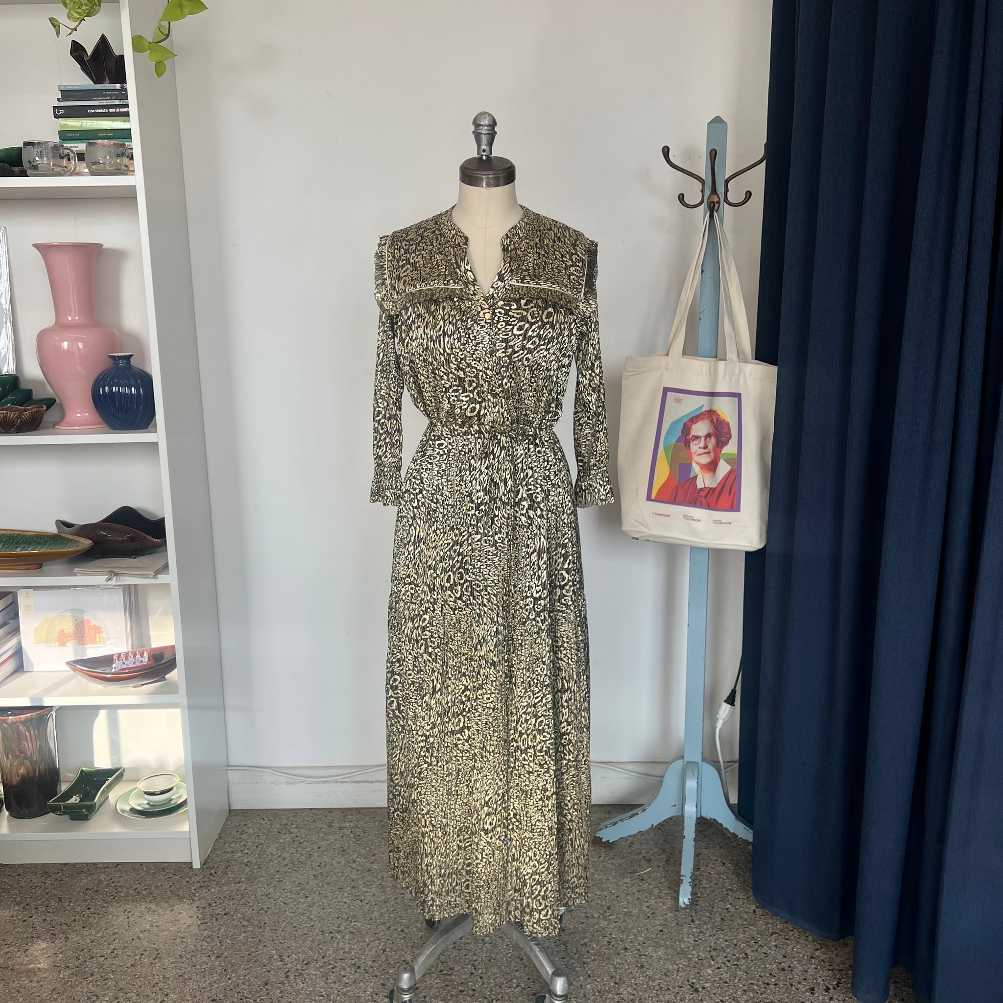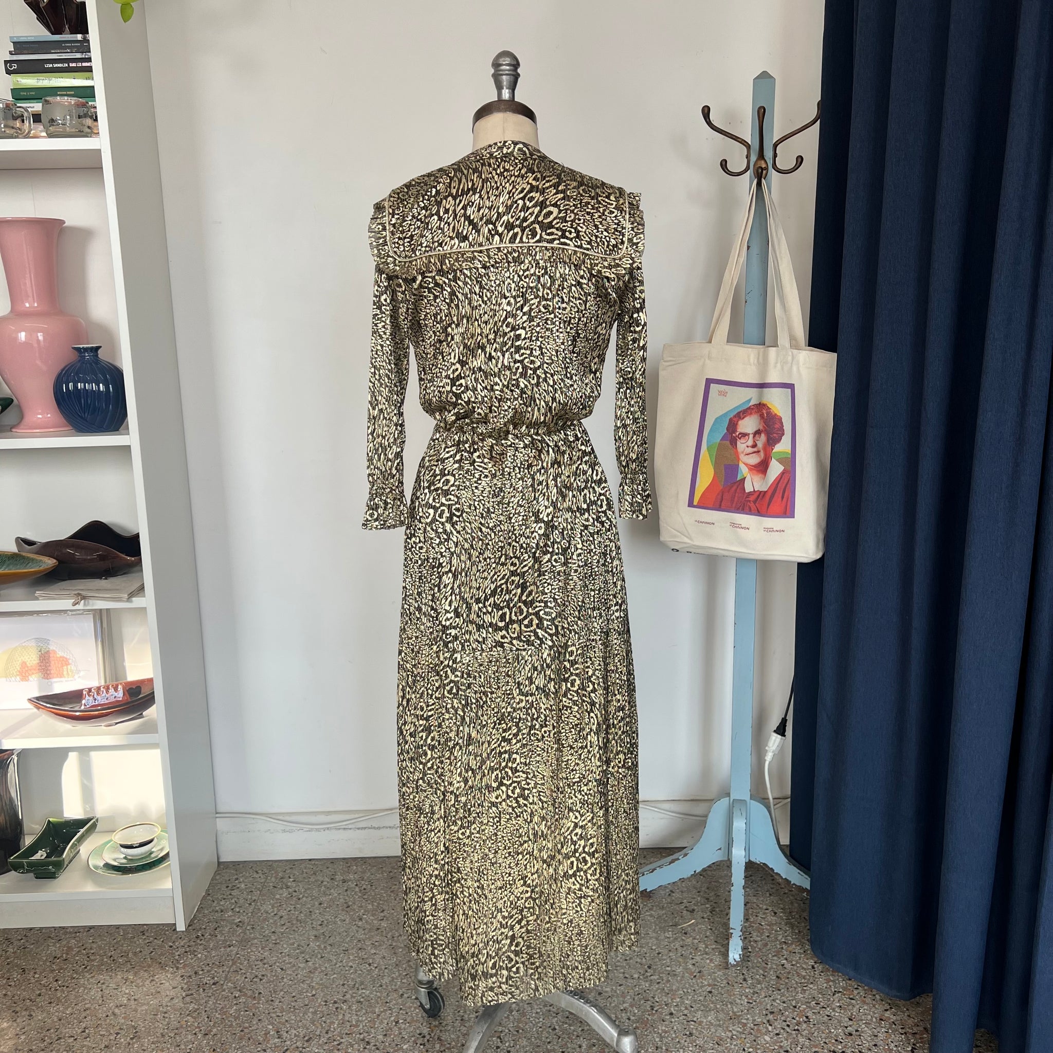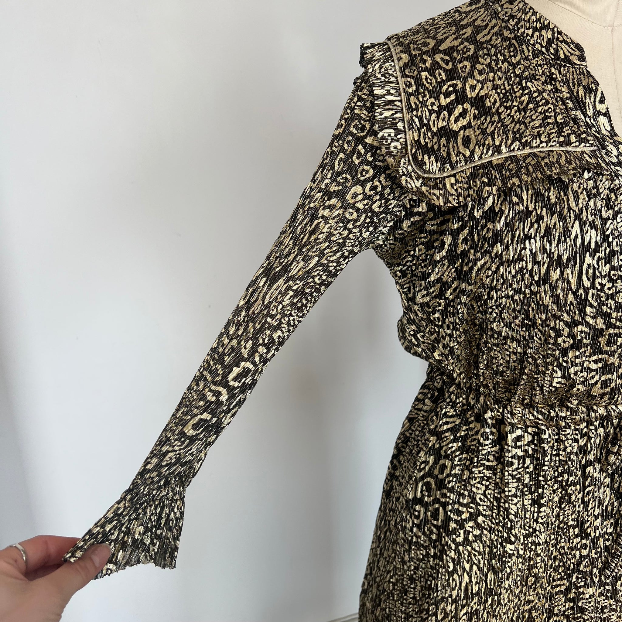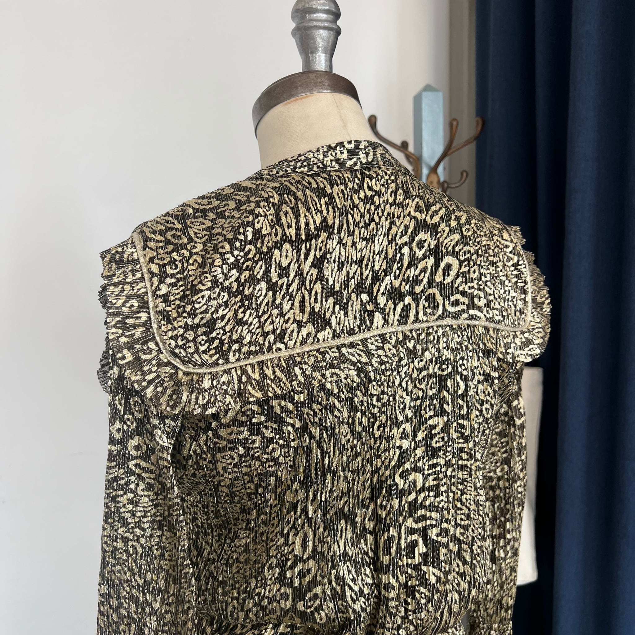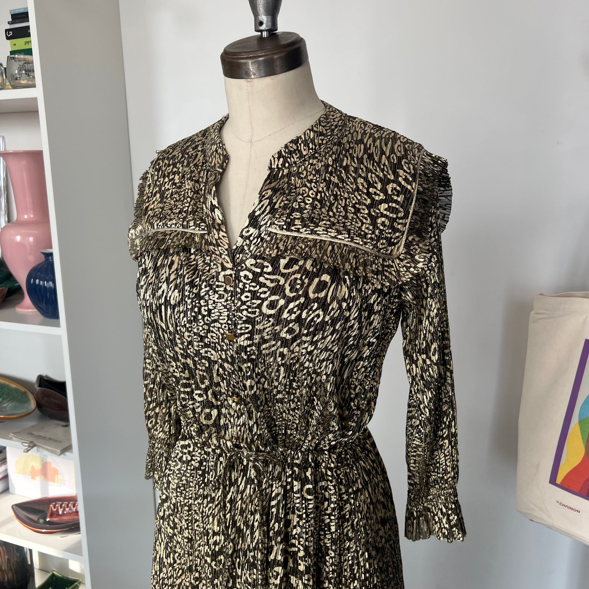 Robe-chemise mi-longue de la marque Scarlet Roos modèle Clyde. Col mandarin orné d'un bandeau central décoratif et de trois boutons dorés métallisés. Empiècement devant et au dos à volants dorés et ourlet. Ceinture à nouer avec un ruban froncé. Jupe longue ample, avec doublure noire. Manches longues à poignets élastiqués à effet volanté.