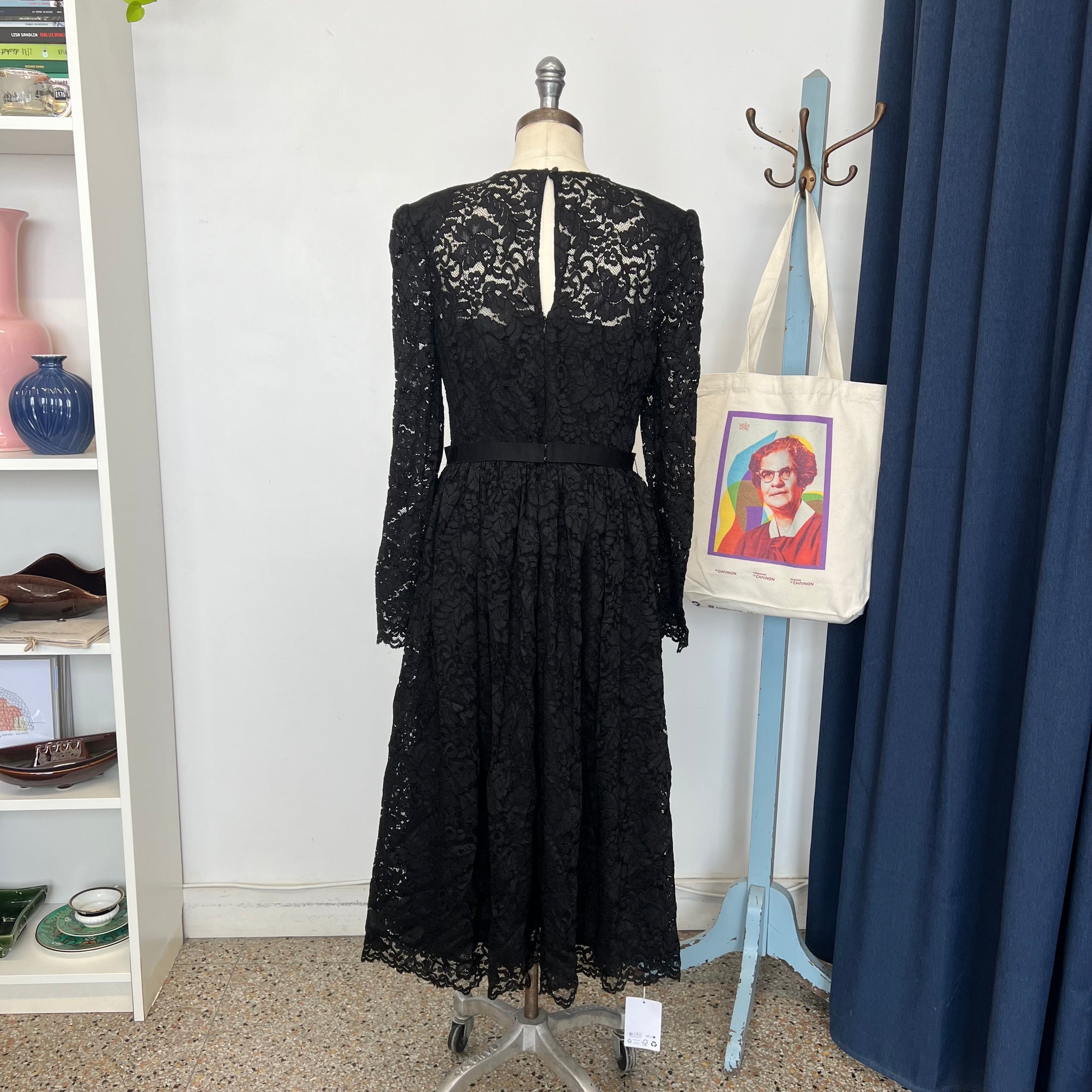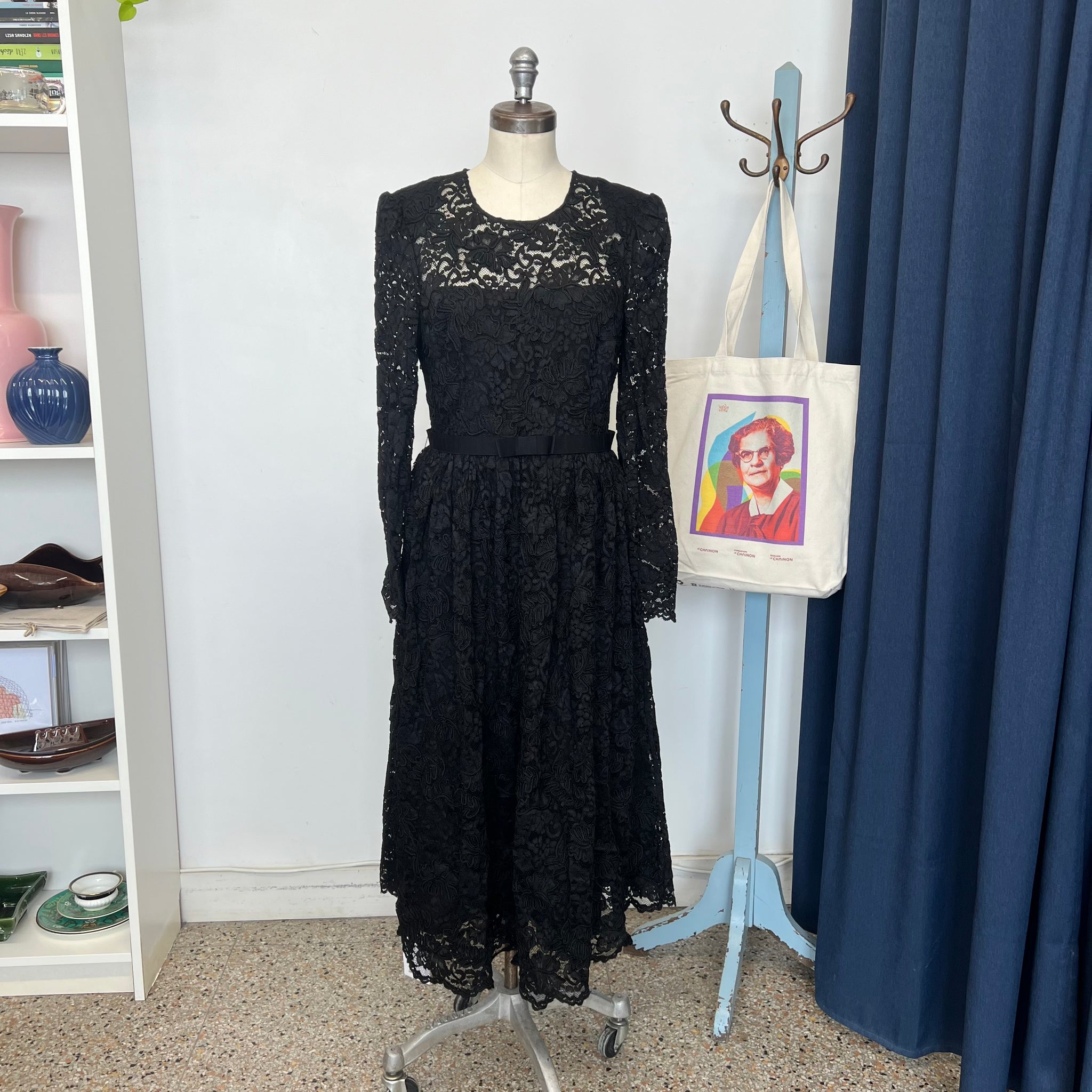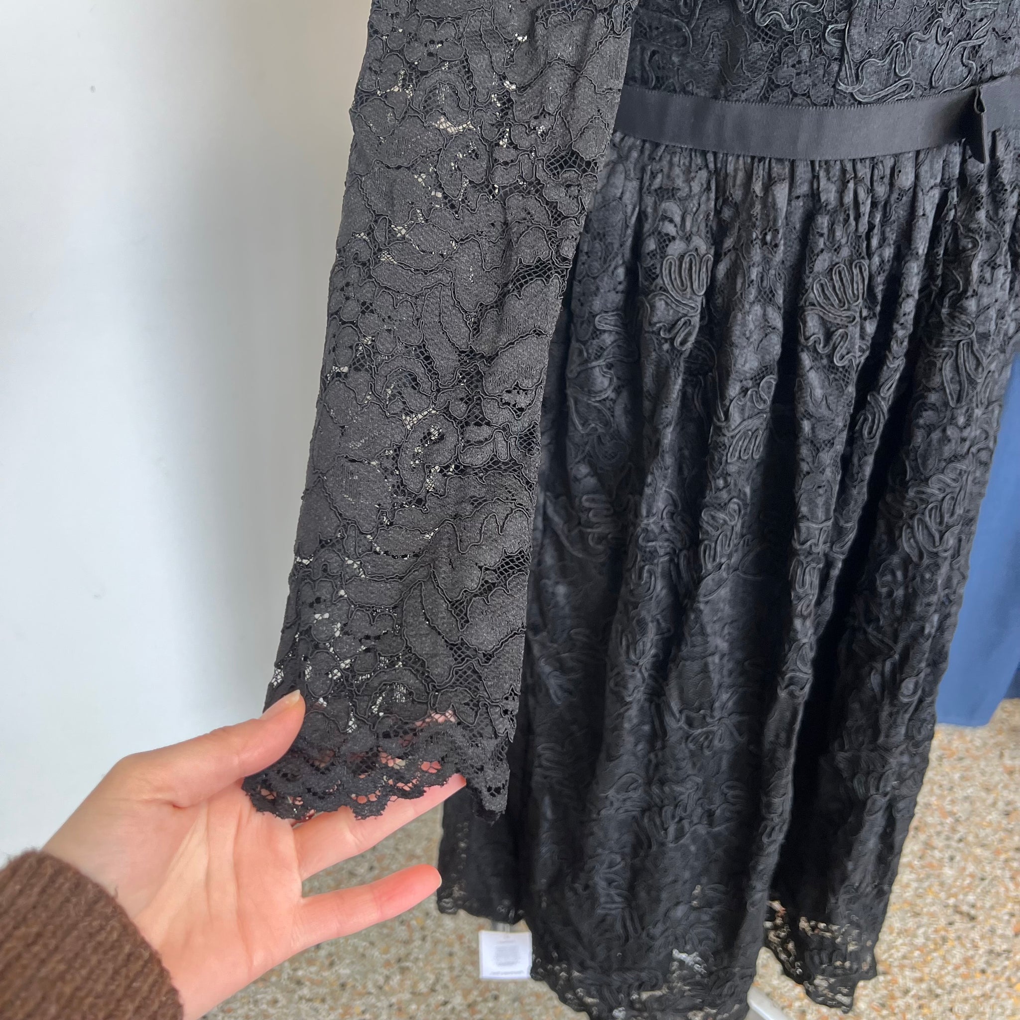 Robe de la marque Self-portrait modèle Black cord lace midi-dress. Élégante robe noire de Self Portrait ornée de détails en dentelle complexes, encolure ronde, manches longues, ceinture à à la taille avec fermeture à velcro, bouton et fermeture éclair dissimulée à l'arrière, corsage et jupe entièrement doublés. Avec épaulettes. Longueur midi. D'une valeur de 895$.