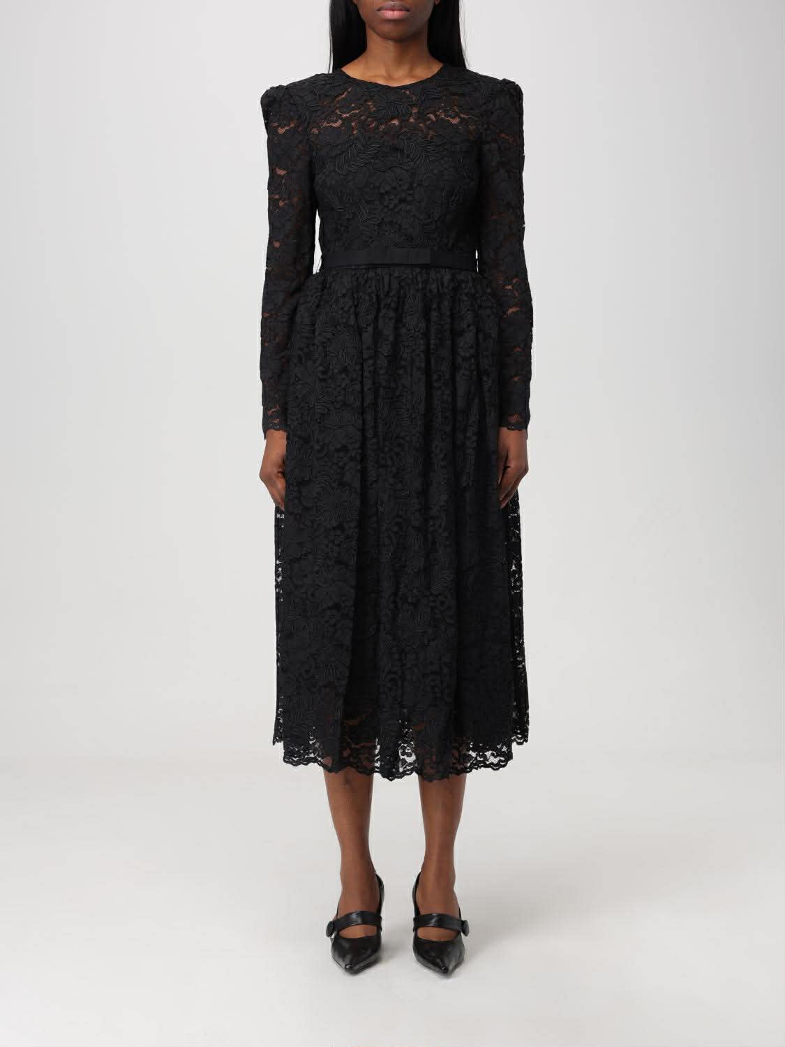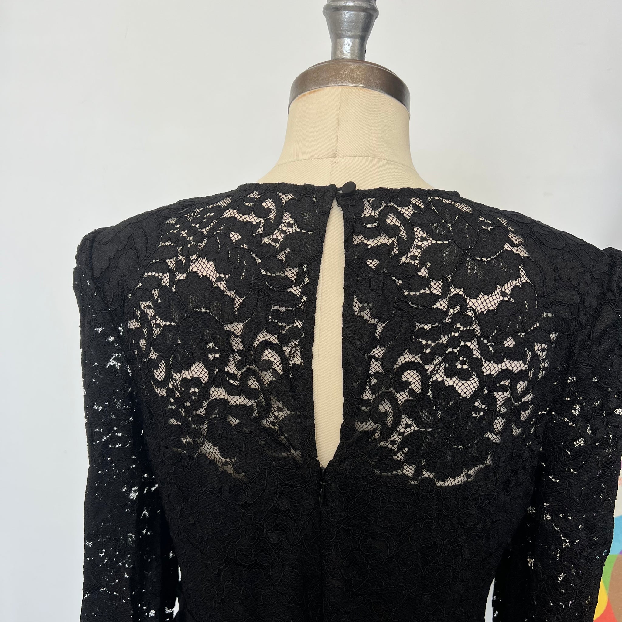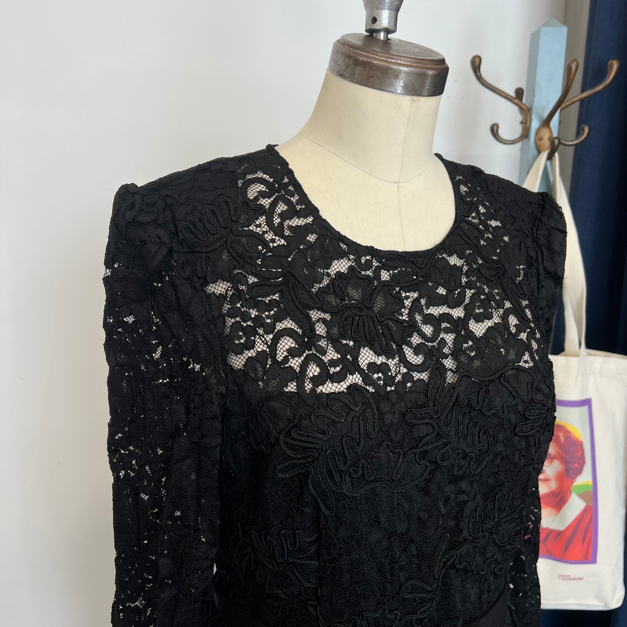 Robe de la marque Self-portrait modèle Black cord lace midi-dress. Élégante robe noire de Self Portrait ornée de détails en dentelle complexes, encolure ronde, manches longues, ceinture à à la taille avec fermeture à velcro, bouton et fermeture éclair dissimulée à l'arrière, corsage et jupe entièrement doublés. Avec épaulettes. Longueur midi. D'une valeur de 895$.