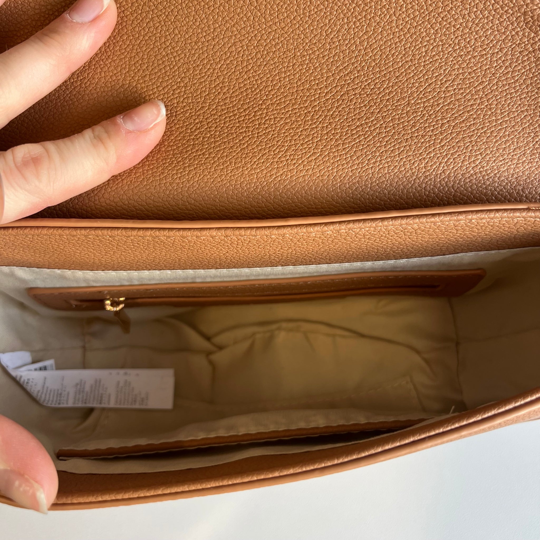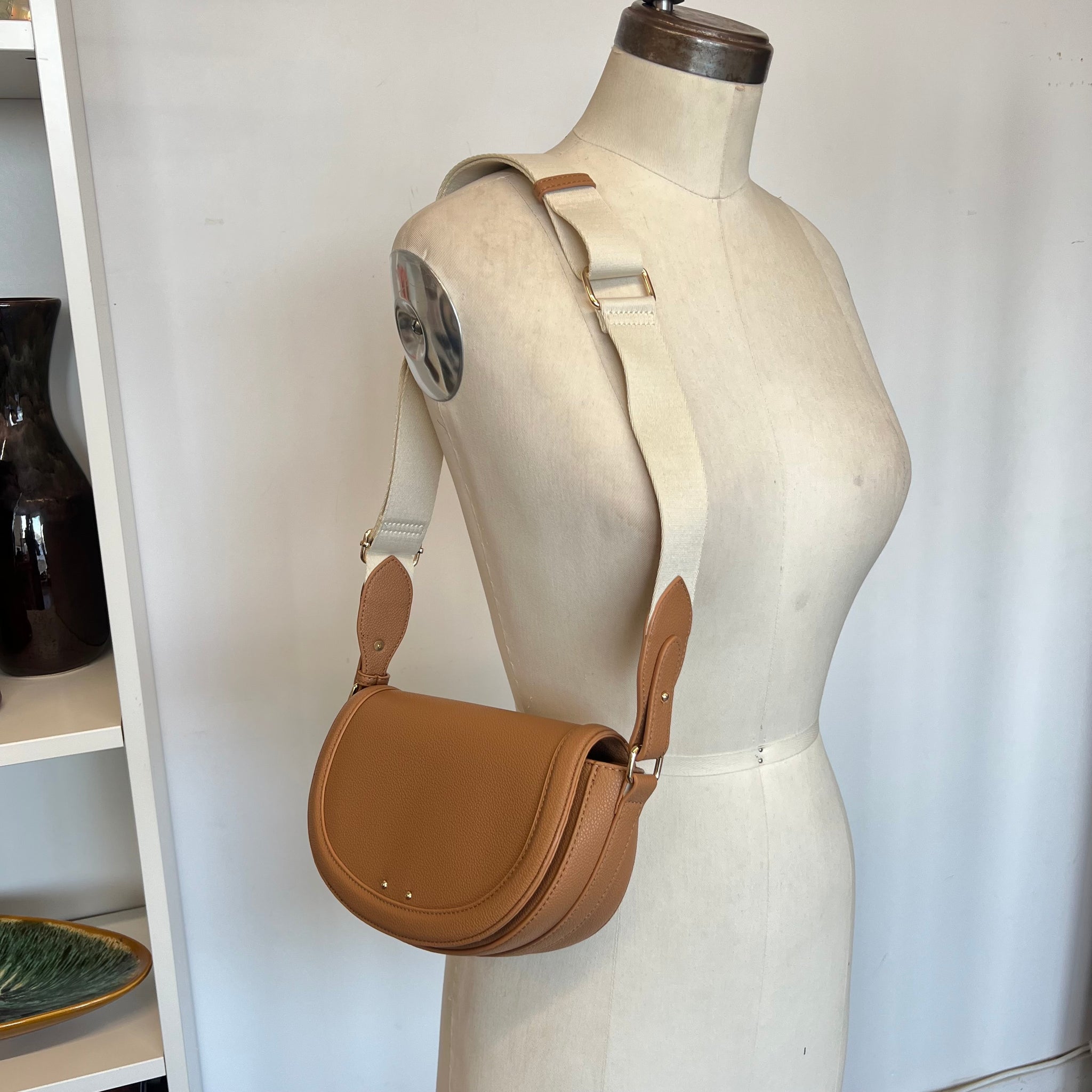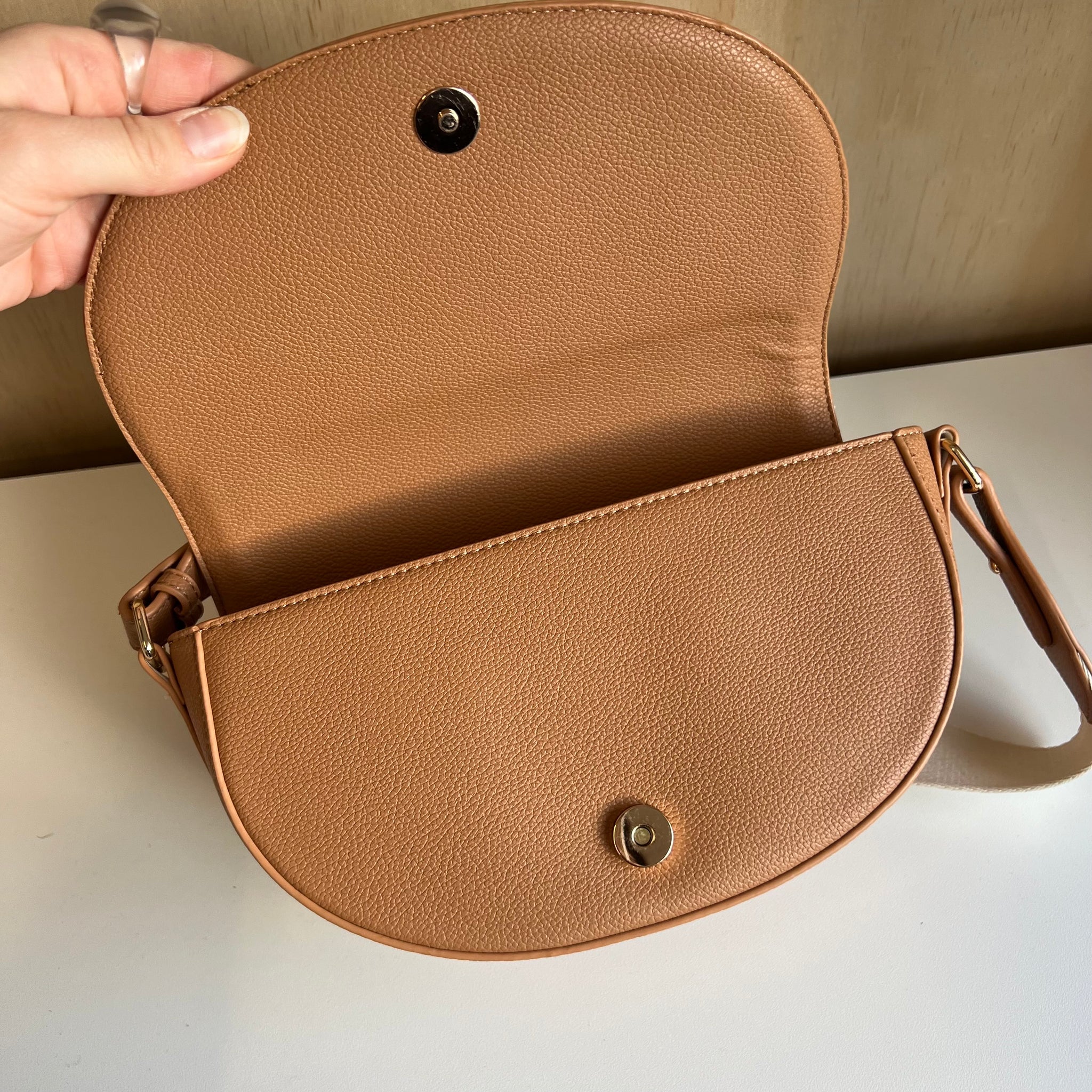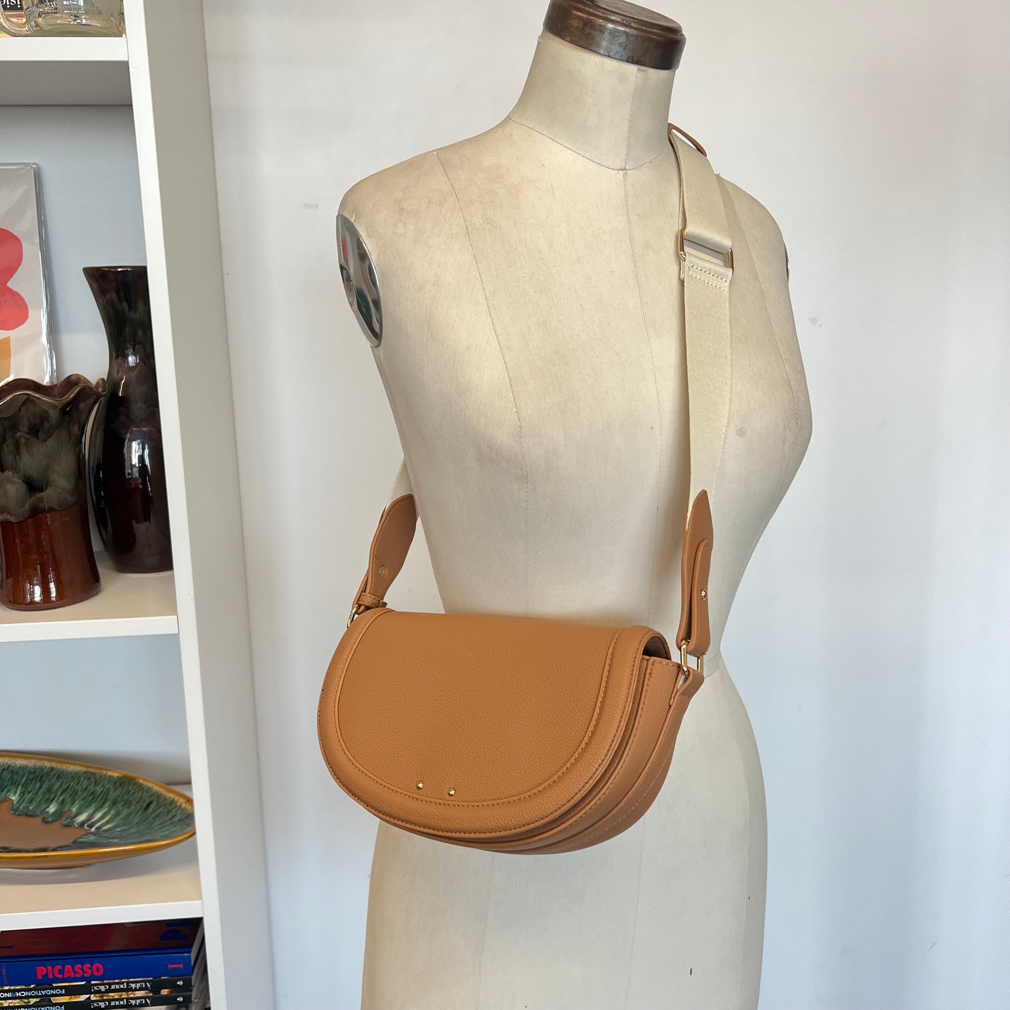 Sac besace demi lune Galeries Lafayette enduit grainé recyclé ou effet paille. Sangle porté épaule ou bandoulière. Fermeture par rabat à bouton pression. Poches intérieures.