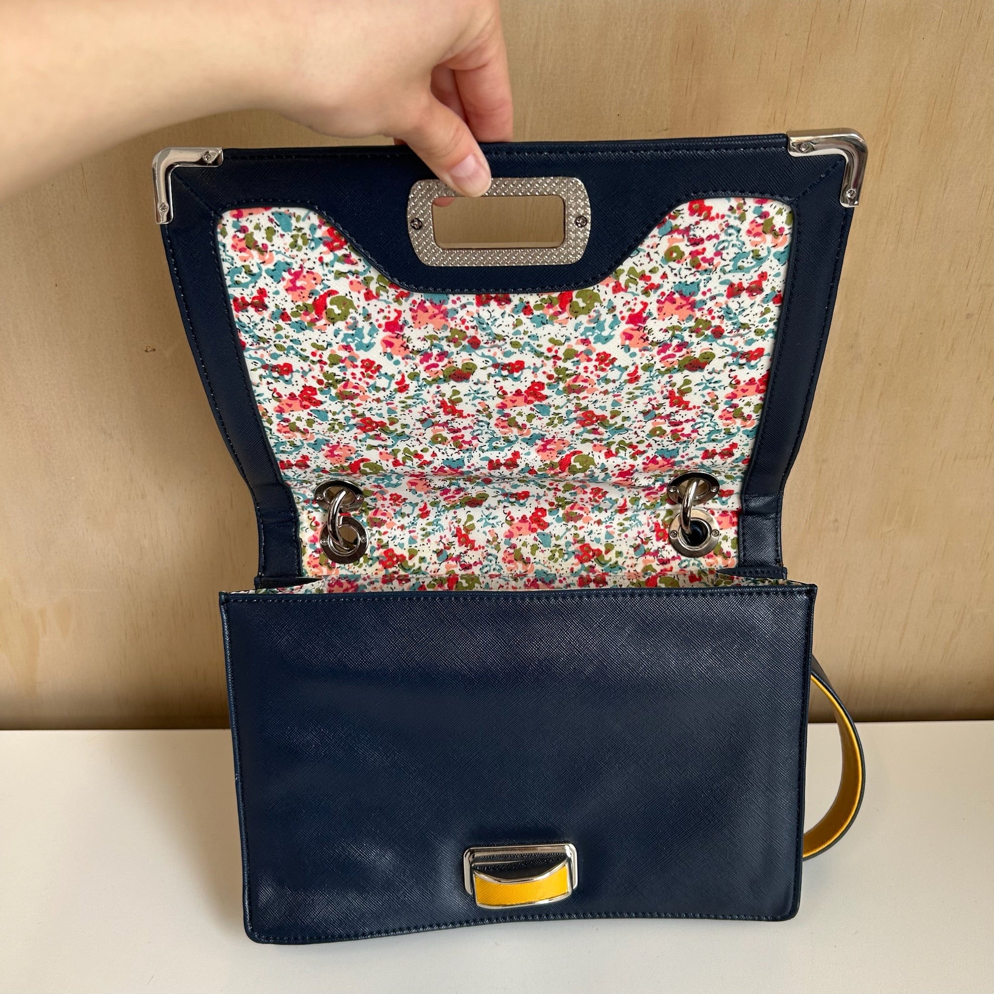 Le sac se ferme à l’aide d’un fermoir tourniquet sur le rabat. Compact et pratique, il accompagne facilement vos sorties.
