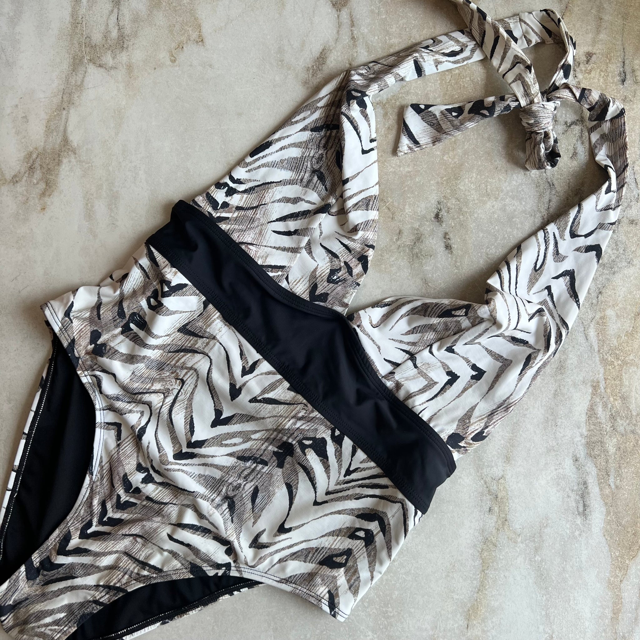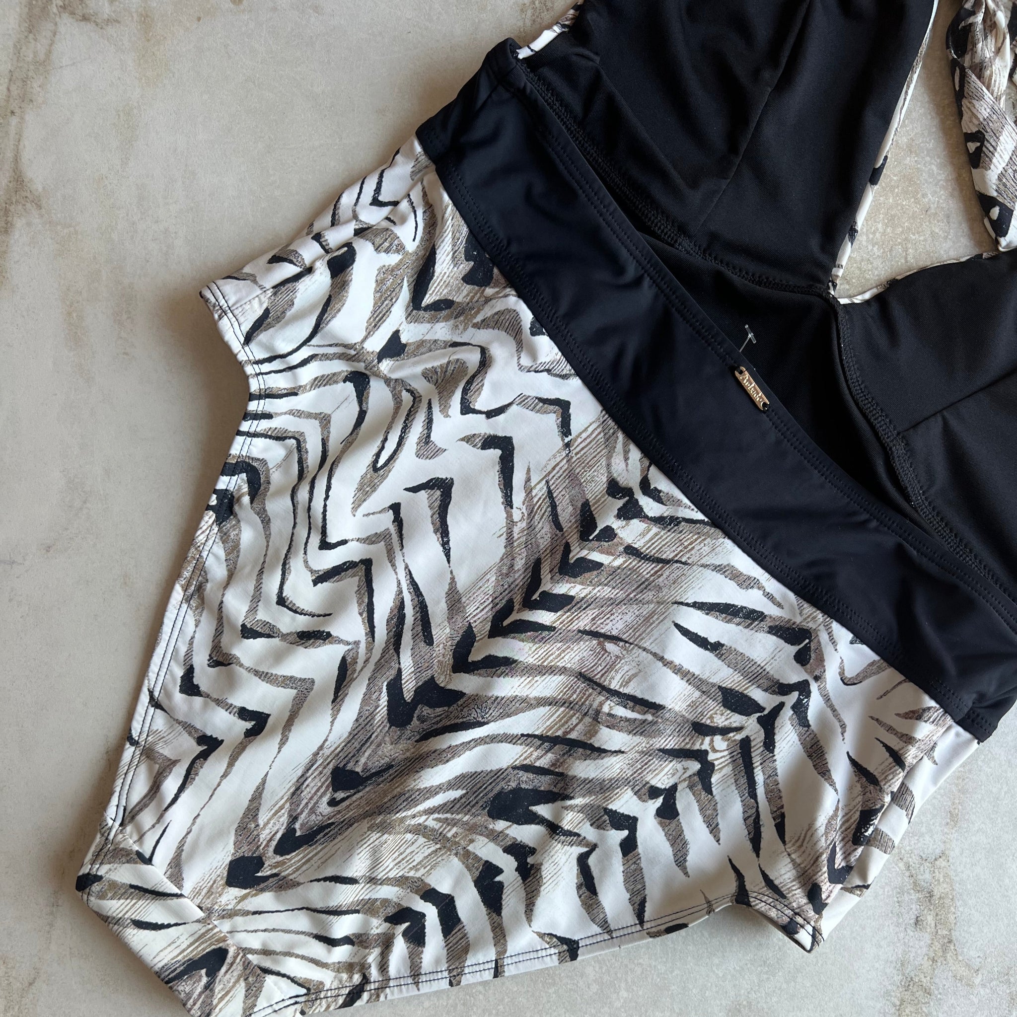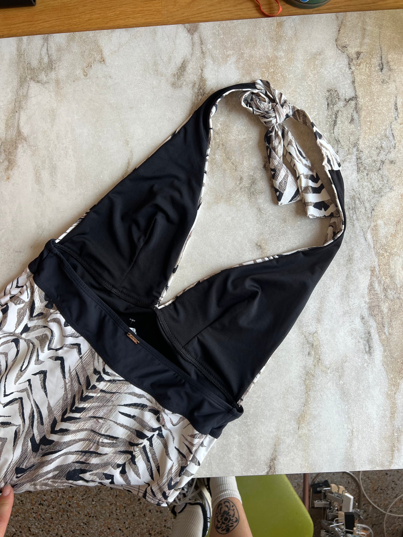 Maillot de bain une pièce de la marque Aubade. Avec décolleté plongeant, imprimé tigré et bande noire à la taille. S'attache dans le cou, sans armature. D'une valeur de 320,00$.