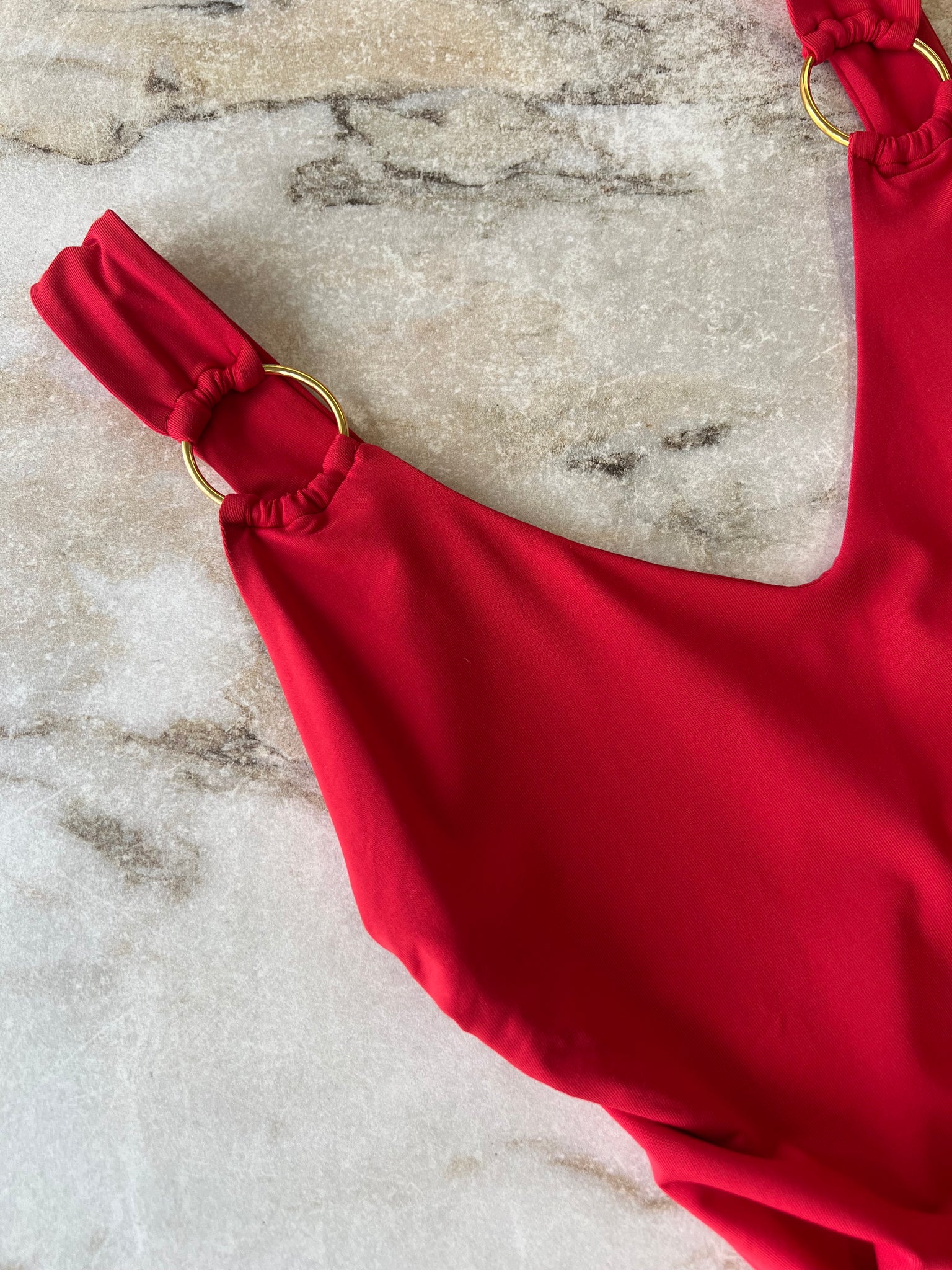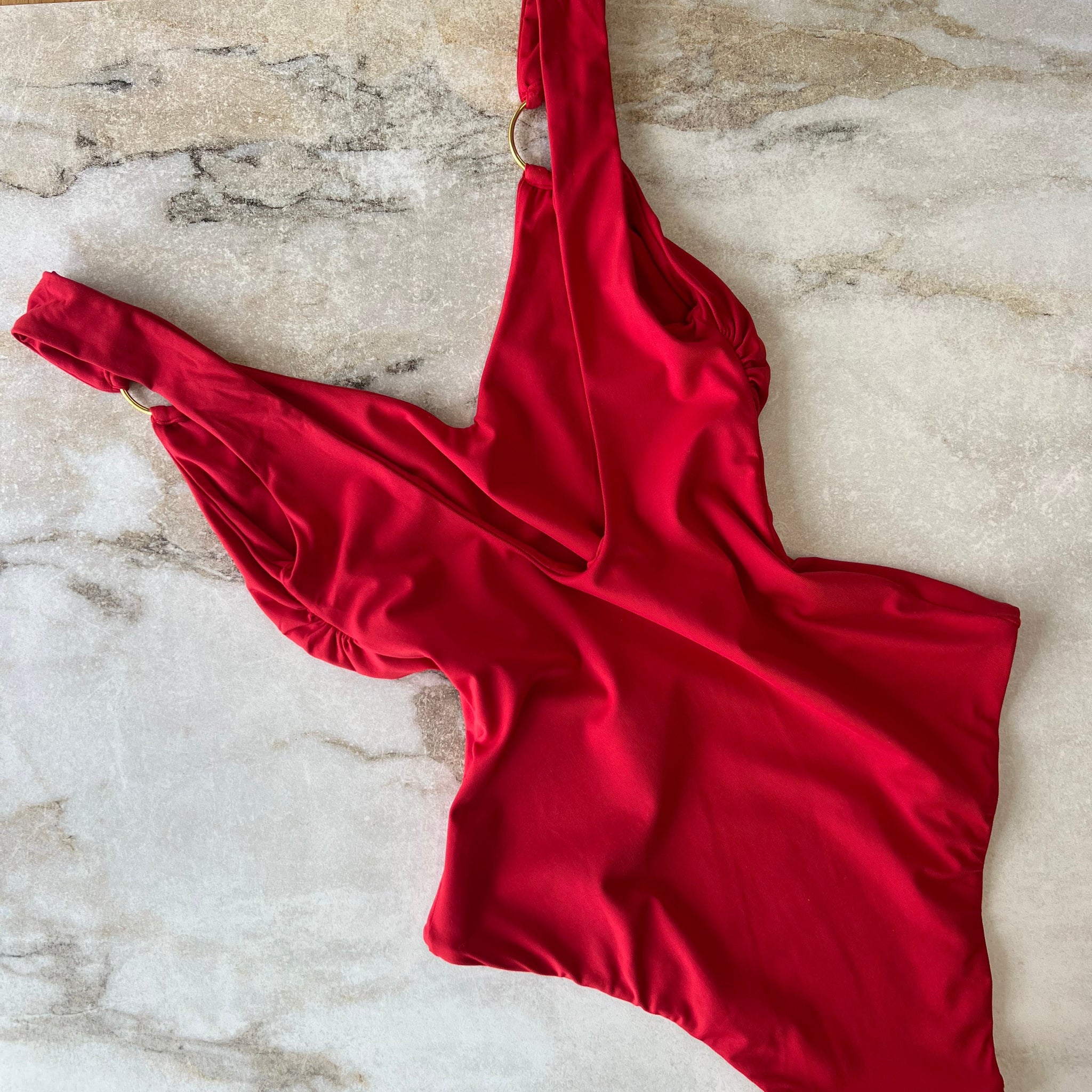 Maillot de bain une pièce de la marque Calarena avec anneaux dorées décoratives sur les bretelles. Le dos arrondi et le décolleté légèrement échancré apportent une touche de raffinement, tandis que le jeu de contrastes entre la matière et l’accessoire confère tout son caractère à cette pièce idéale pour briller sous le soleil d’été. D'une valeur de 375$.