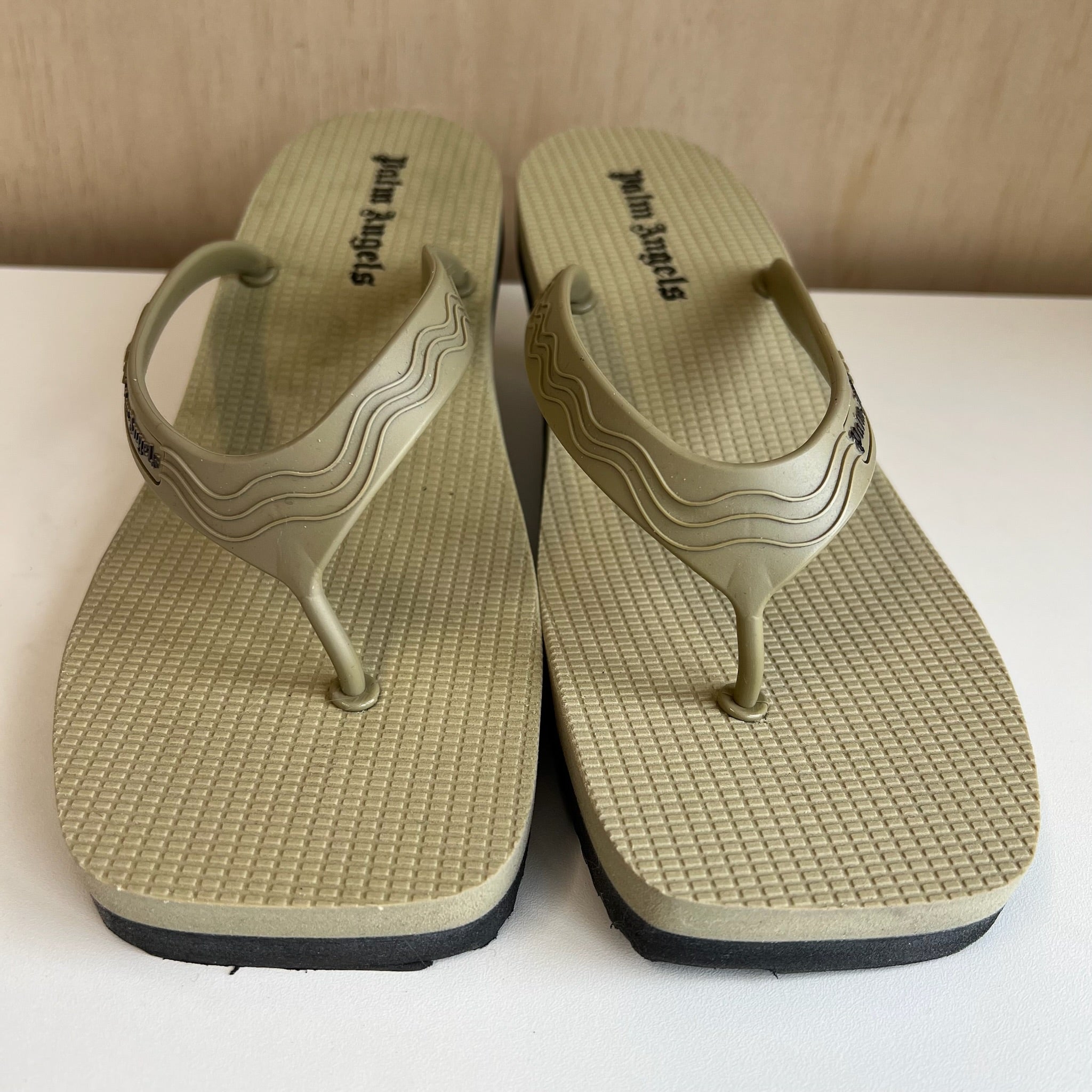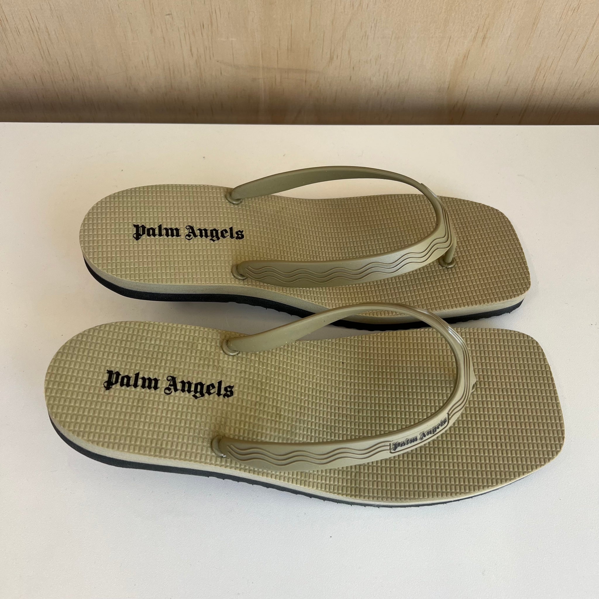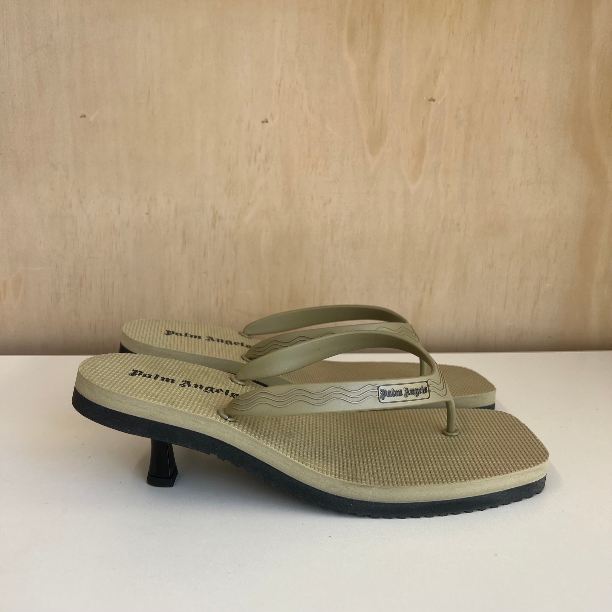 Sandales à talon de la marque Palm Angels. Sandales en mousse en caoutchouc à talons en kaki. Pointe carré ouvert. Sangles avec logo embossé chez vamp. Semelle en caoutchouc à semelles de bande de roulement noires. Talons kittens heels. D'une valeur de 360$.