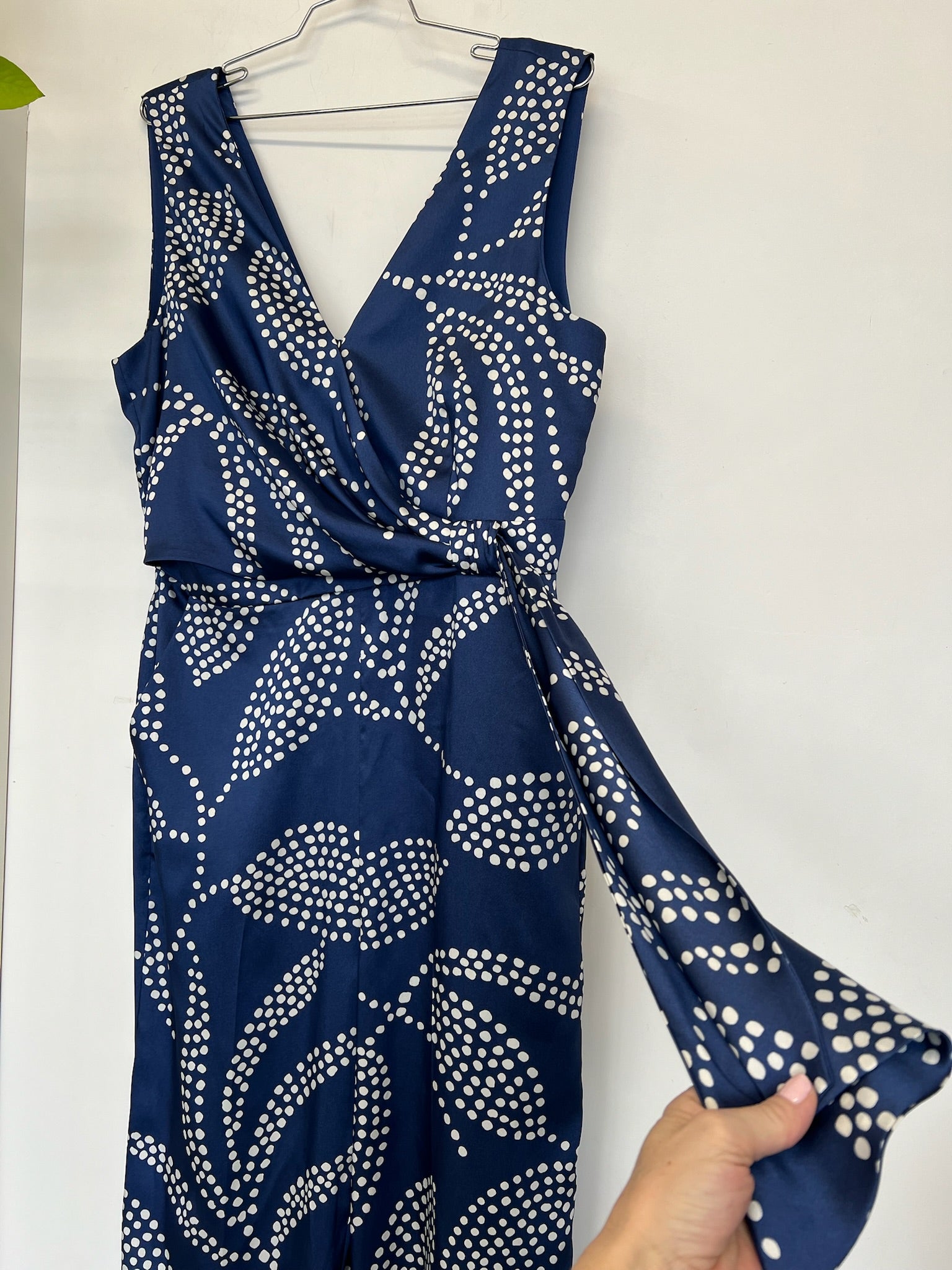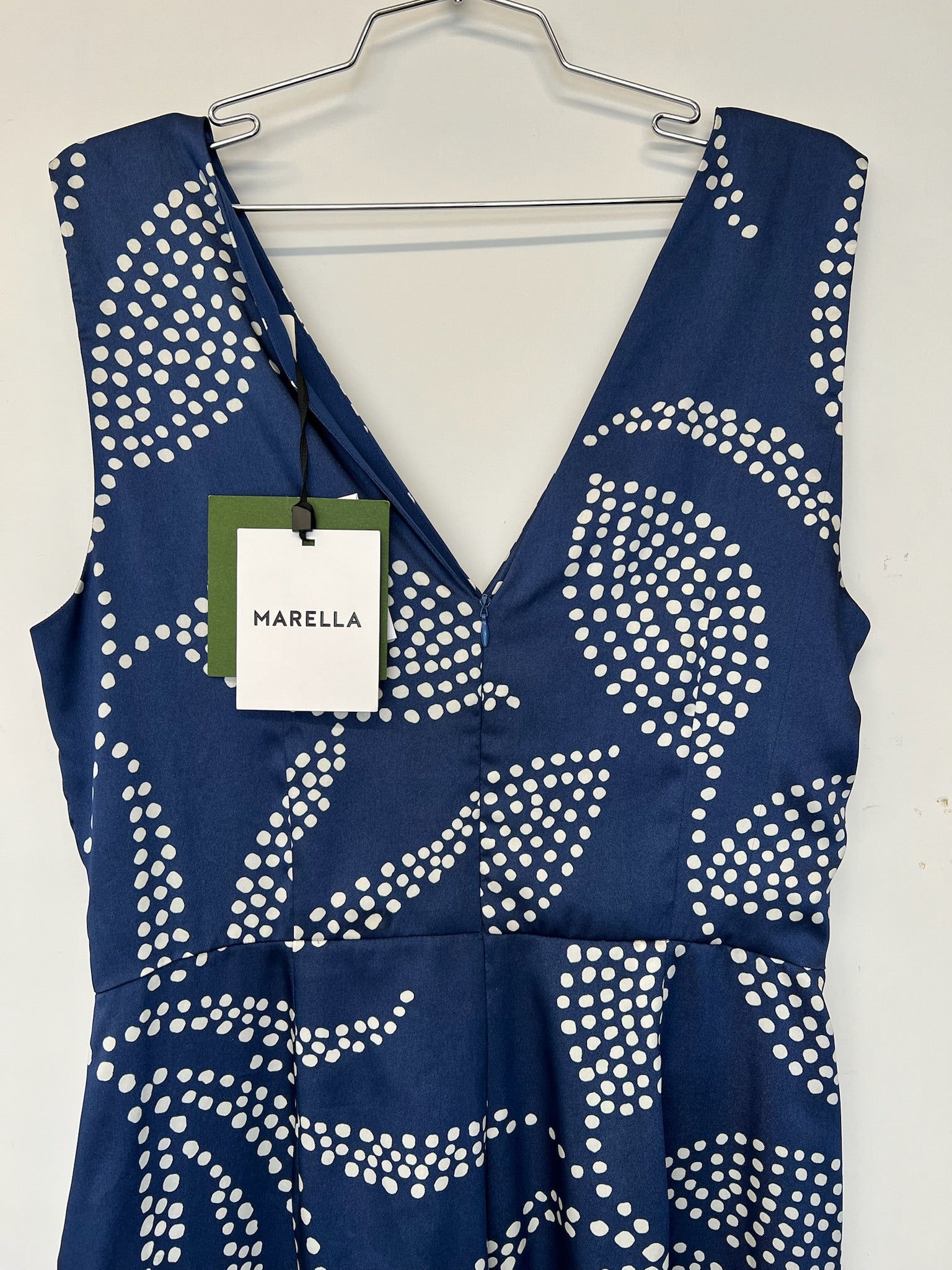 Combinaison une pièce de la marque Marella modèle Micene. Combinaison décontractée en tissu sergé avec taille pince et nœud latéral, jambes larges. Modèle sans manches avec un col en V devant et arrière. Fermeture éclair dissimulée à l’arrière et poches inclinées. Détail de plis pressés à l’avant et à l’arrière. tissu contient des fibres de polyester ou de polyamide récupérées issues de matériaux plastiques recyclés. D'une valeur de 595$