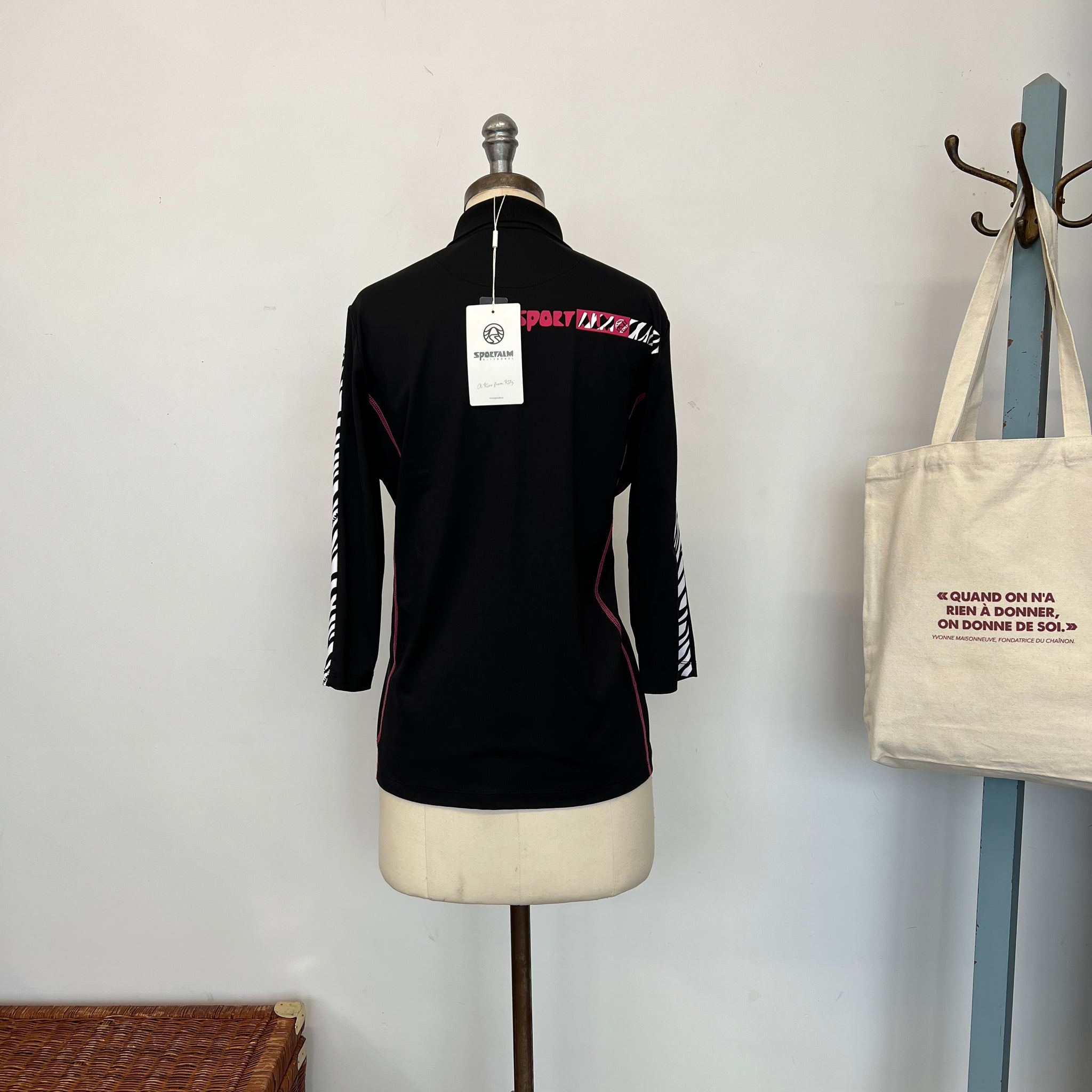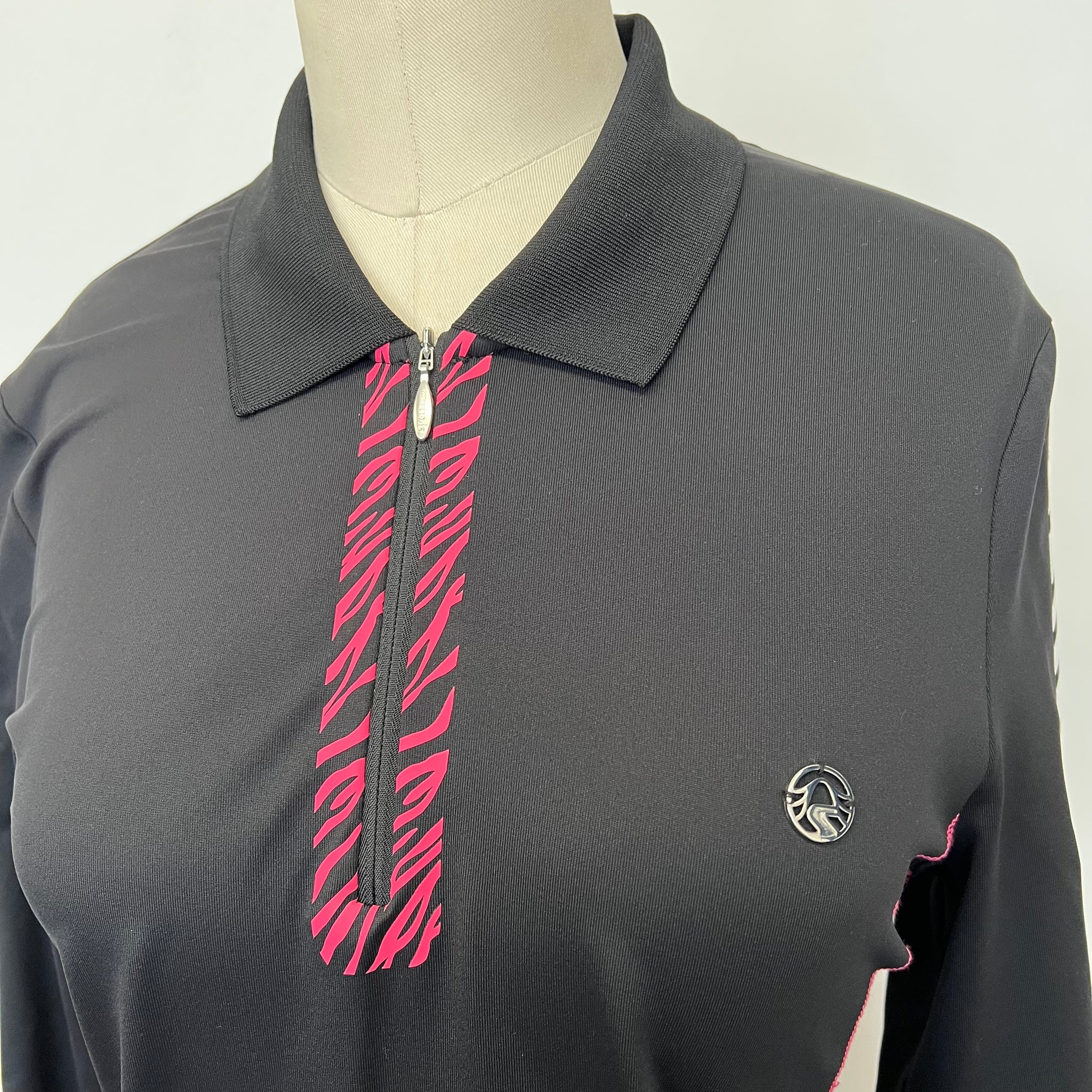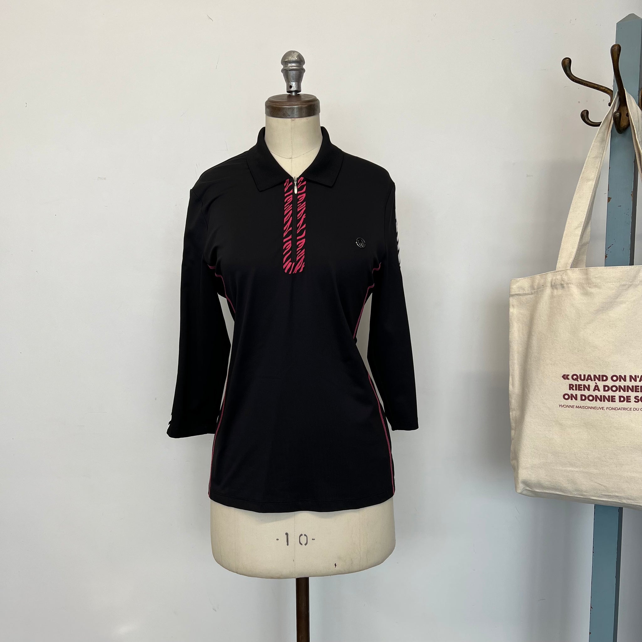 Chandail sport en tissu extensible. Style golf. Avec fermeture éclair au collet, manches 3/4. Avec imprimé zébré. D'une valeur de 350$.
