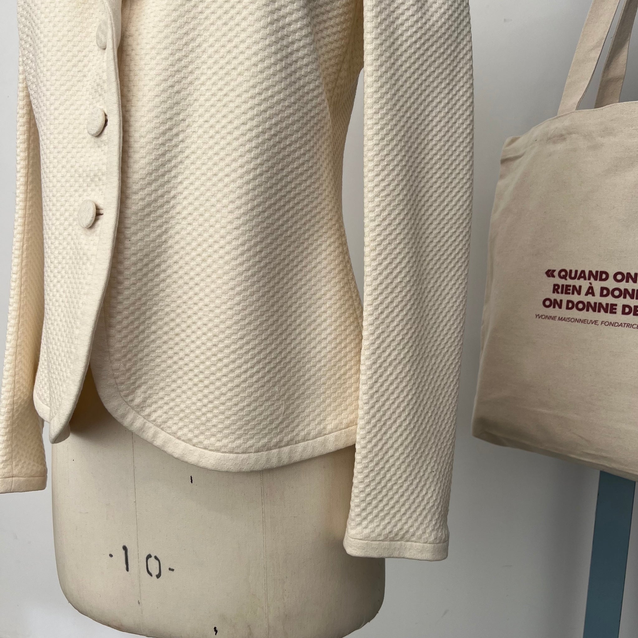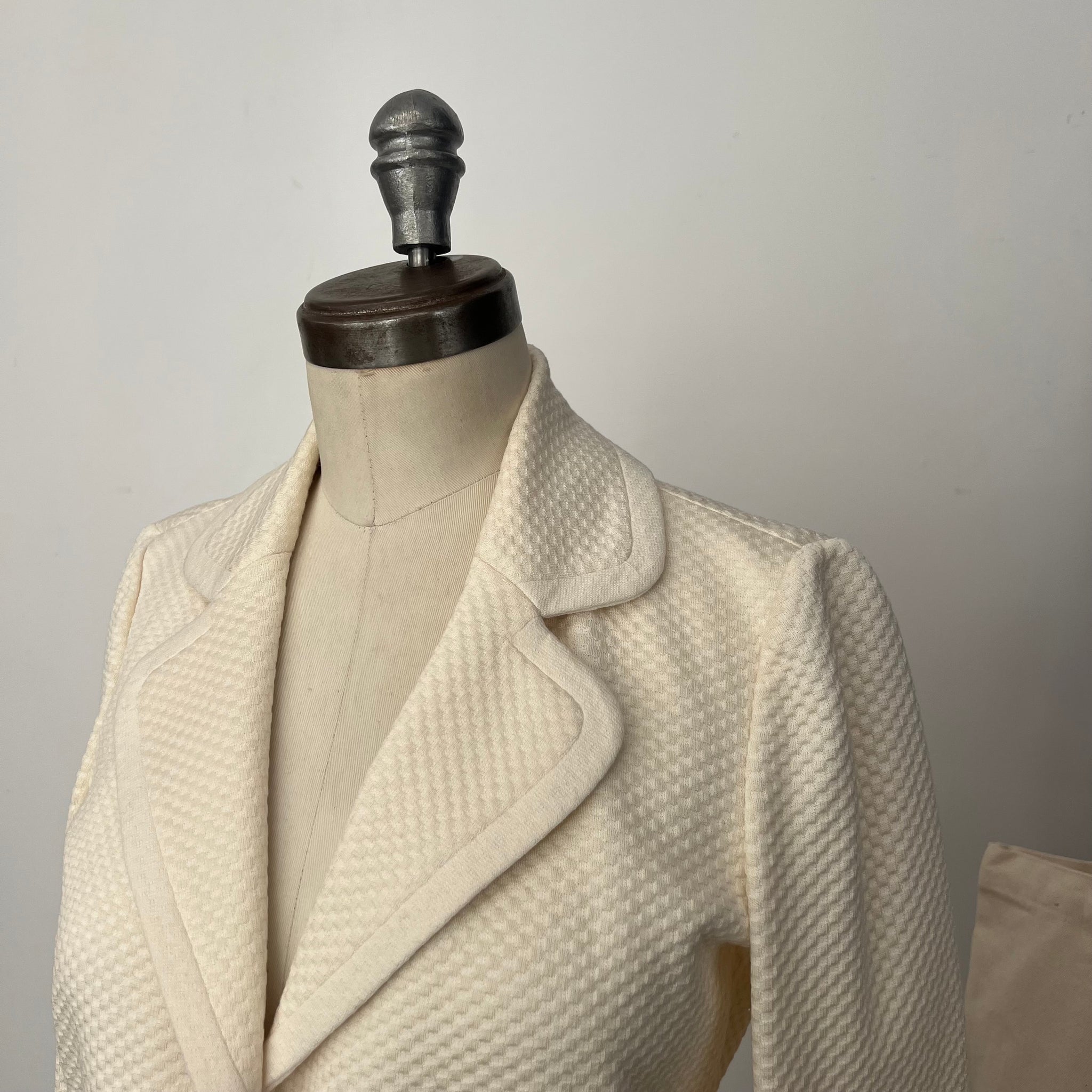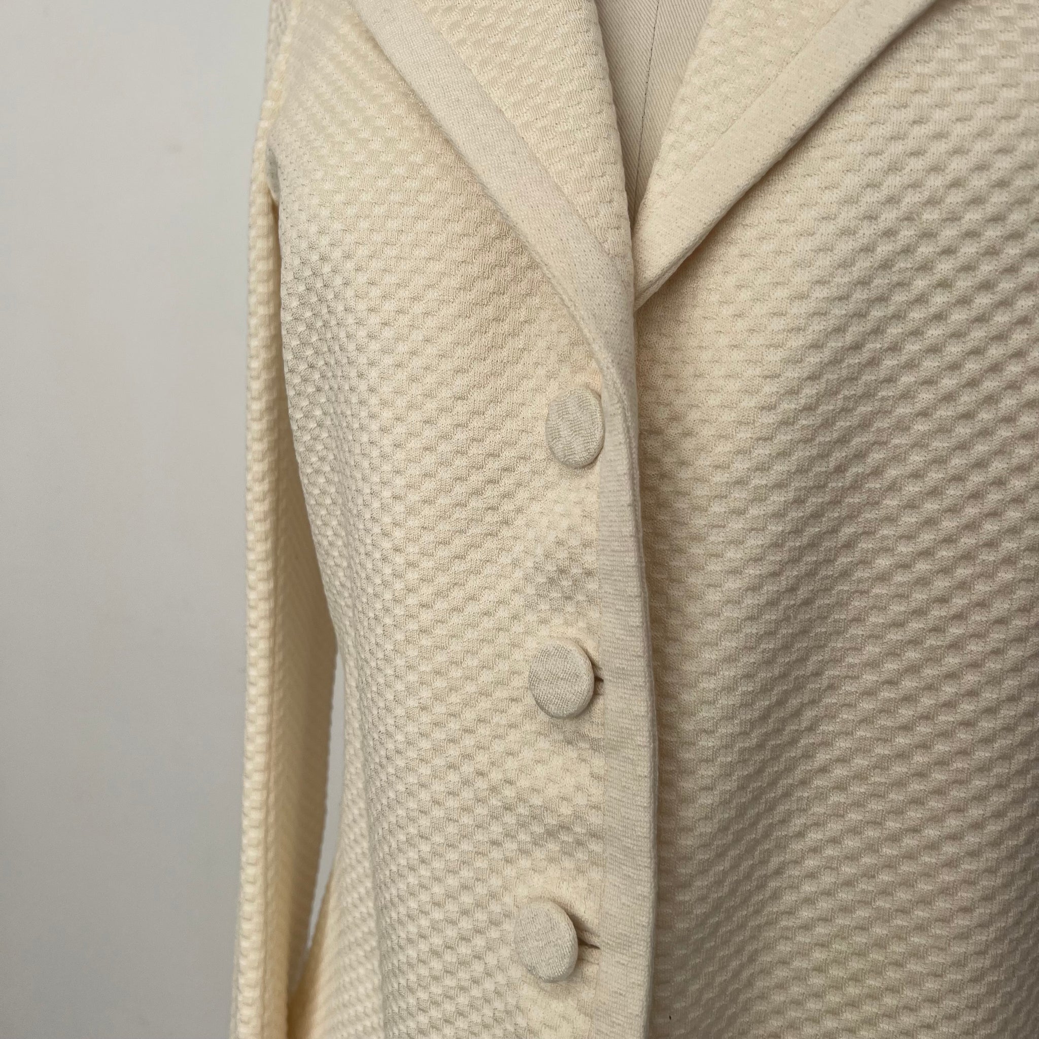 Magnifique veston de la marque Giorgio Armani. Tissu assez épais mais non doublé très confortable et doux. Avec motif texturé rond. S'attache avec 3 jolies boutons.