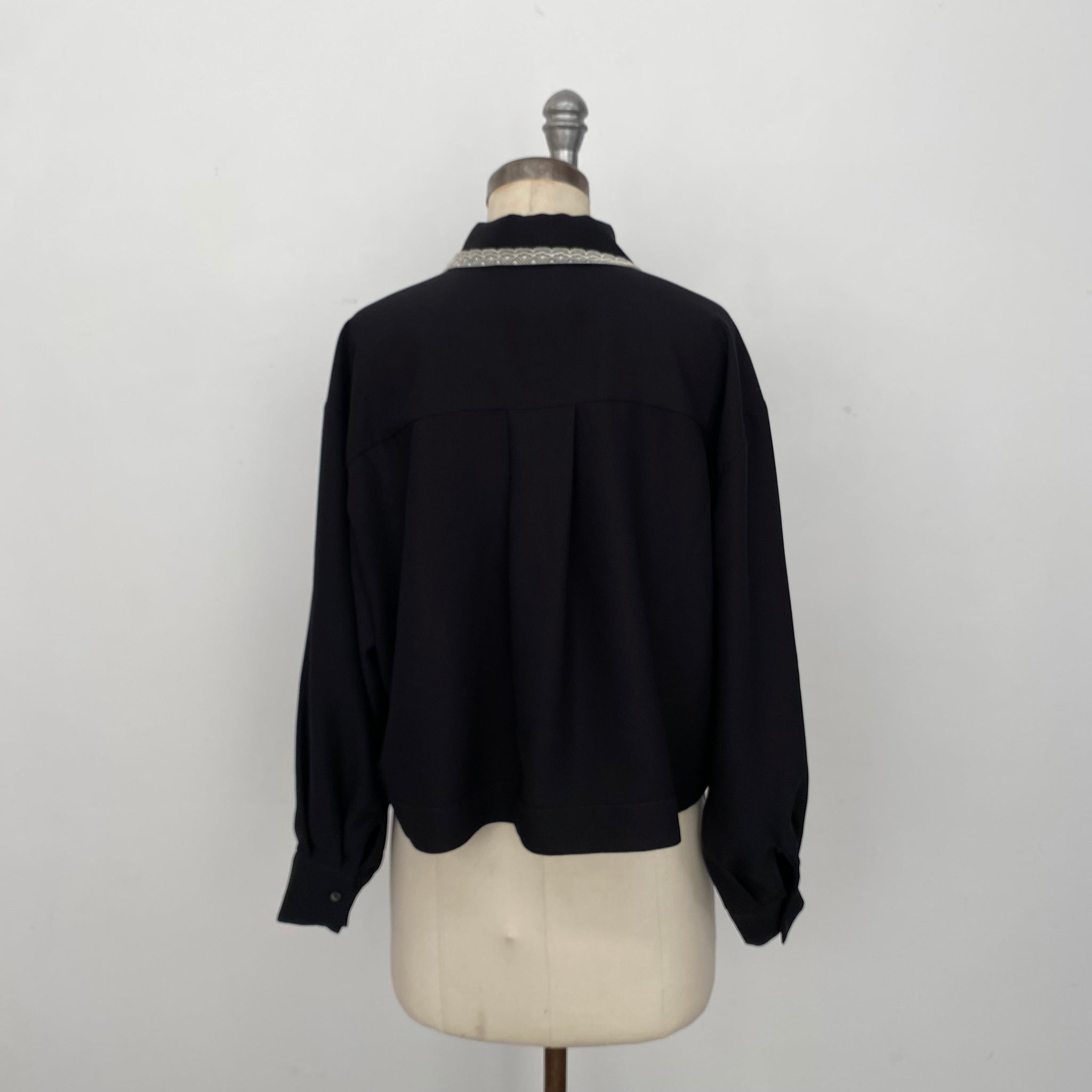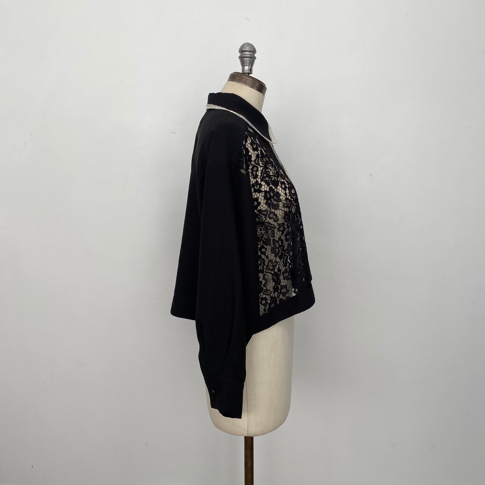 Blouse courte avec dentelle signée Co|te. Colet classique, fermeture boutonnière et un bouton aux poignets. Dentelle transparente à l'avant, doublure dans le dos. D'une valeur de 675$.n