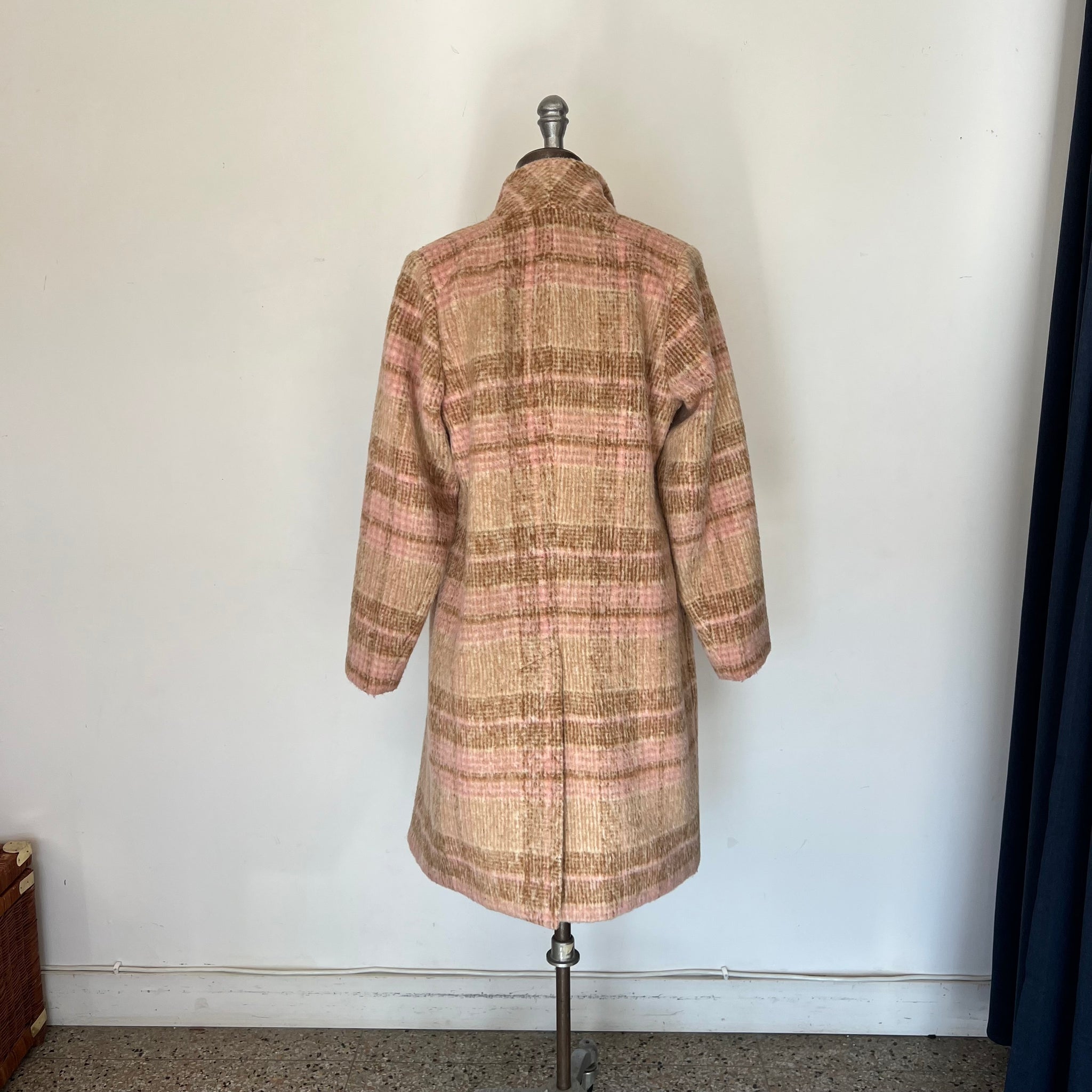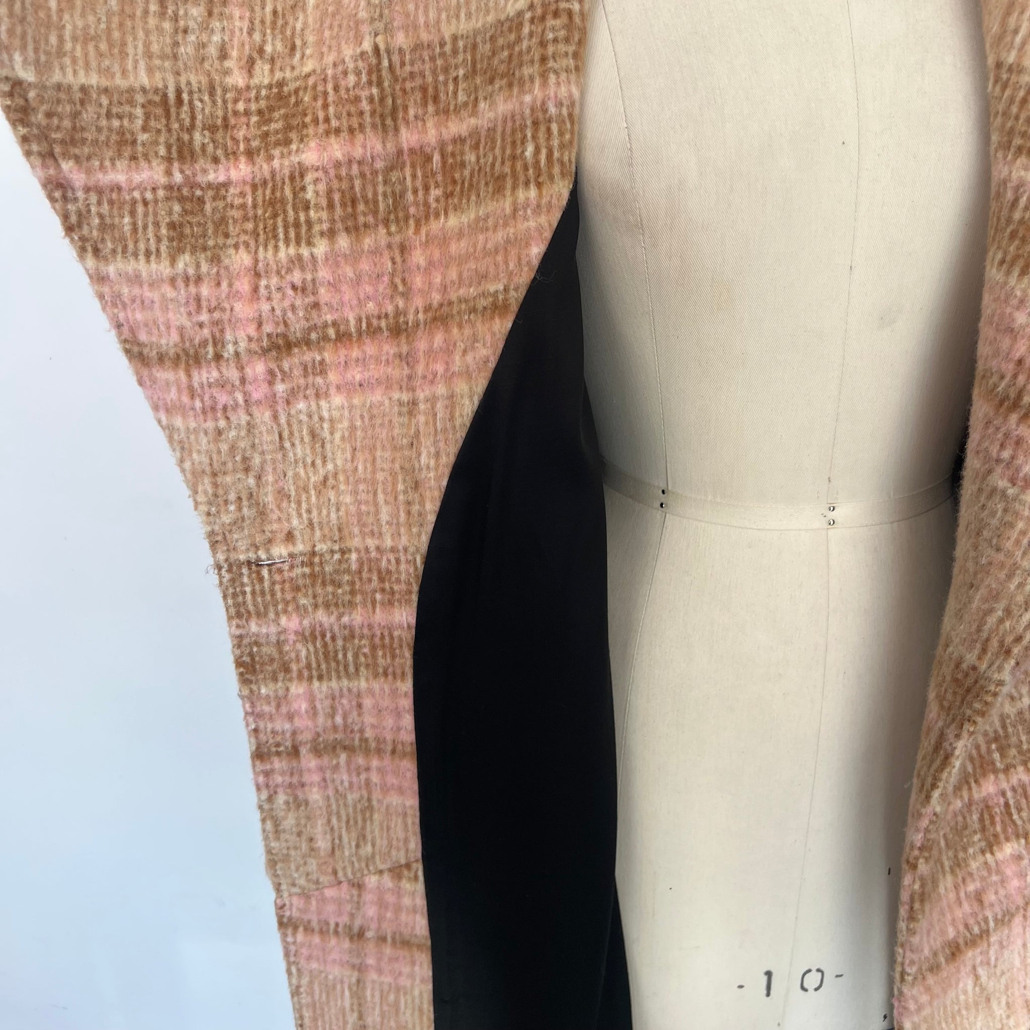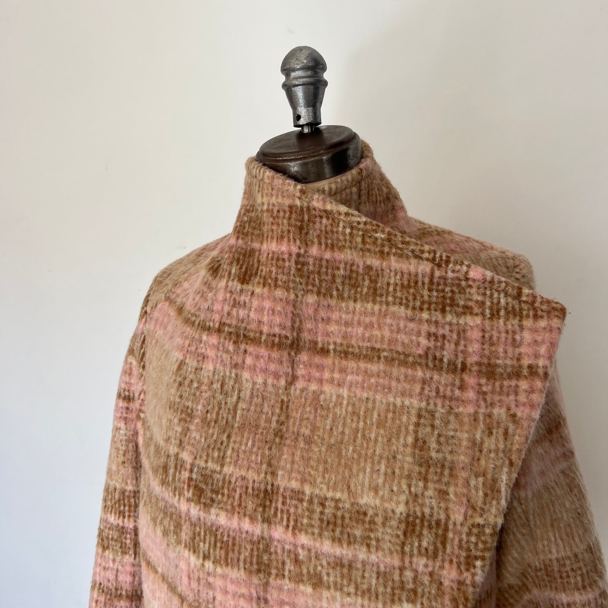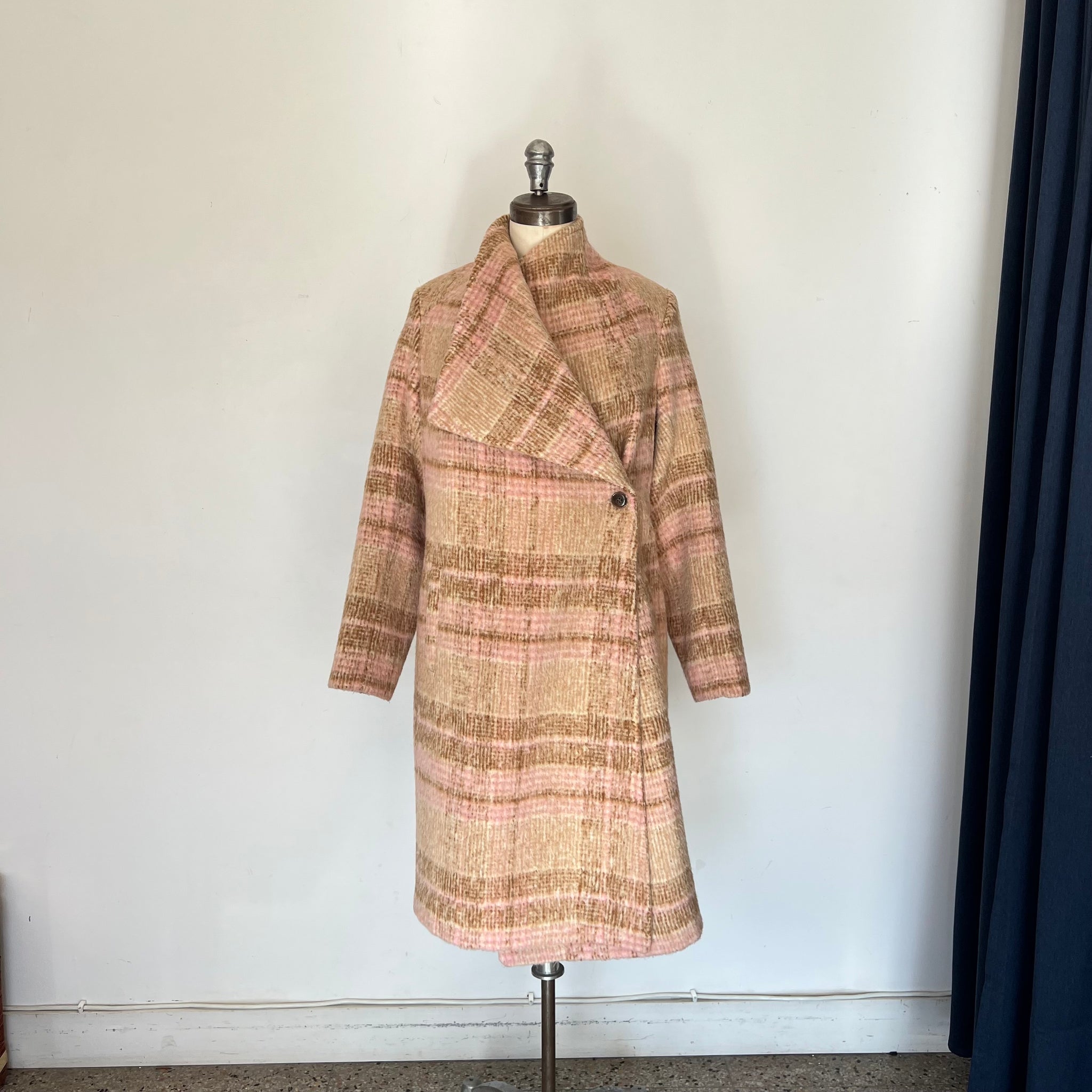 Long manteau légèrement asymétrique en laine façon trench coat de la marque canadienne FurLux. Avec poches latérales, fente centrale à l'arrière, s'attache avec un bouton à l'avant (choix de 2 boutons).
