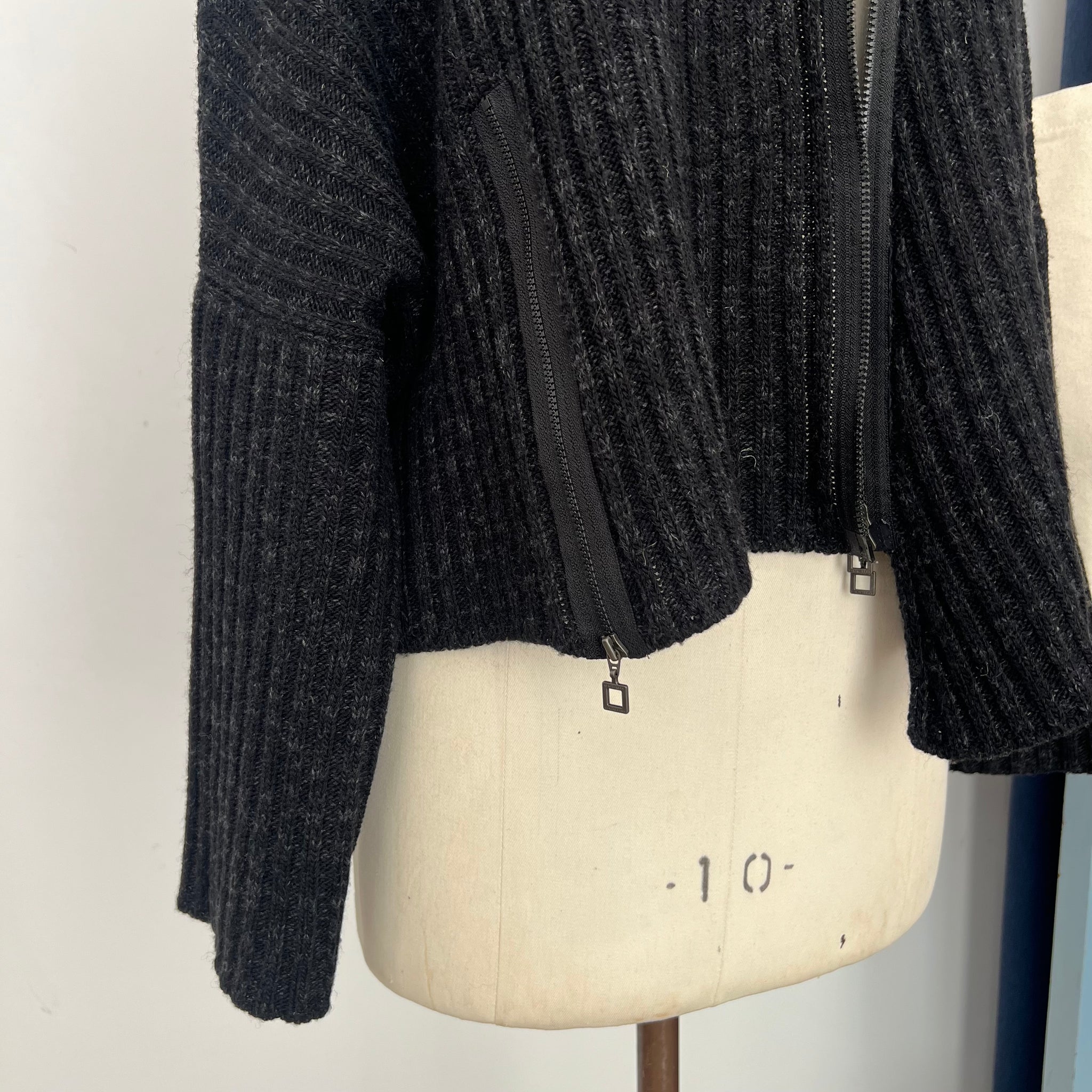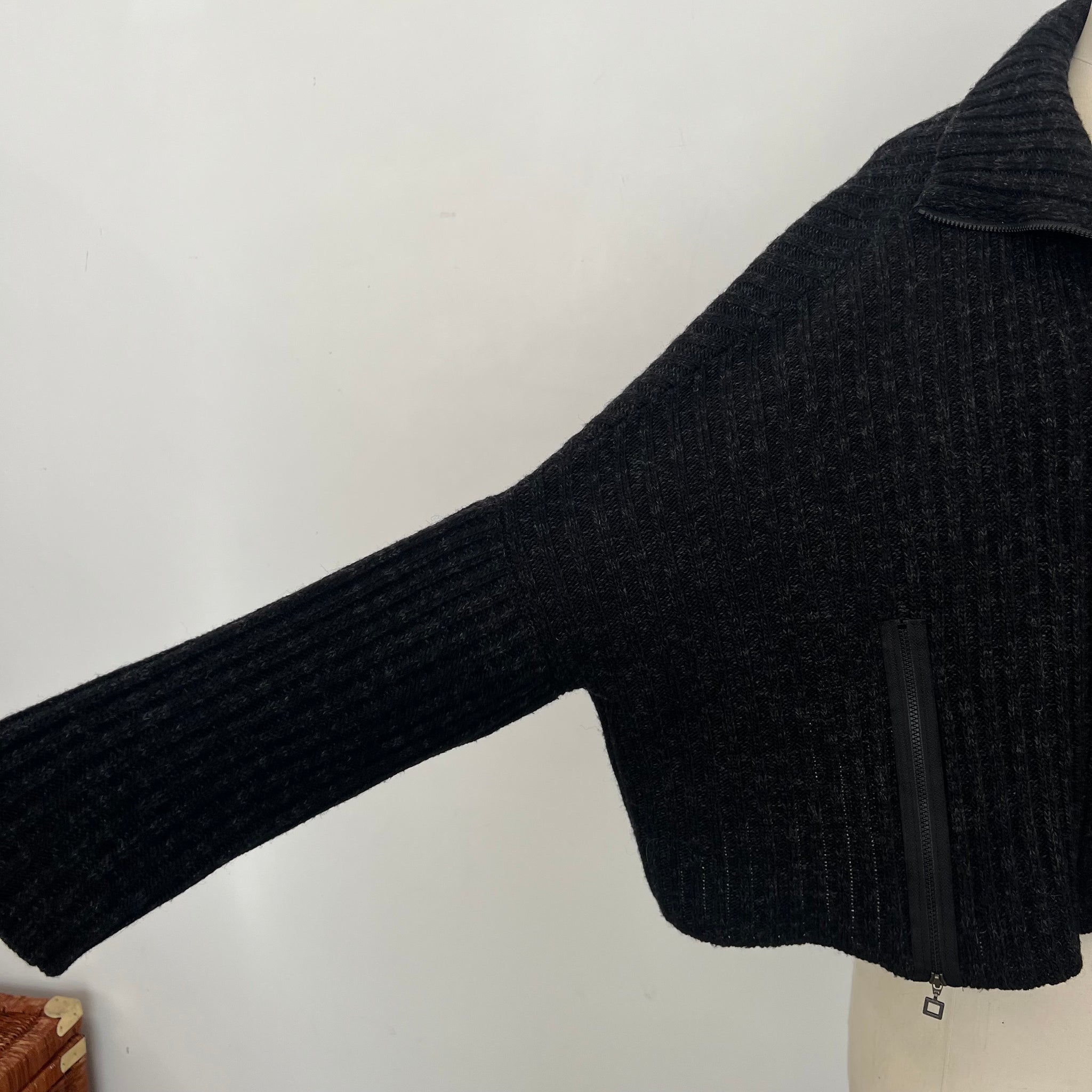 Magnifique veste en laine asymétrique de la marque Sarah Pacini. Avec fermeture éclair qui monte jusqu'au col, une poche d'une coté et de l'autre une fermeture éclair avec tissu comme une extension du gilet. Manches amples, tissu côtelé.