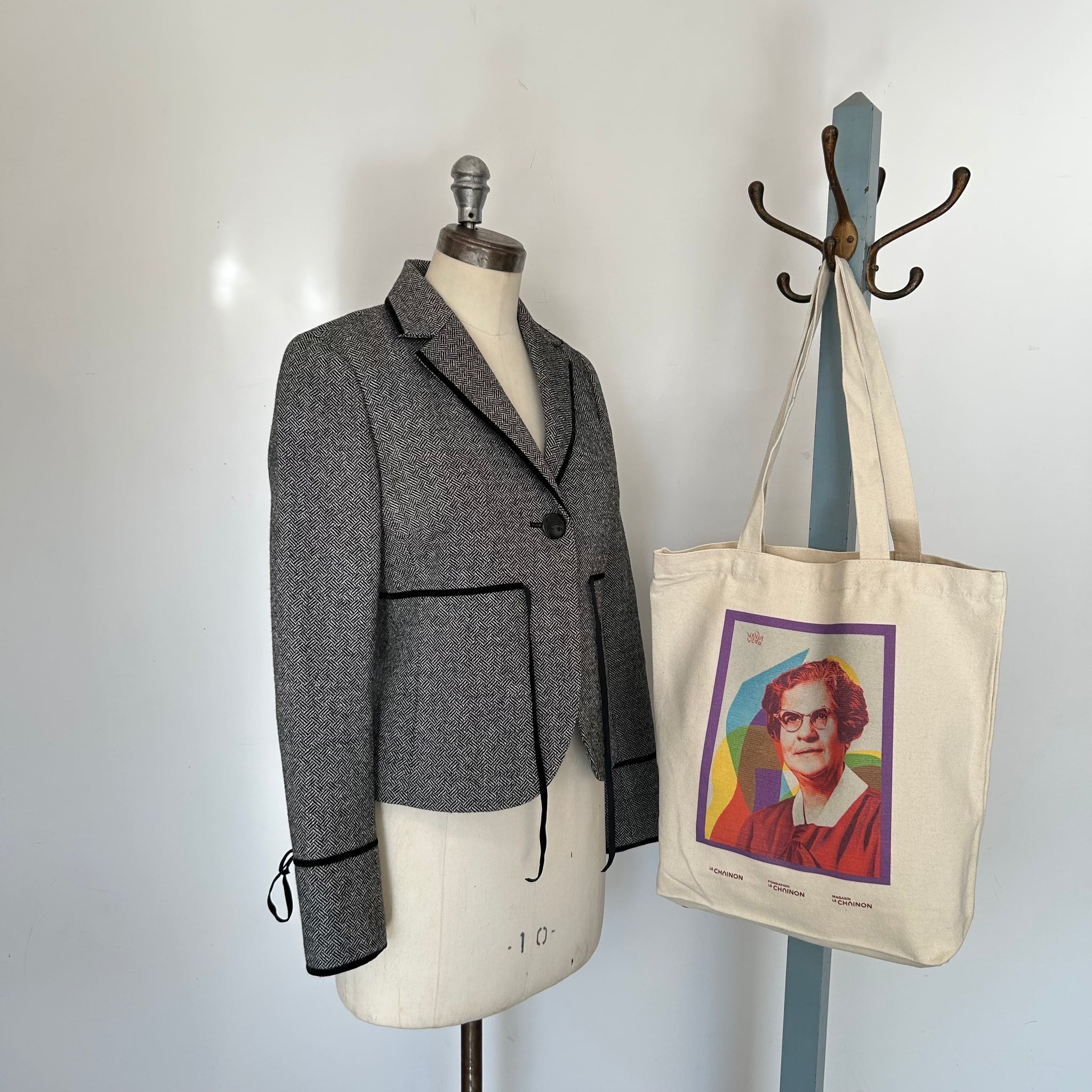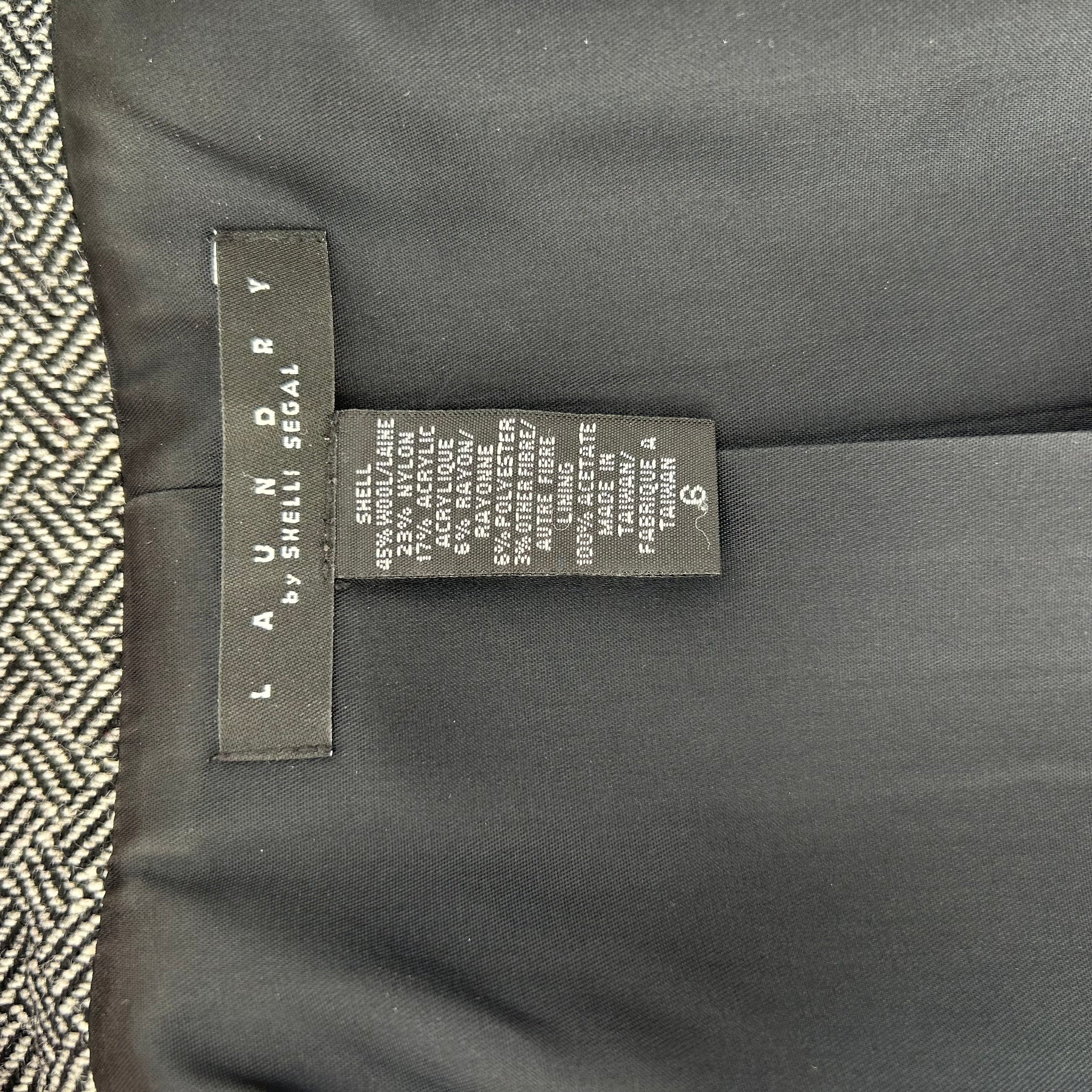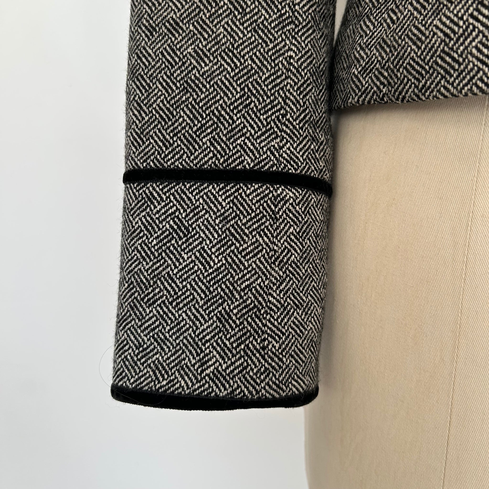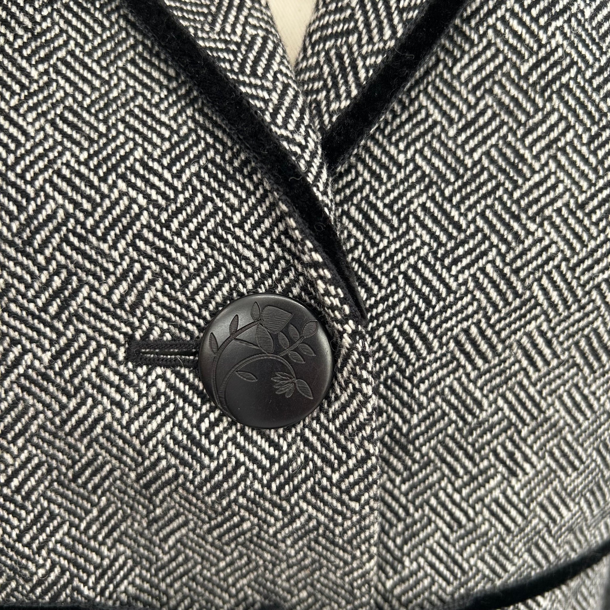 Veston court de la marque Laundry by Shelli Segal. Tissu avec mince doublure. S'attache avec un gros bouton et une petite ficelle en velours. Minces épaulettes intégrées. Finition en velours sur le collet et le bout des manches et deux petites ficelles sur le poignets pour en faire des boucles.