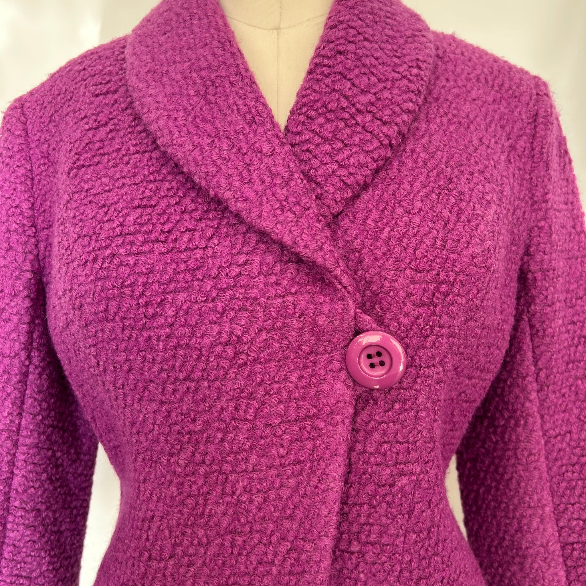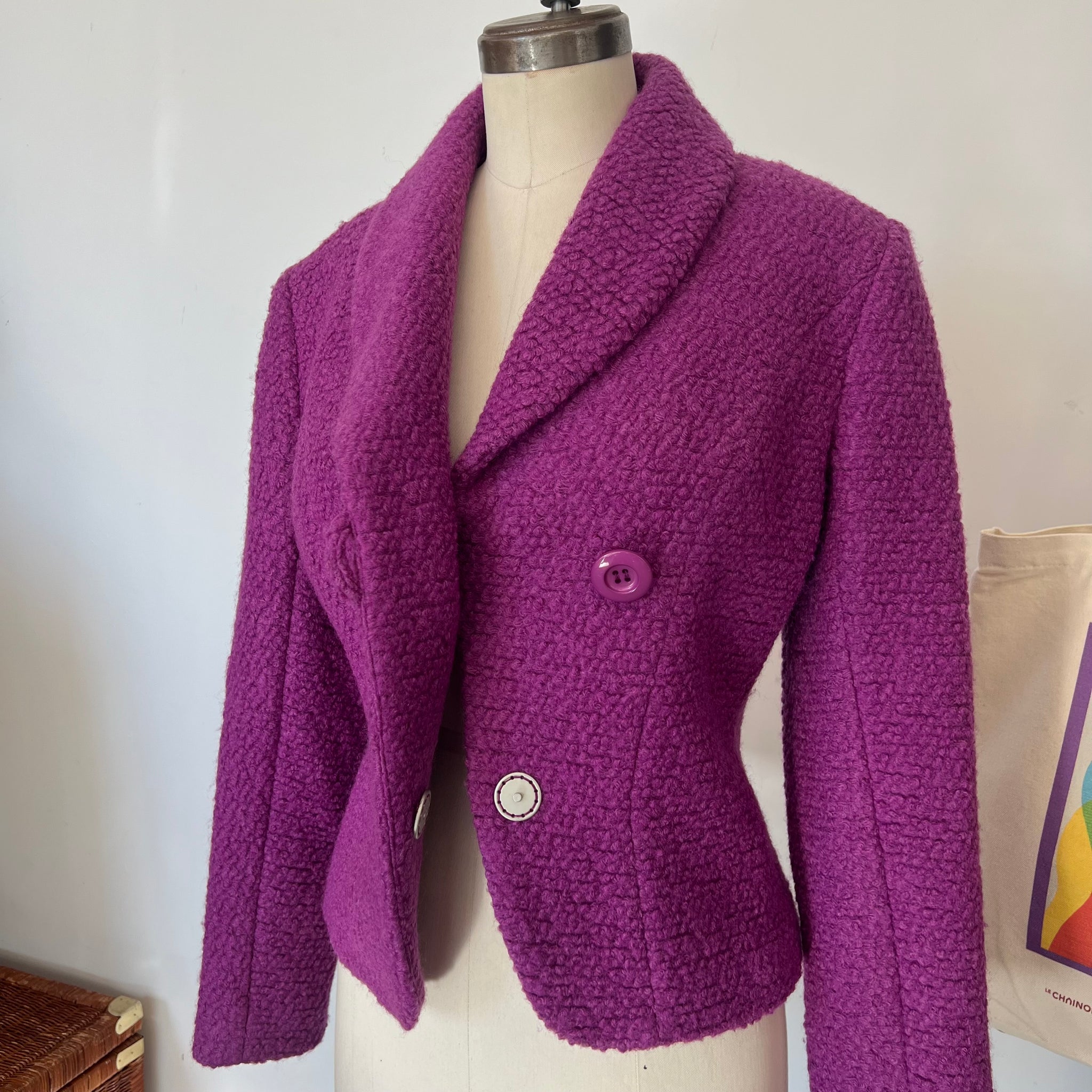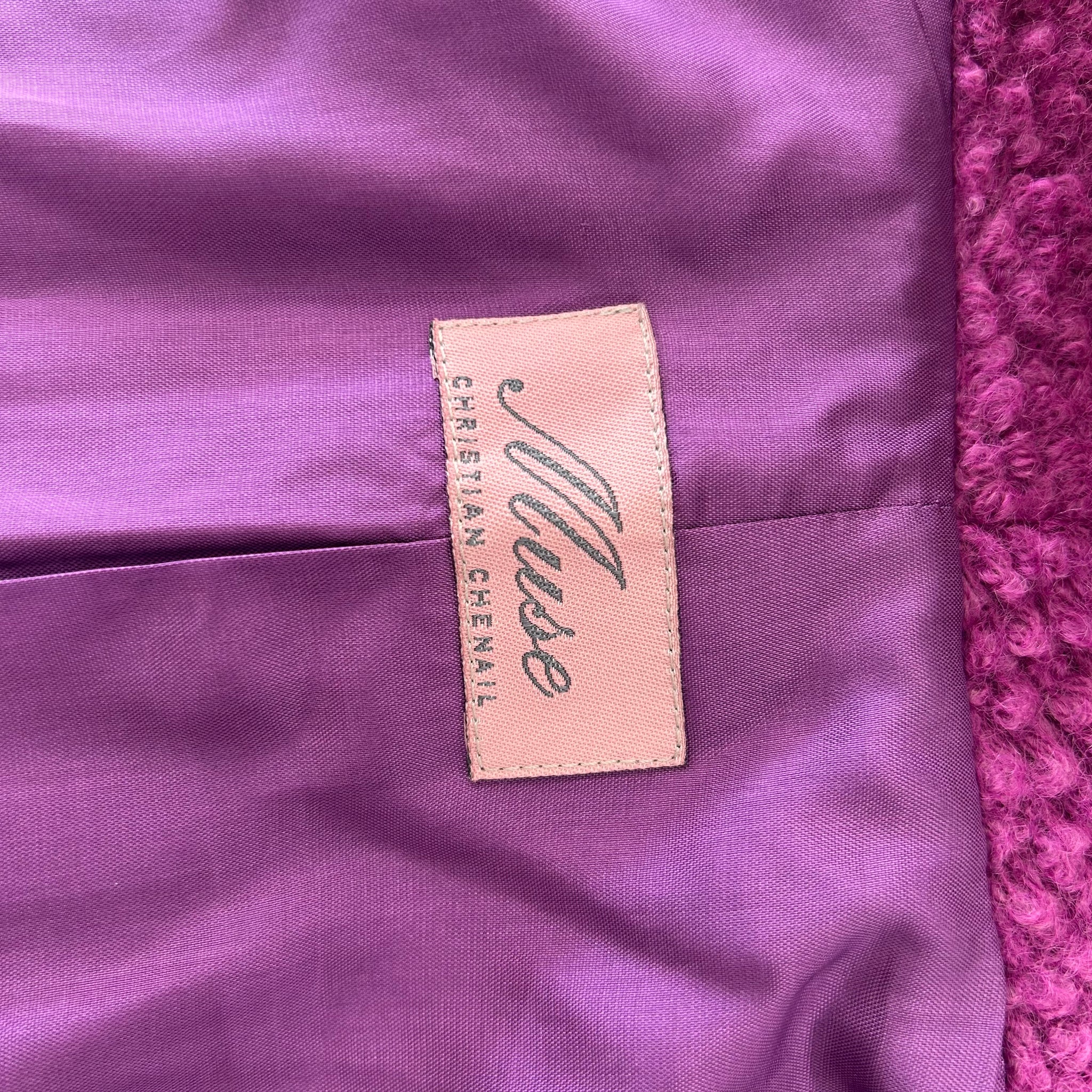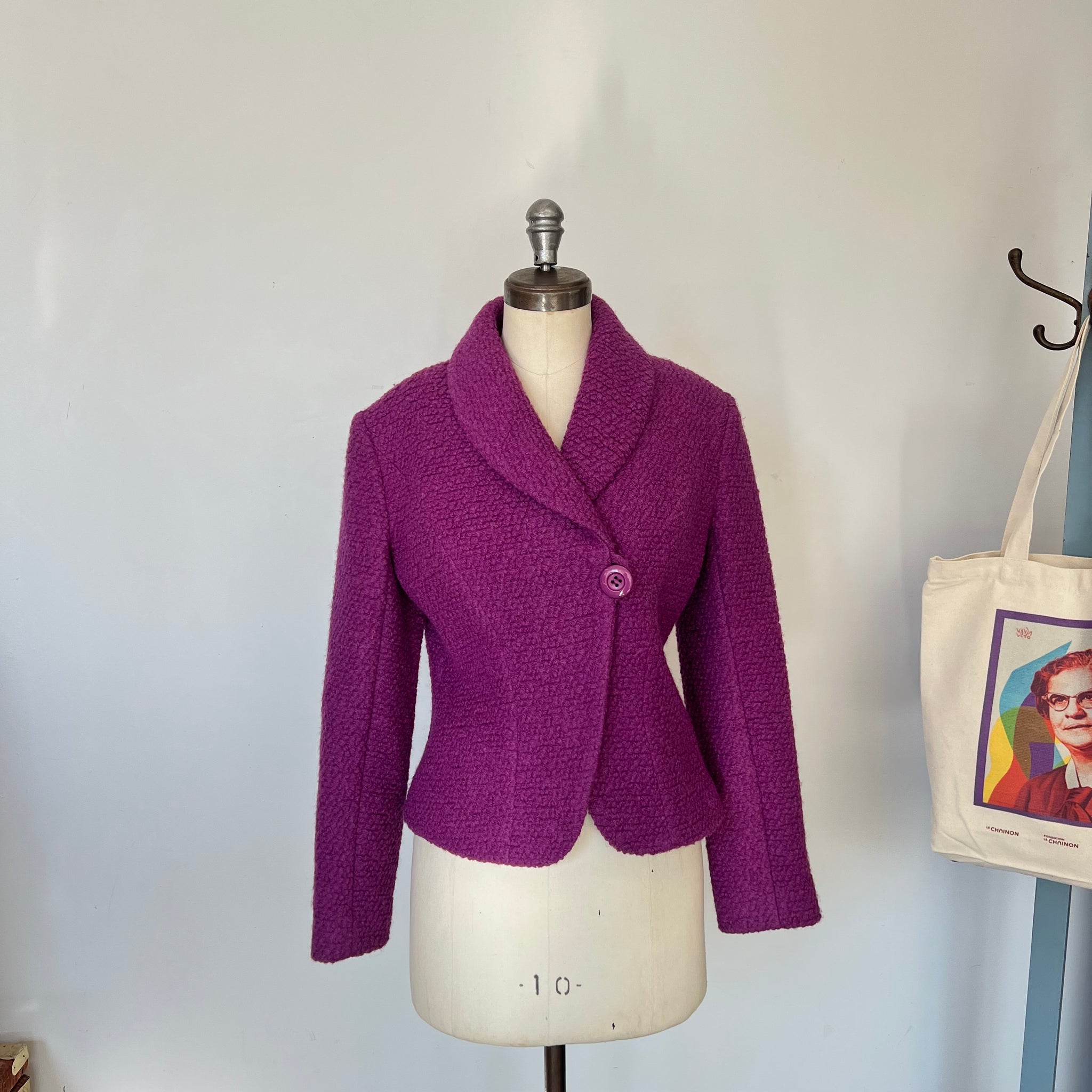 Veston en laine de la marque Muse par Christian Chenail. Tissu molleton avec mince doublure. S'attache avec un gros bouton et un deuxième dissimulé. Petites épaulettes intégrées.
