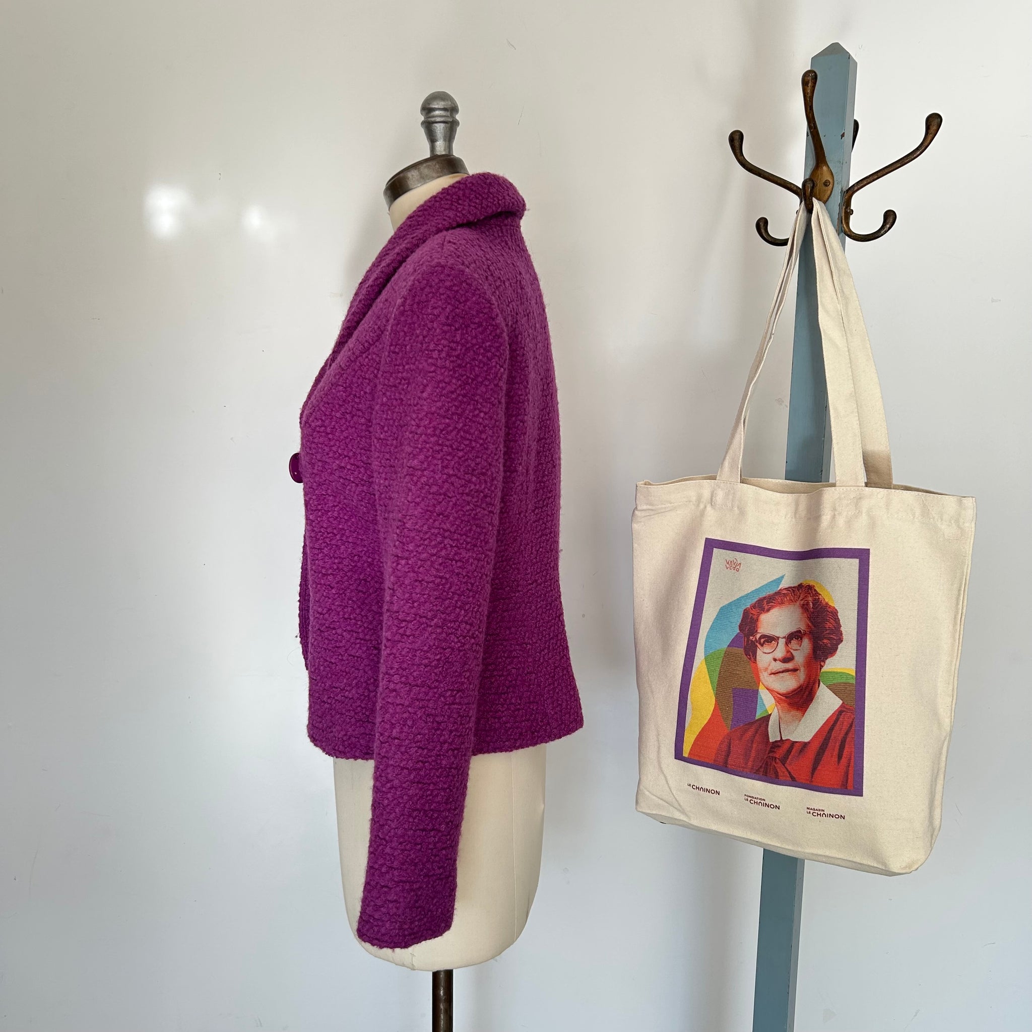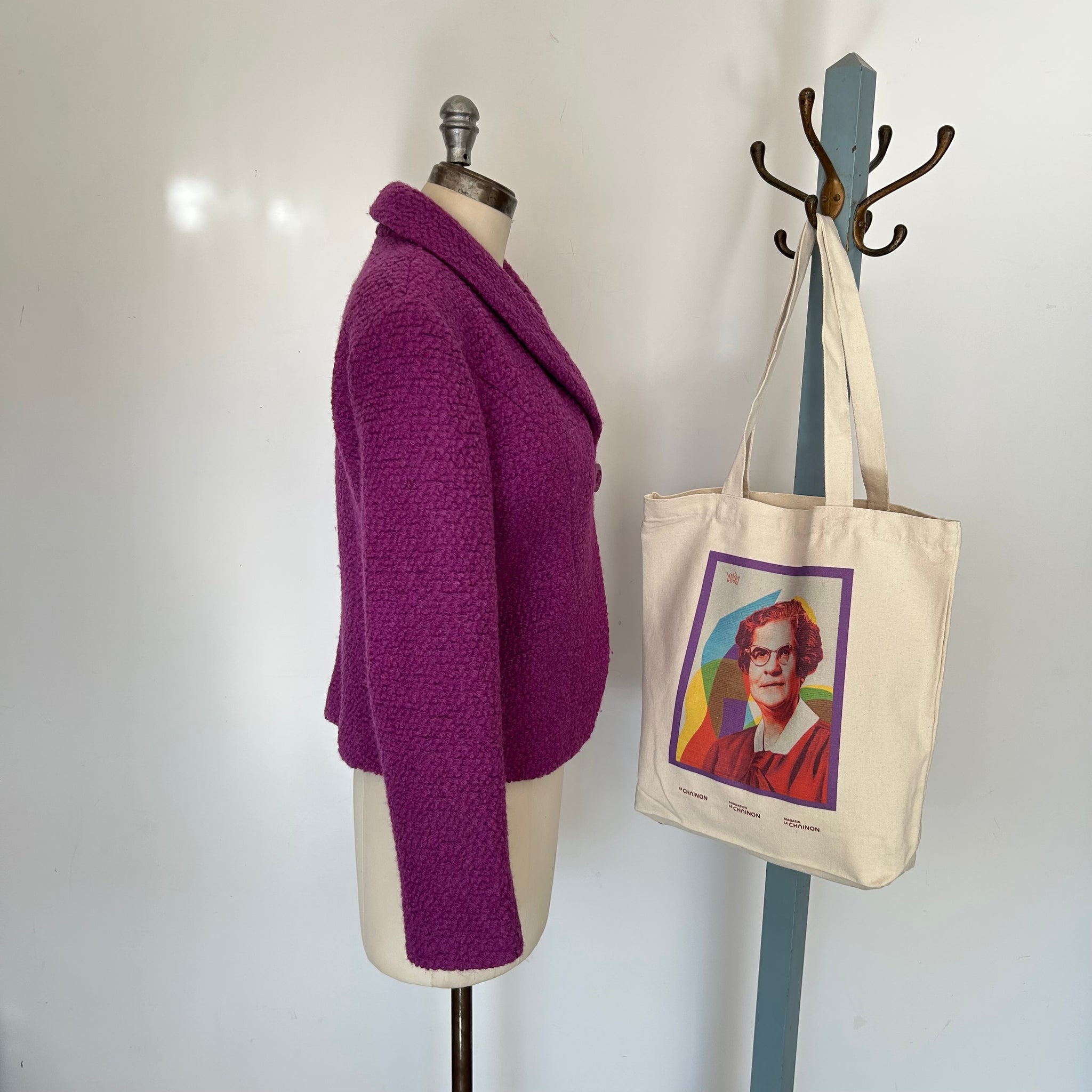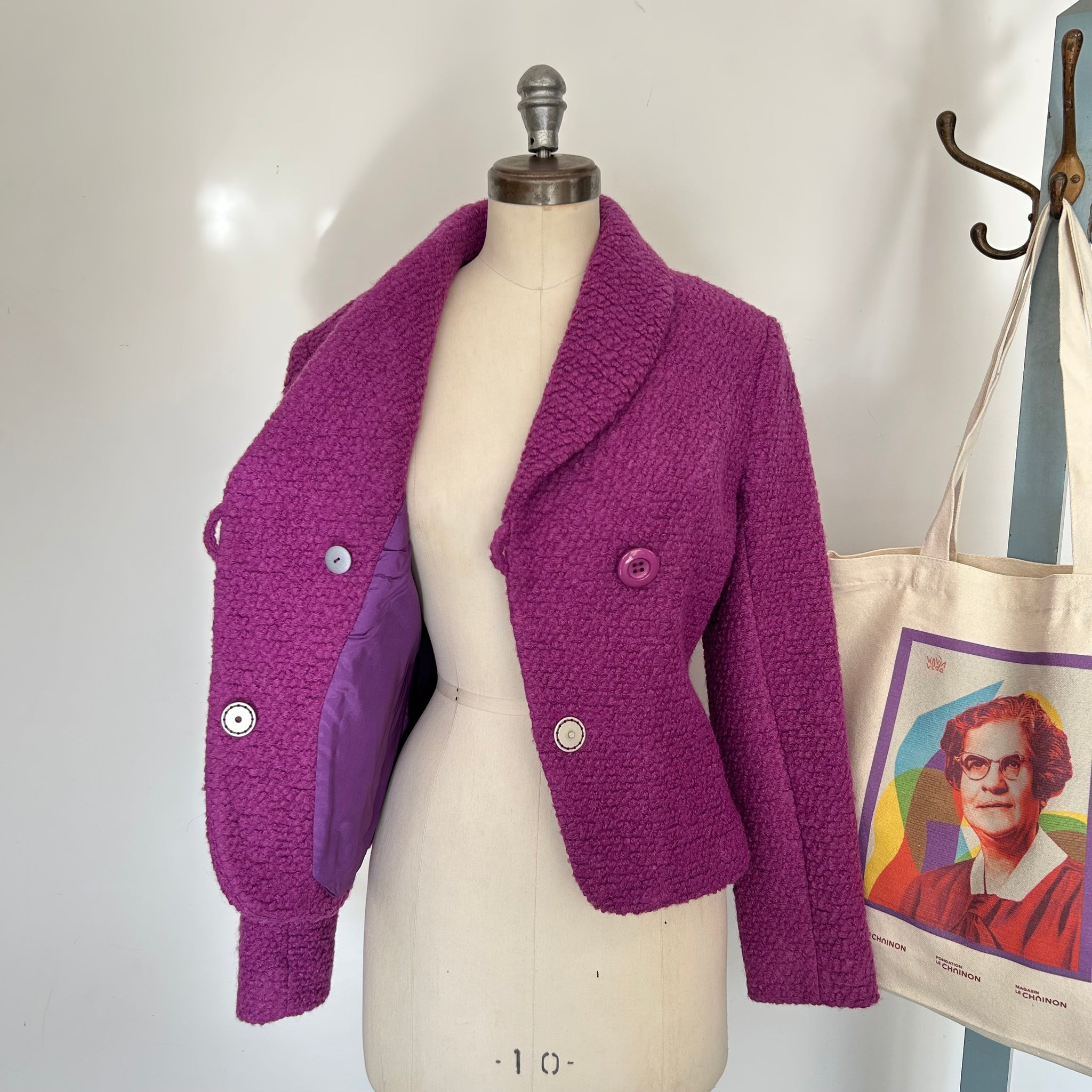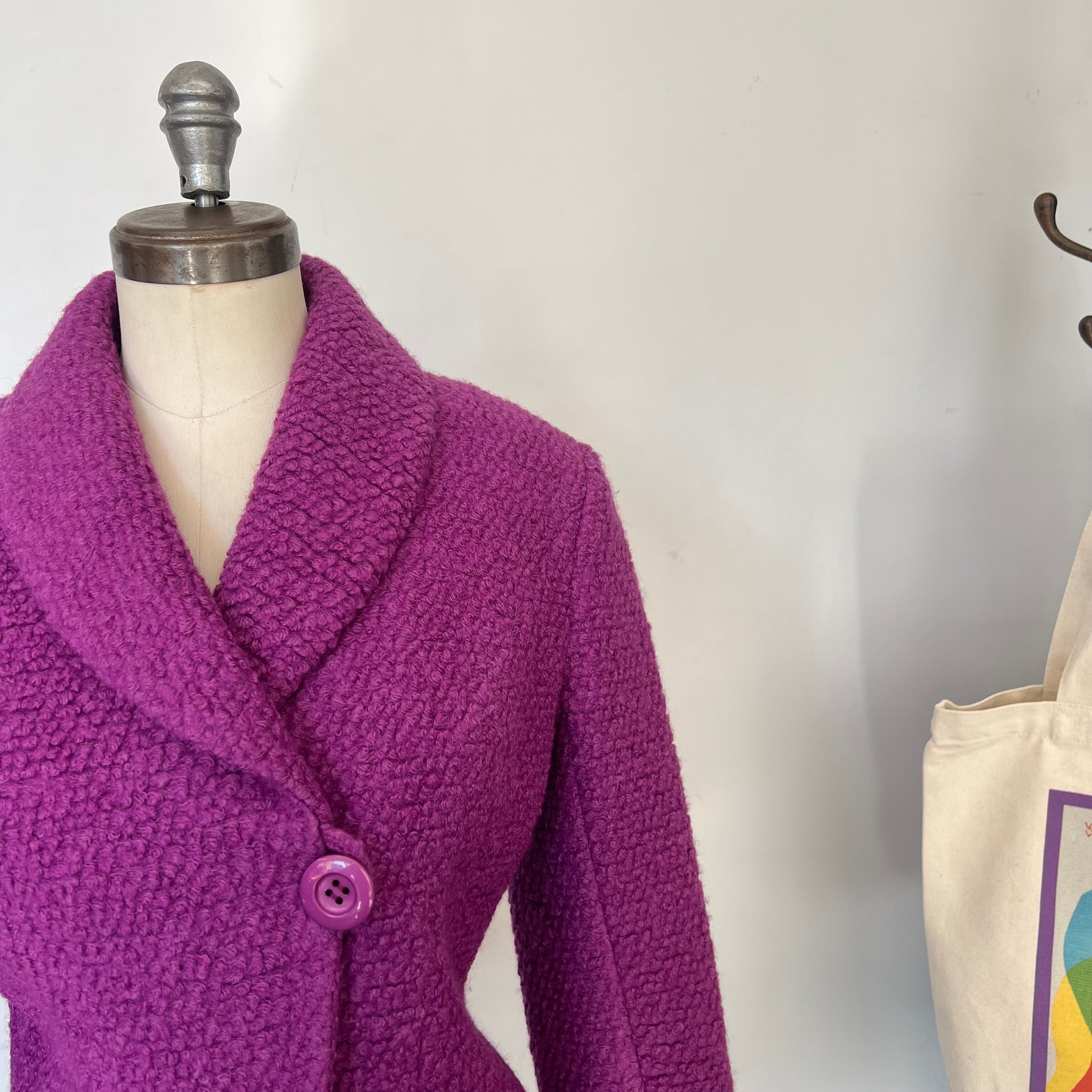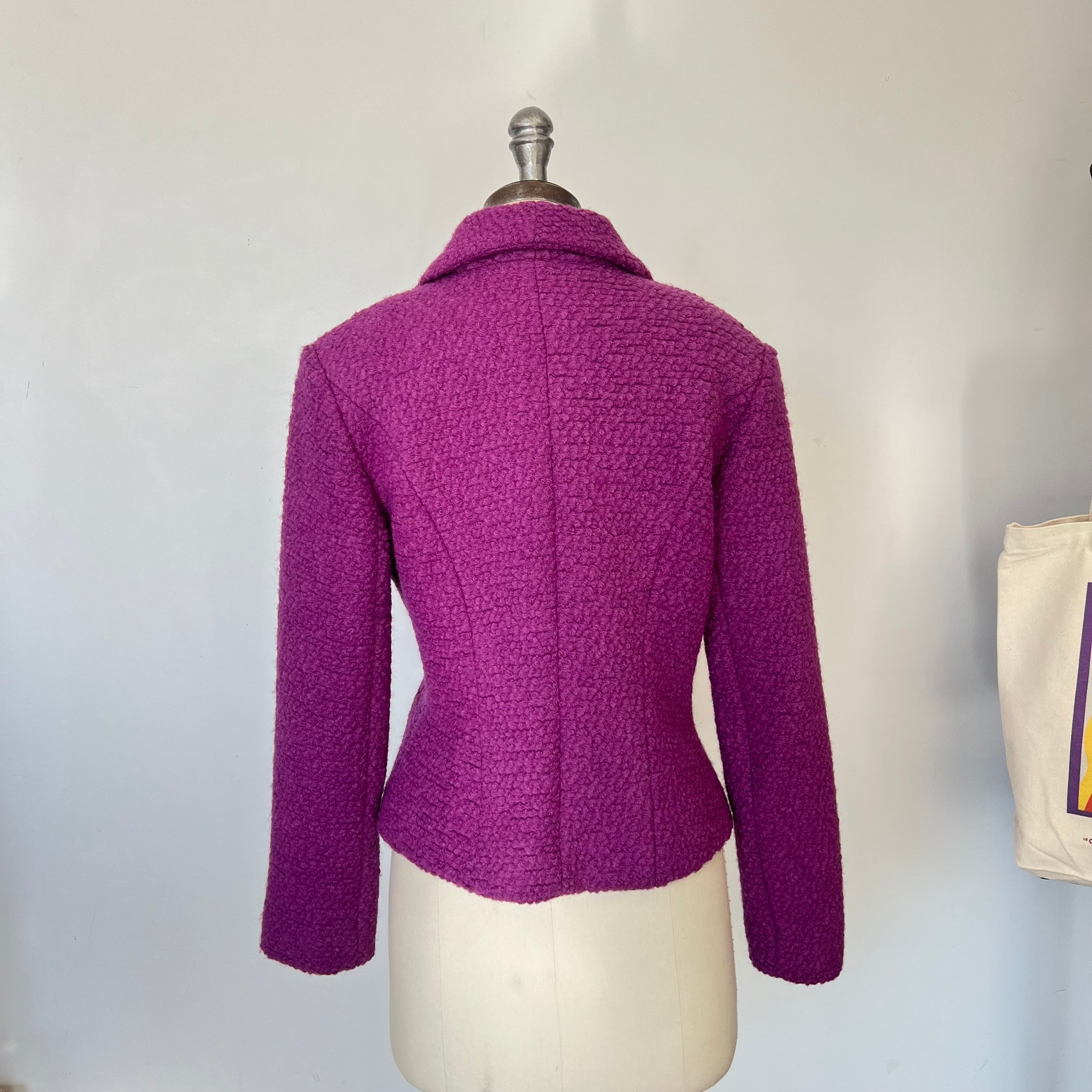 Veston en laine de la marque Muse par Christian Chenail. Tissu molleton avec mince doublure. S'attache avec un gros bouton et un deuxième dissimulé. Petites épaulettes intégrées.