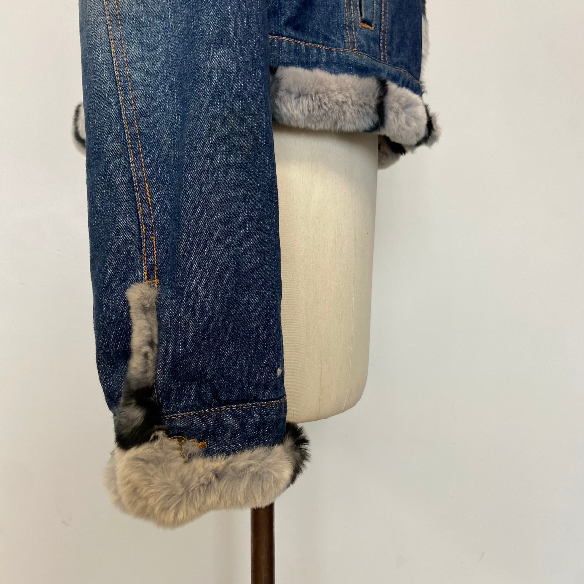 Manteau en jean signé Rebecca, maison parisienne. Col classique se prolongeant en fermeture boutonnée sur le devant. Une poche poitrine boutonnée côté gauche et deux poches avant. Finitions en fourrure douce et élégante au col, à la fermeture, à l’ourlet, à la poche poitrine ainsi qu’aux bas des manches.