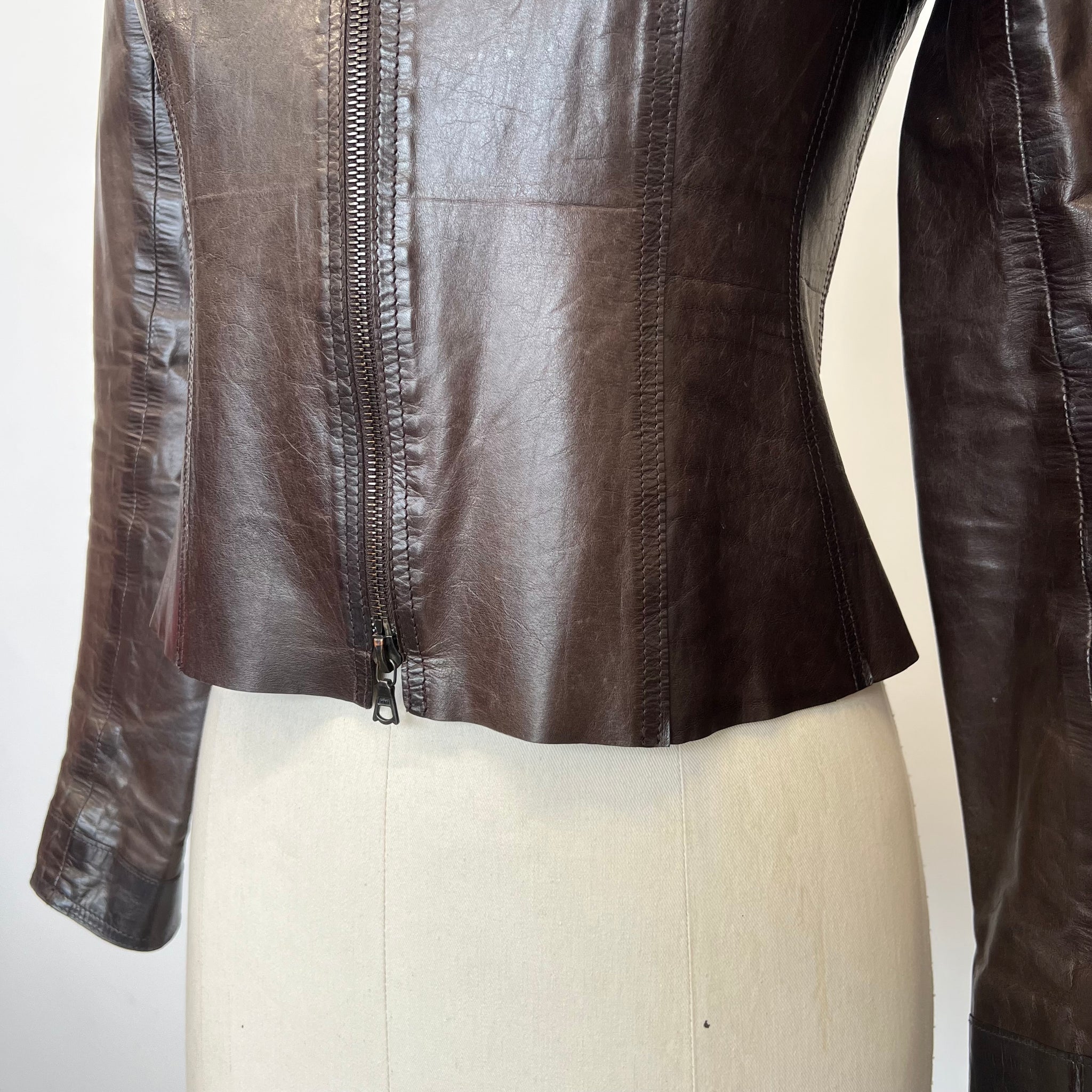 Veste pour femme en cuir de la marque québécoise M0851. Avec double fermeture éclair à l'avant, mince doublure. Collet classique. Tel que vu sur Catherine Renaud lors de la campagne Achetez c'est donner 2025 réalisée par Compagnie & Cie.