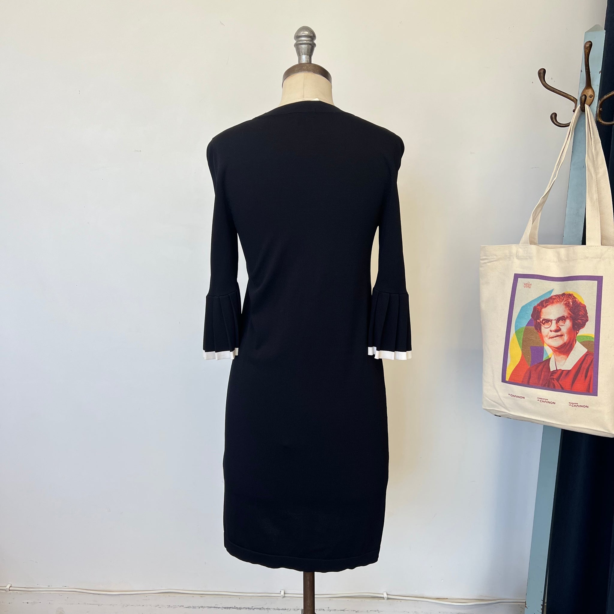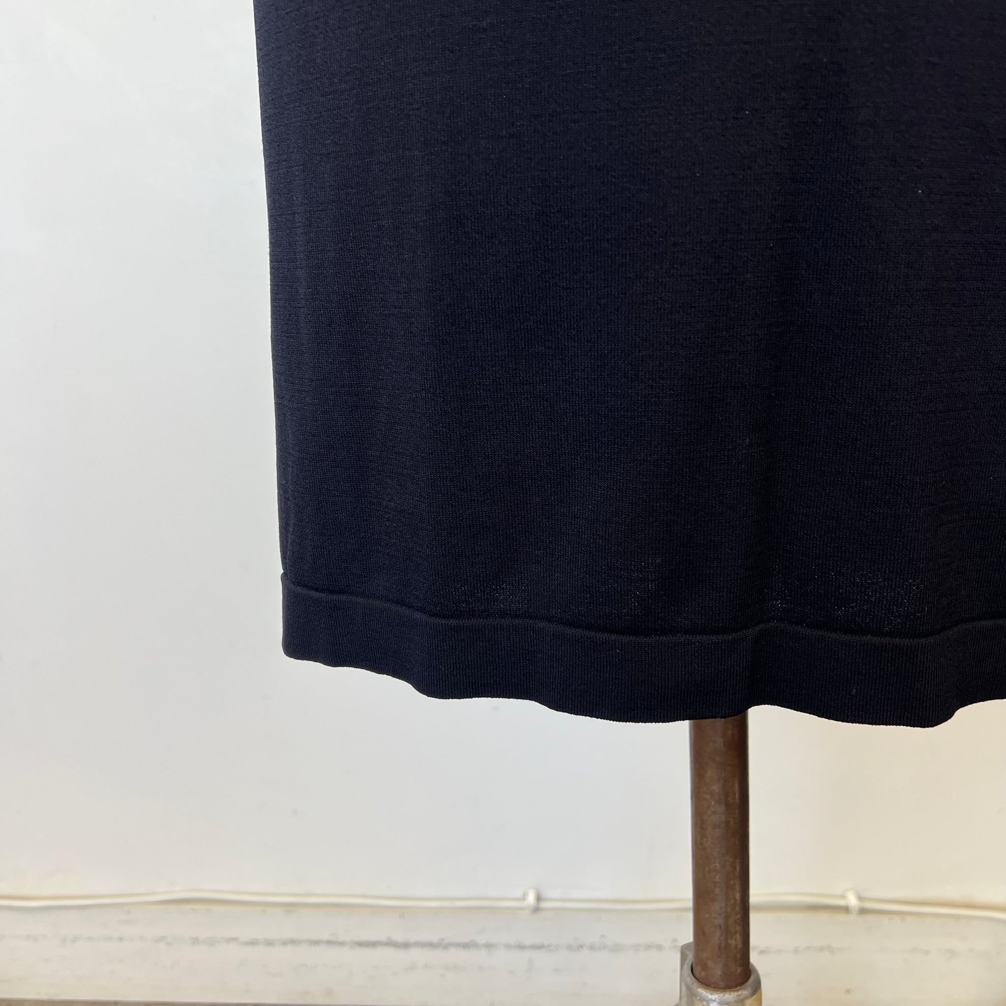 Robe bleue marine avec manche au coude à franges discrètes et petites bandes blanches décoratives. Tissu doux et confortable non doublé légèrement transparent.