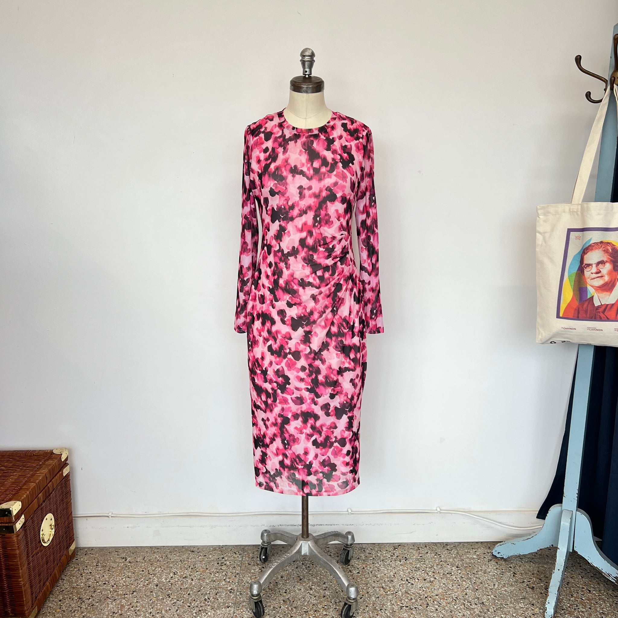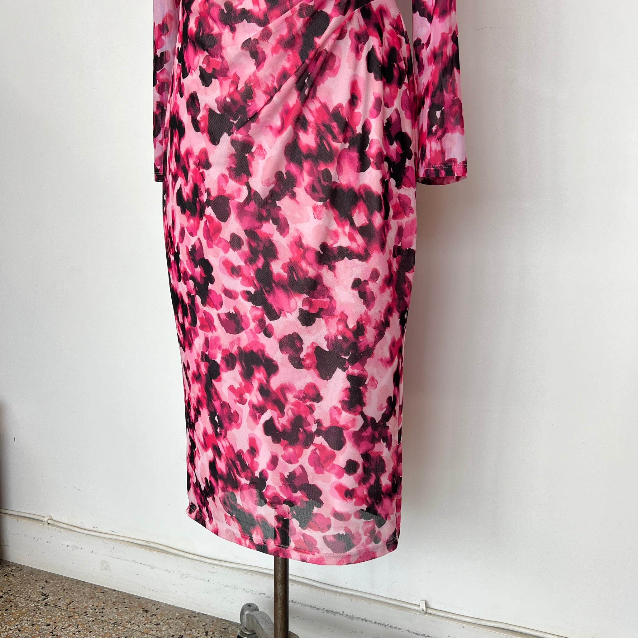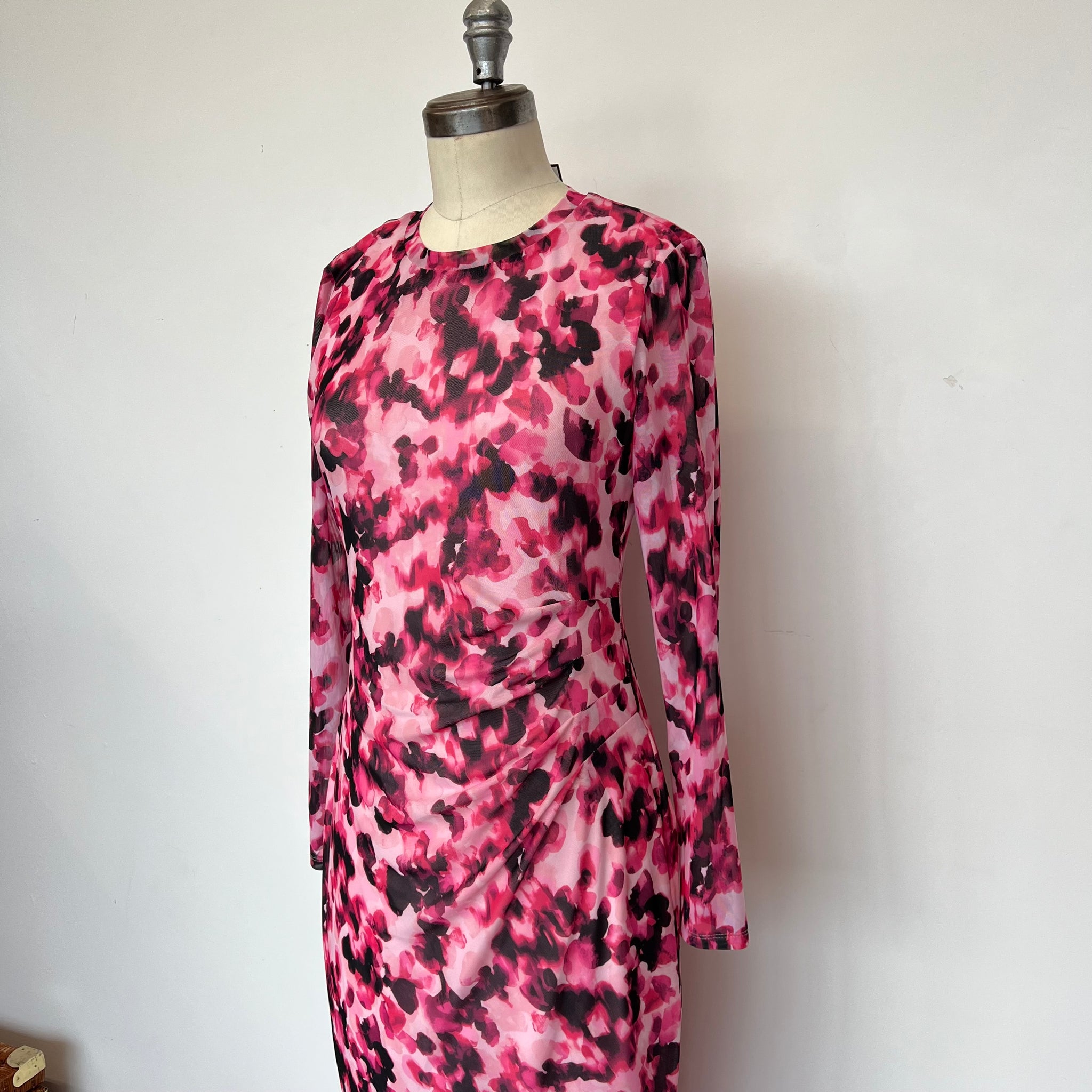 Robe de la marque Scapa Lauren Perre à manches longues. Principal tissu mesh et doublure rose pâle. Cintrée à la taille. Tissu extensible.