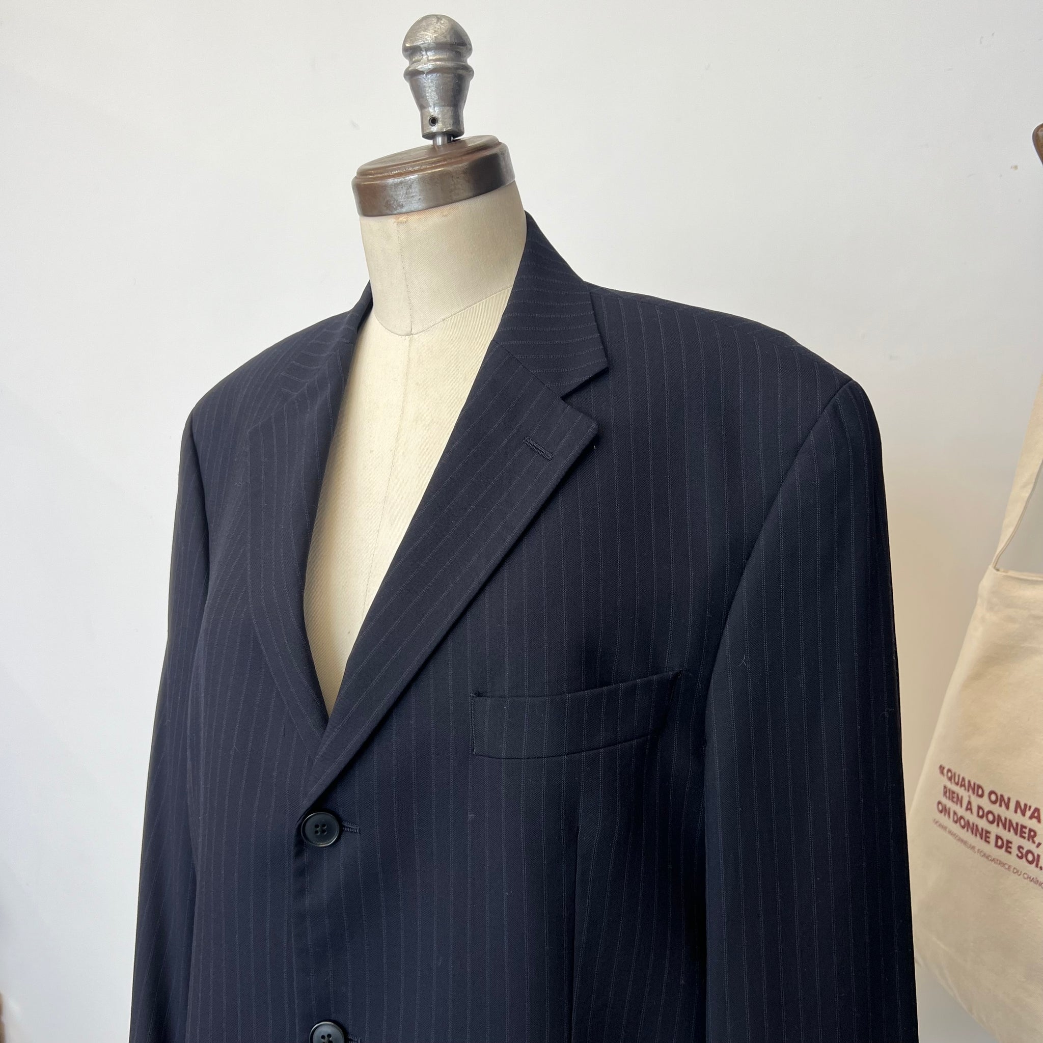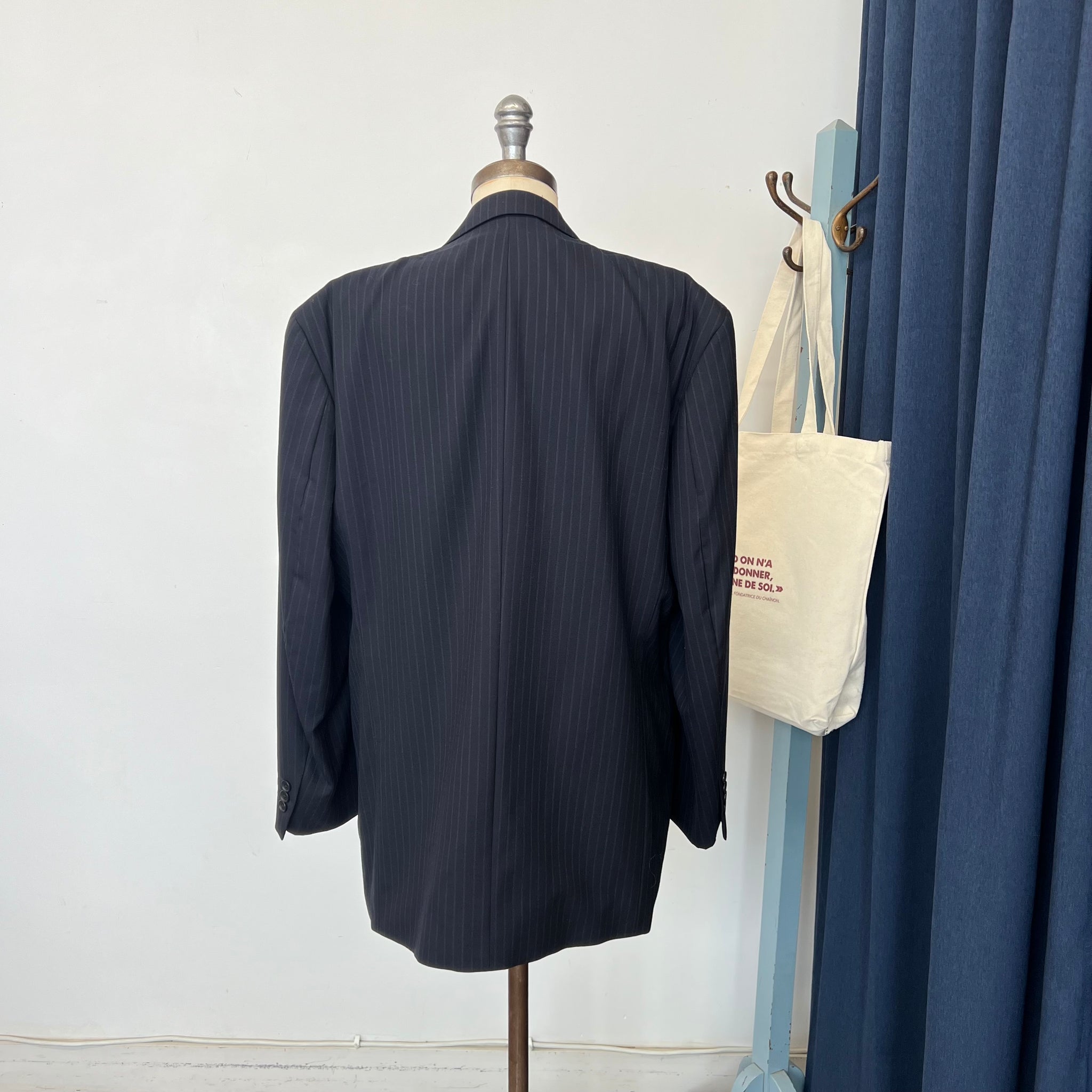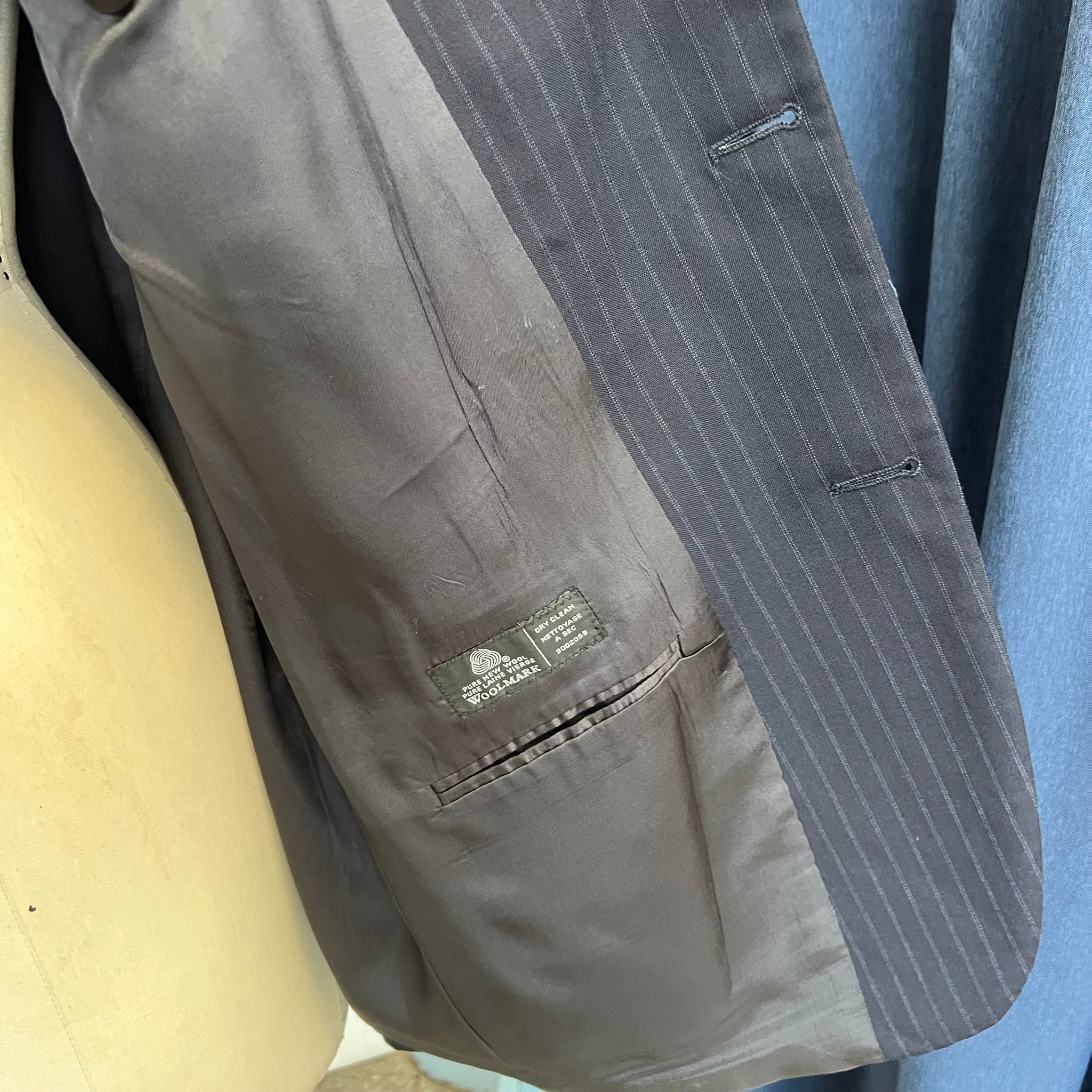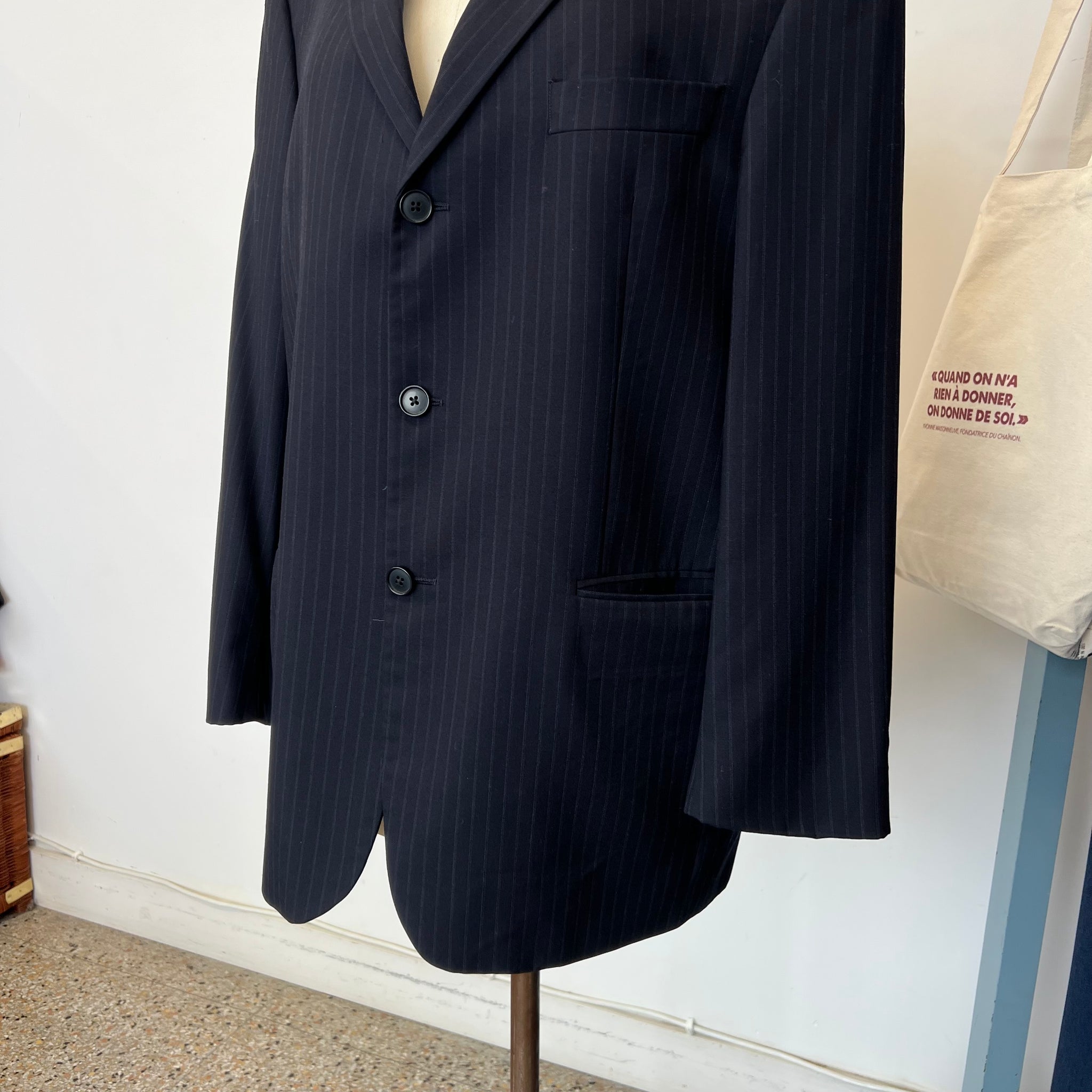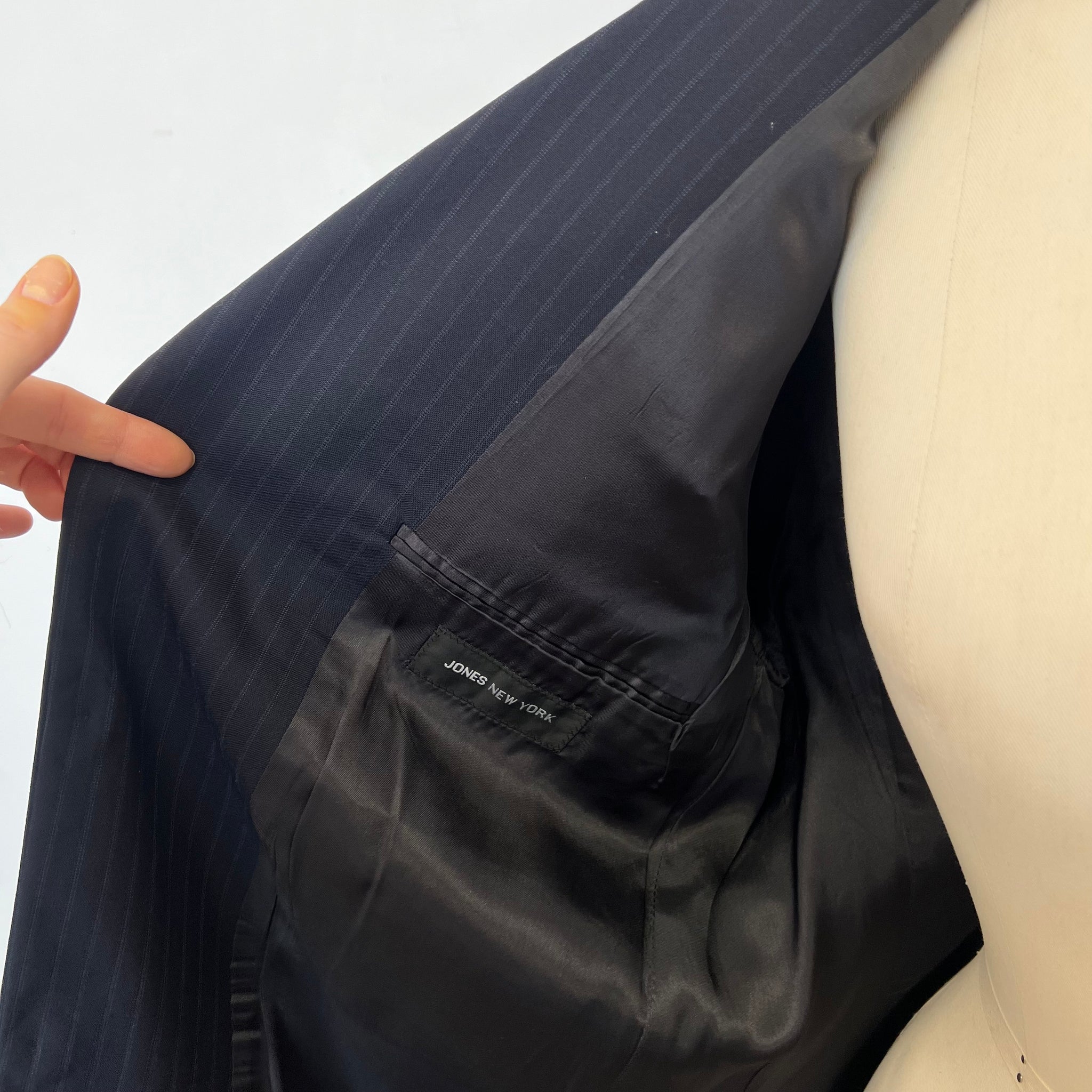 Veston pour homme de la marque Jones New York. Avec trois vraies poches à l'avant et une poche intérieure. Imprimé ligné discret sur fond bleu marin. S'attache avec 3 boutons. Tel que vu sur Antoine Pilon lors de la campagne Achetez c'est donner 2025 réalisée par Compagnie & Cie.