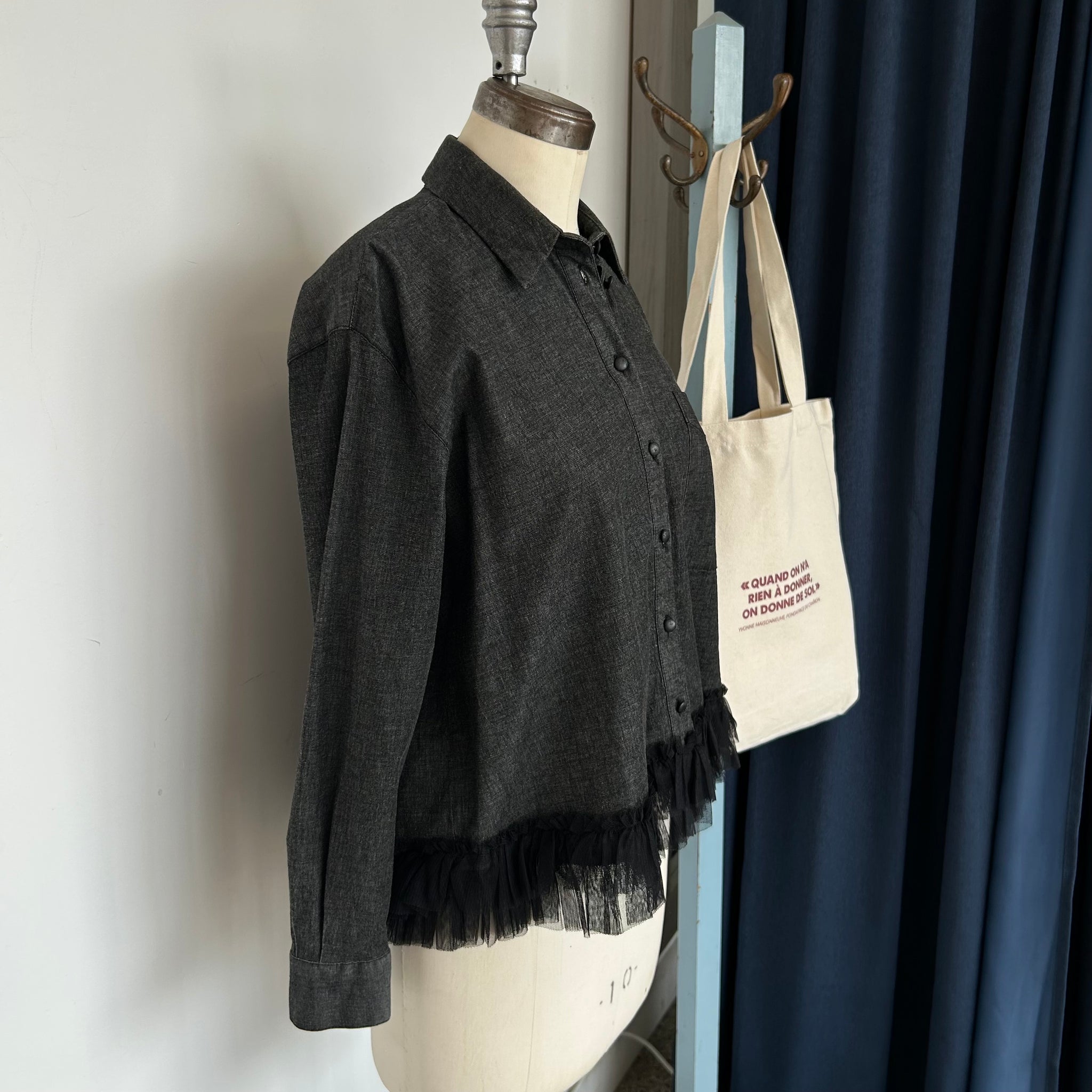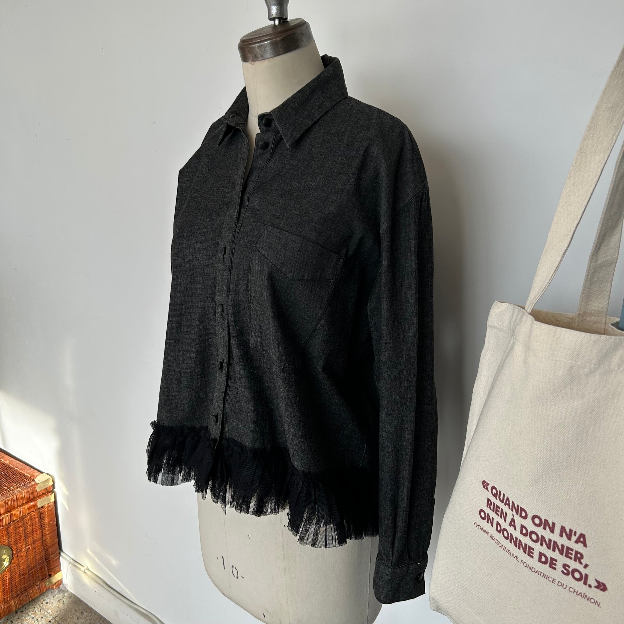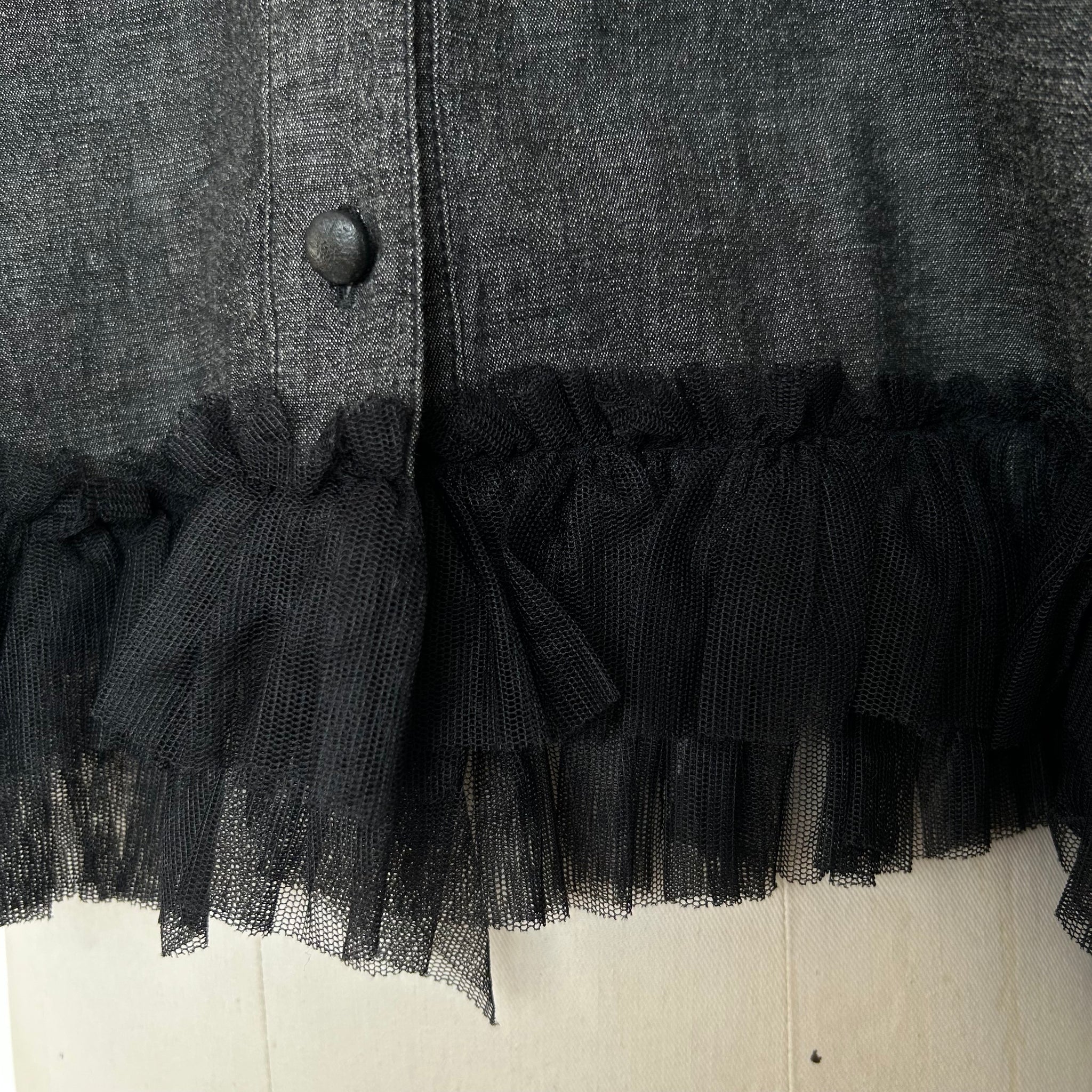 Magnifique chemisier de la marque Liu Jo Milano. Avec boutons noirs luisants, tissu mince qui imite du jeans, boutons aux manches, une poche sur la poitrine et décoration de style volant en tulle au bas. D'une valeur de 350$.