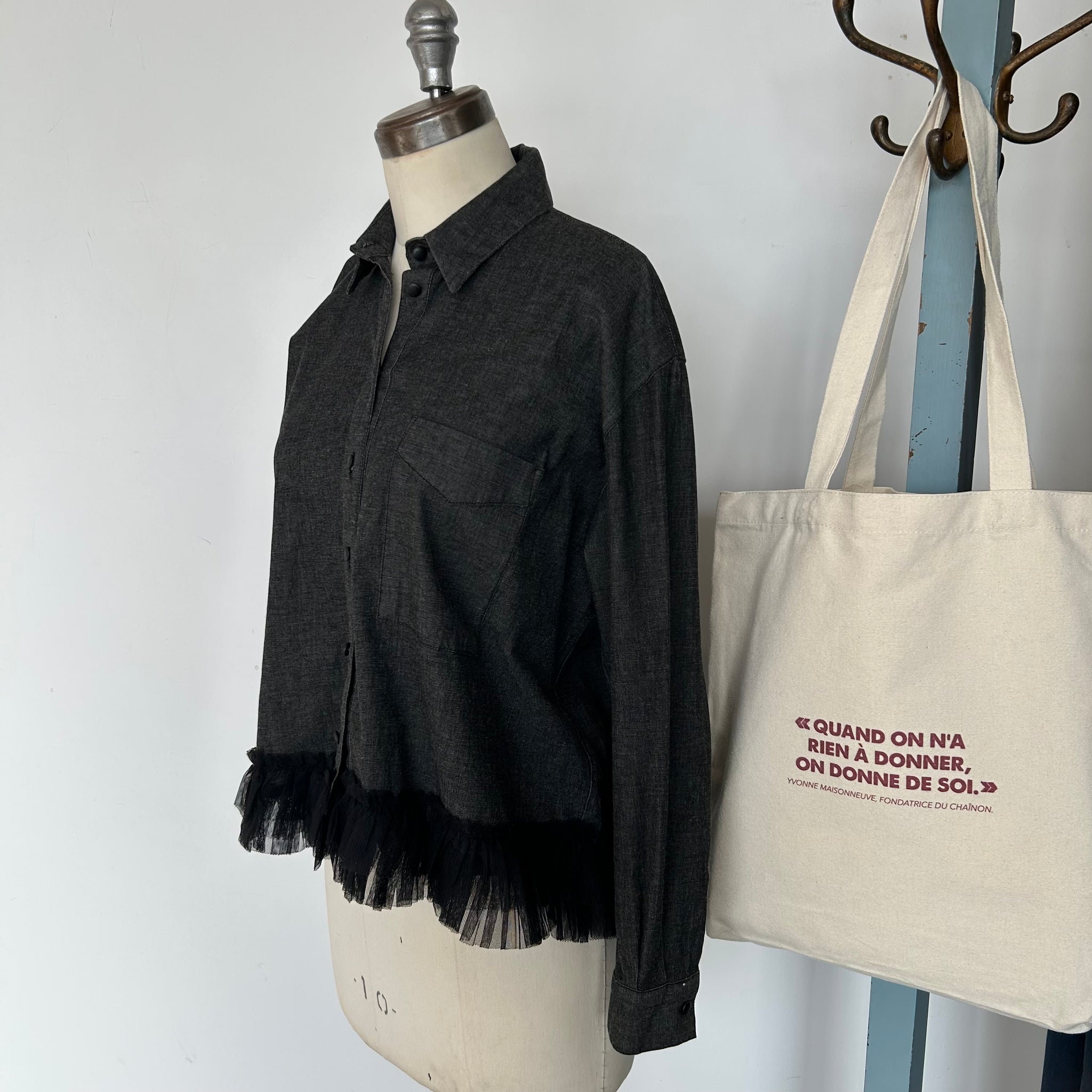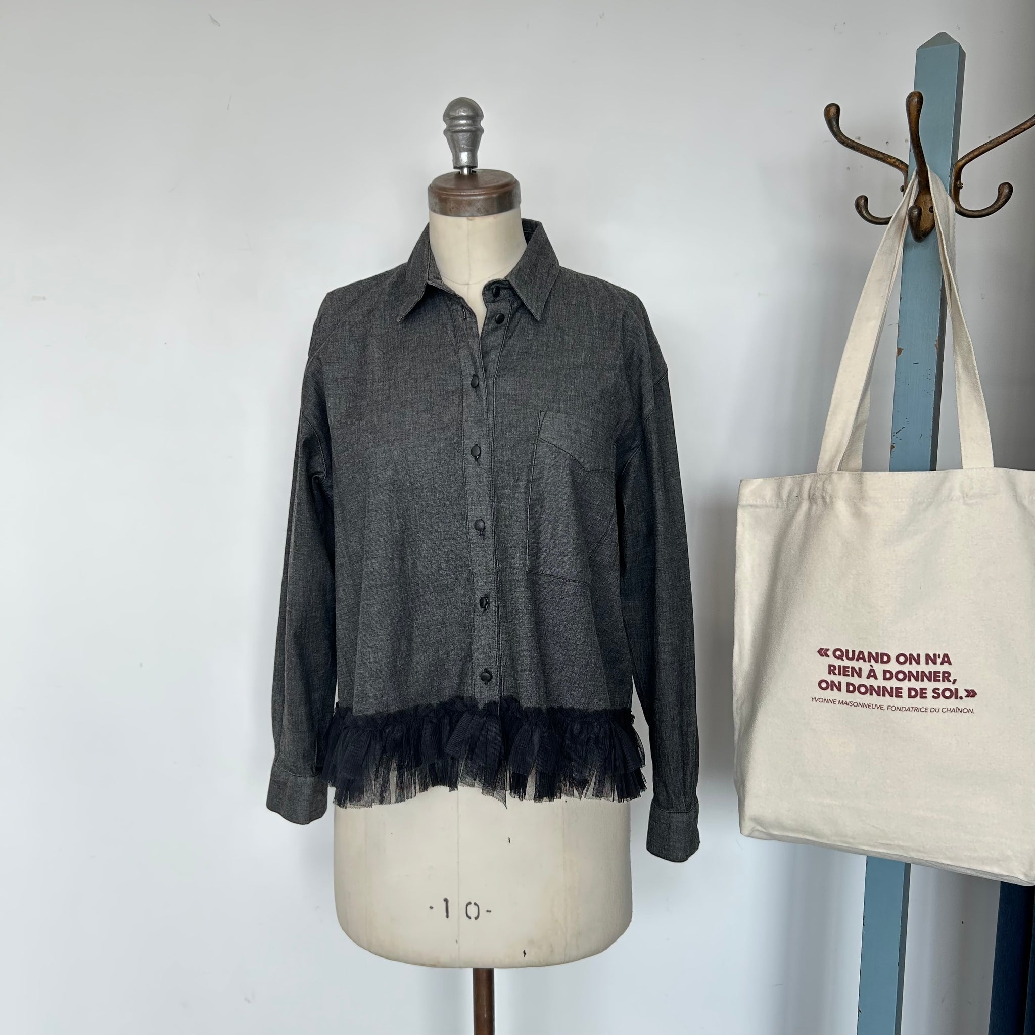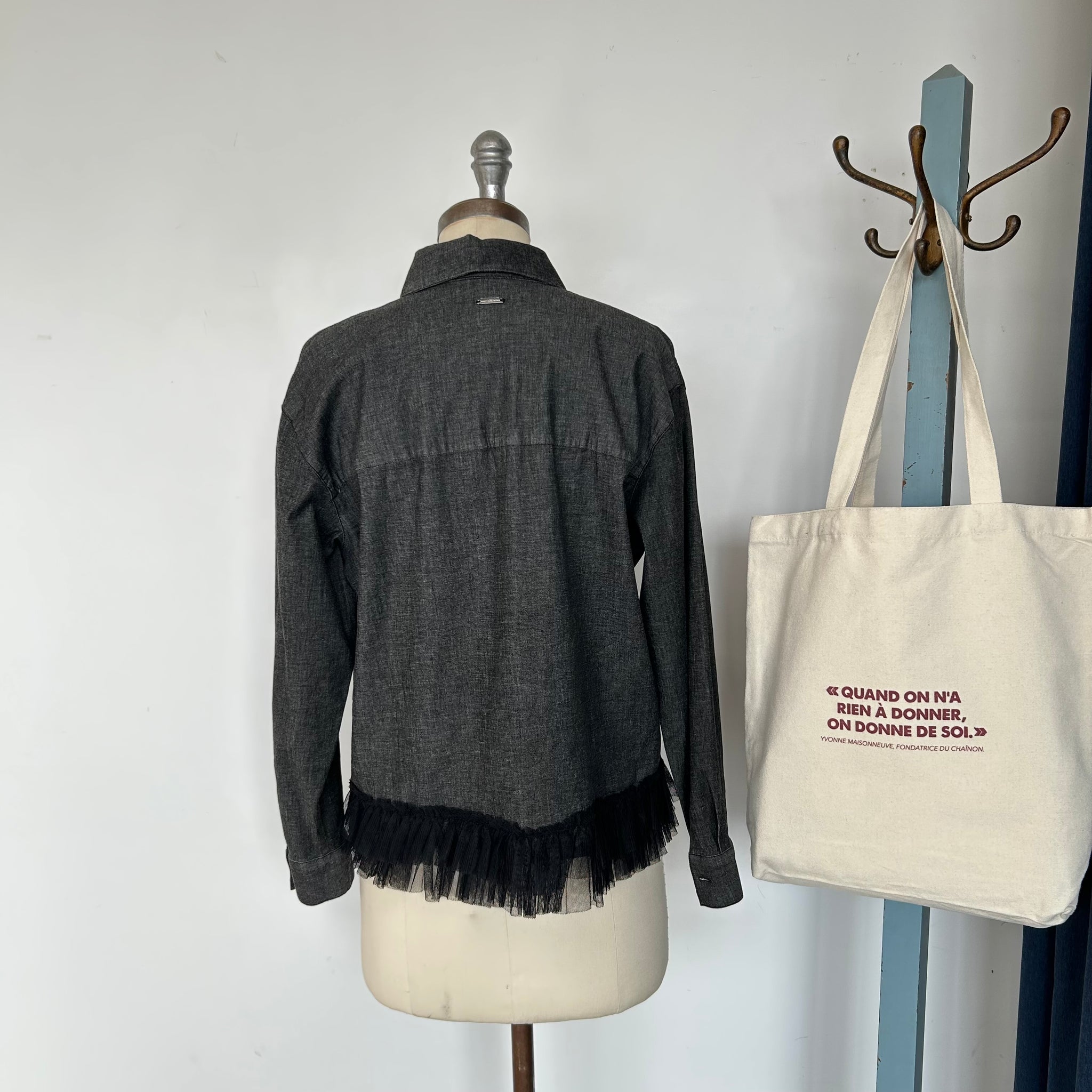 Magnifique chemisier de la marque Liu Jo Milano. Avec boutons noirs luisants, tissu mince qui imite du jeans, boutons aux manches, une poche sur la poitrine et décoration de style volant en tulle au bas. D'une valeur de 350$.