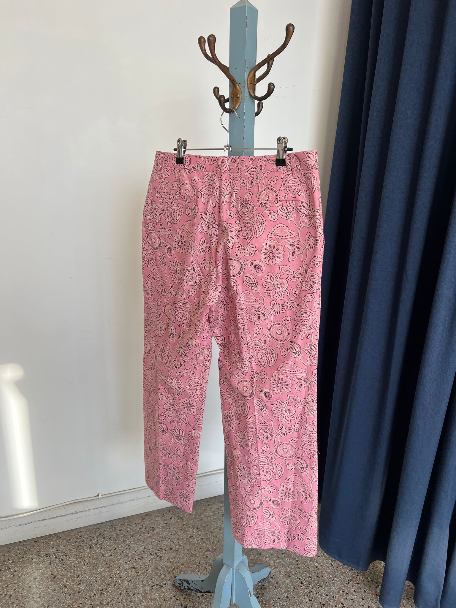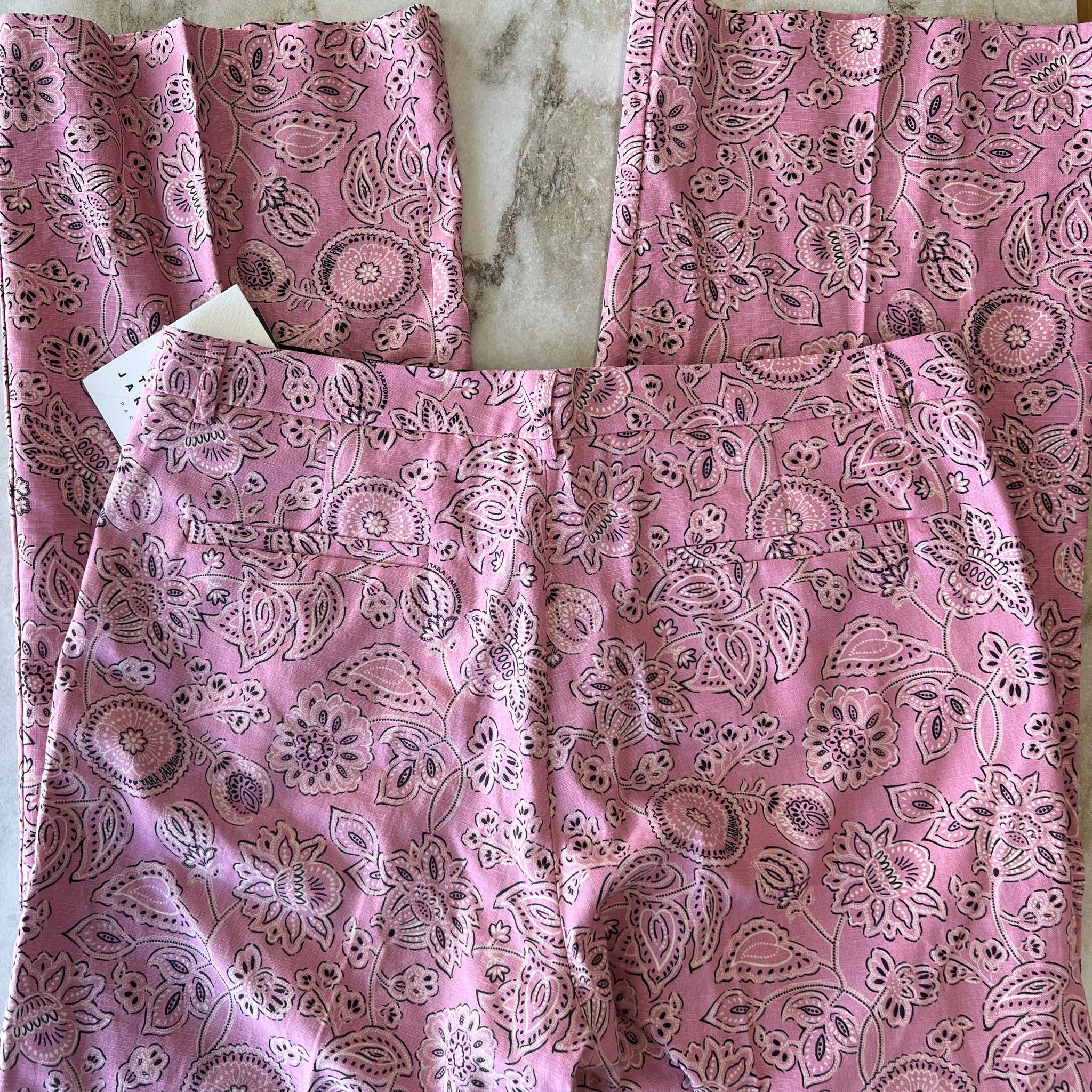 Ce pantalon de tailleur imprimé de notre motif bandana couleur bois de rose possède une taille mi-haute, une coupe 7/8ème et une jambe droite marquée de plis plats. Il a des poches italiennes aux cotés et deux poches passepoilées à l'arrière. Fermeture à l'avant par un zip et une agrafe. D'une valeur de 550$.