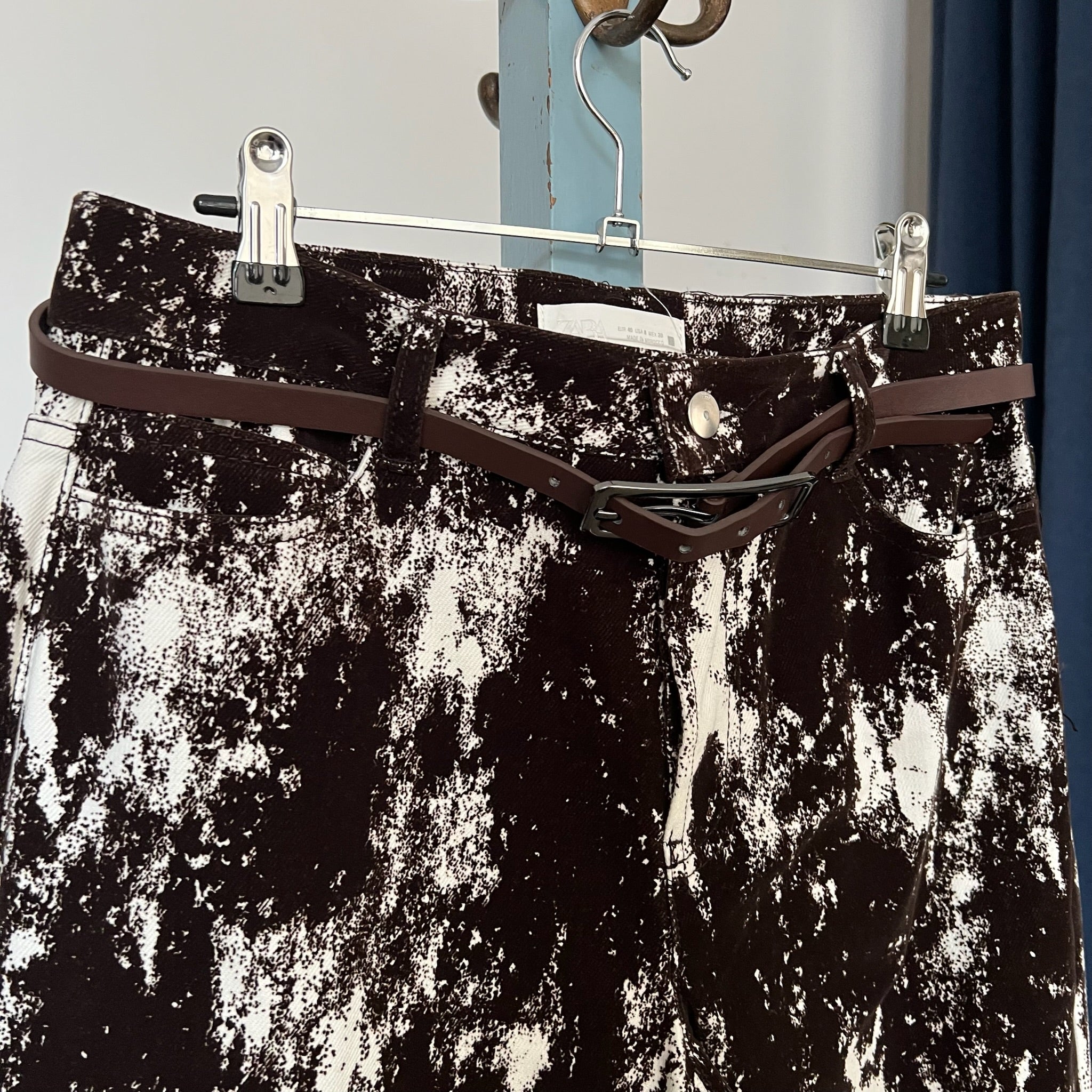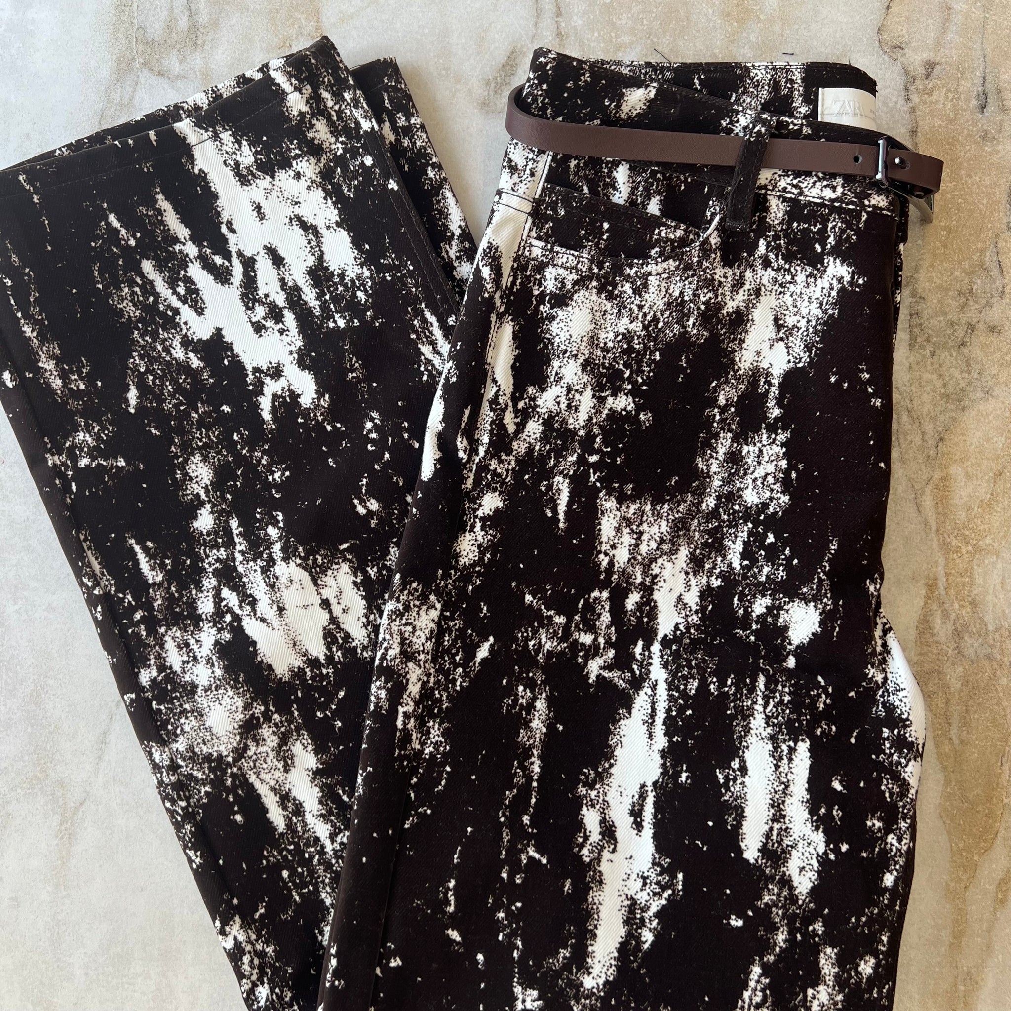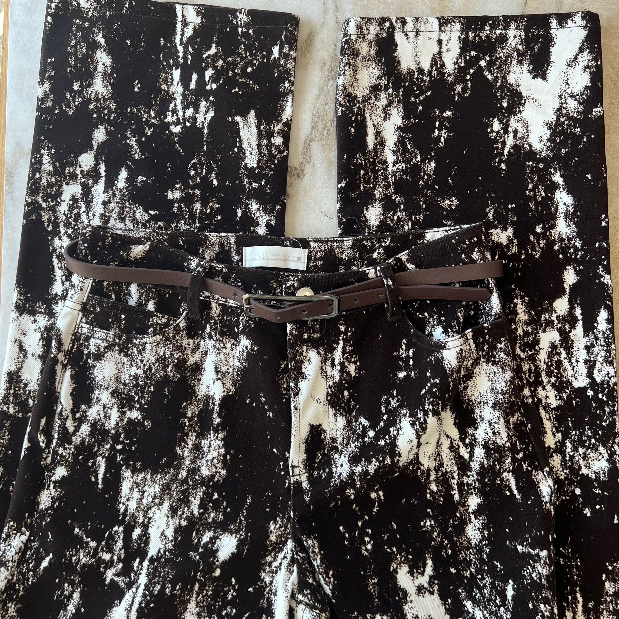 Pantalon jean taille haute et jambe large à imprimé animalier avec ceinture en faux cuir de la marque Zara. Détails en tissu floqué, style velours-corduroy-flocked fabric. Veste assorti également disponible.