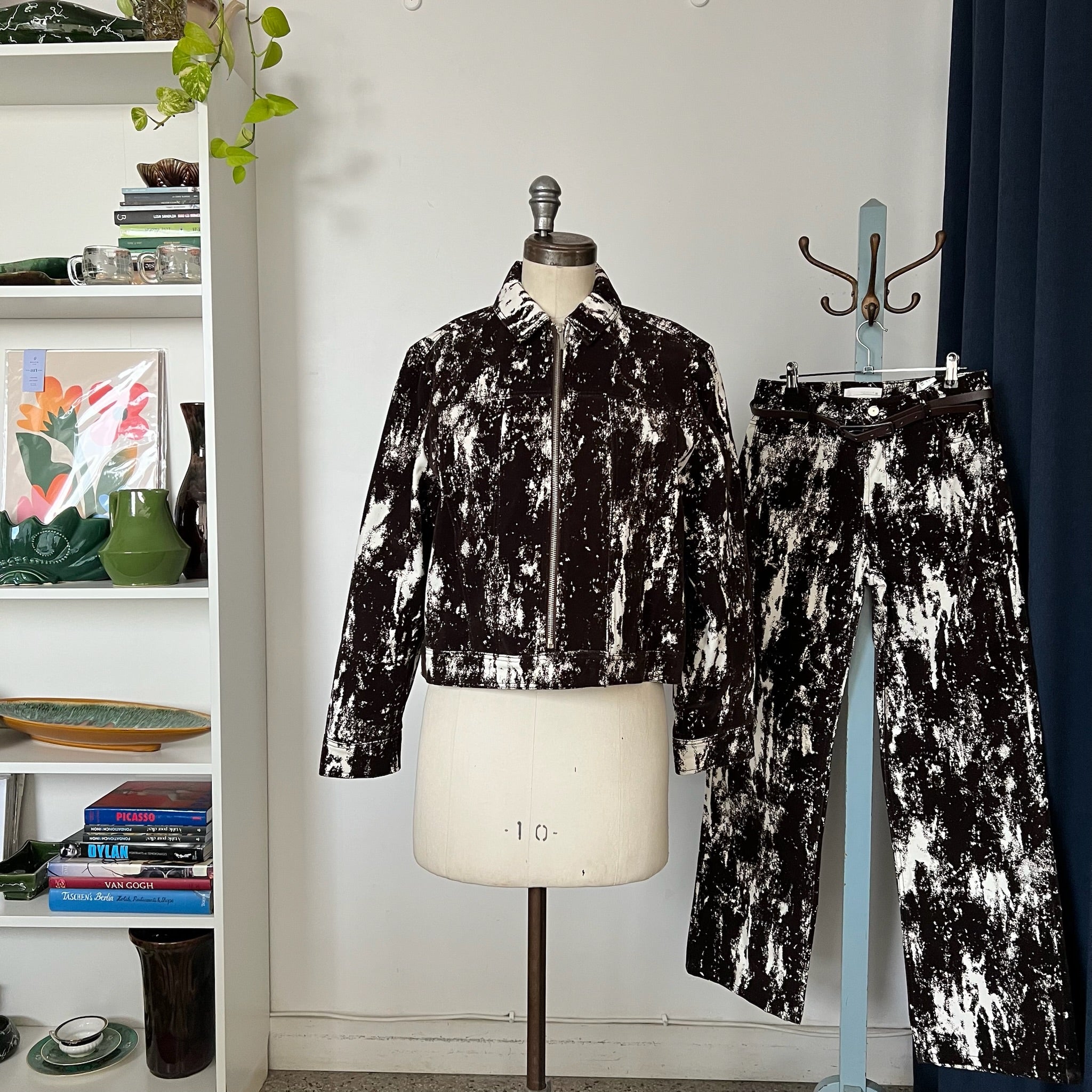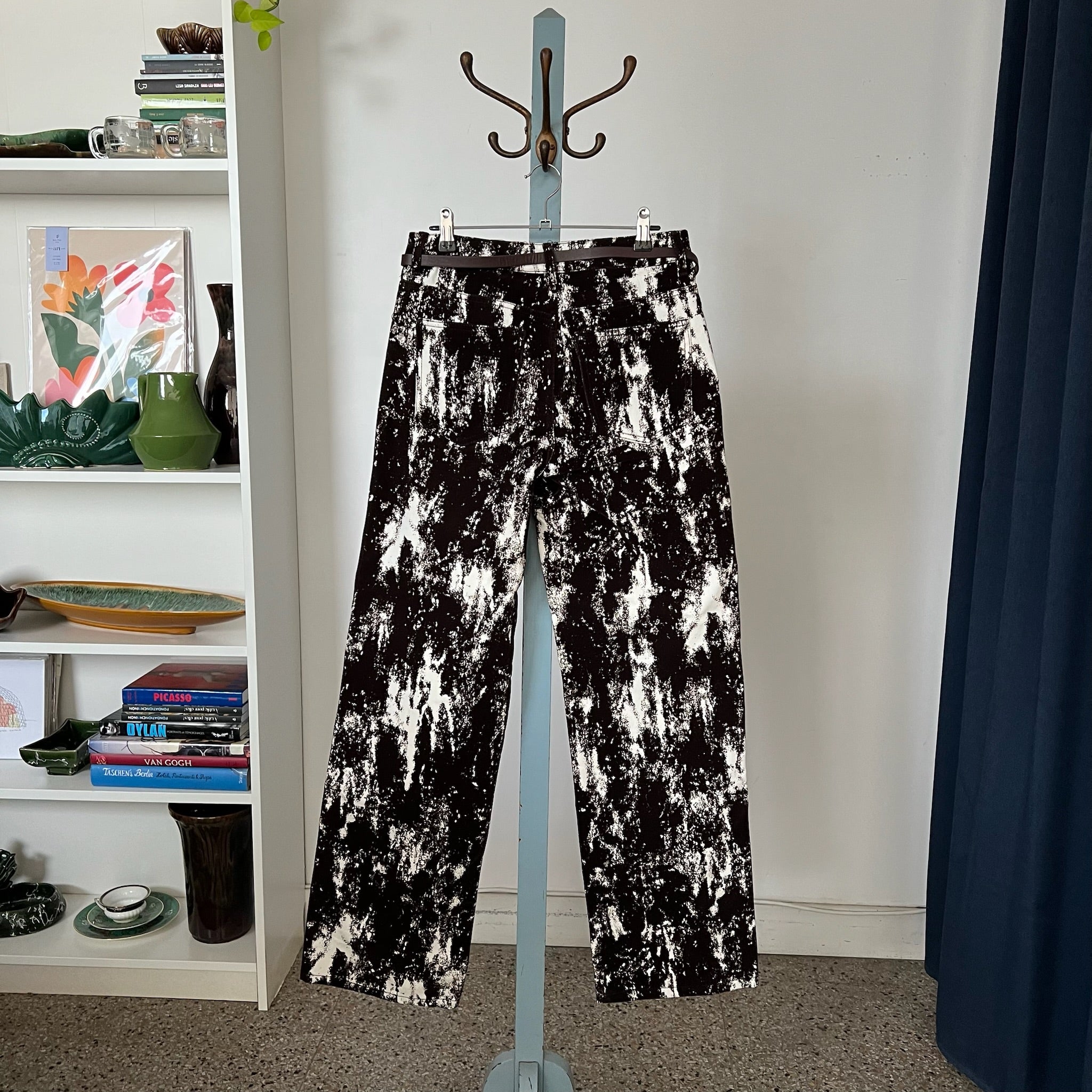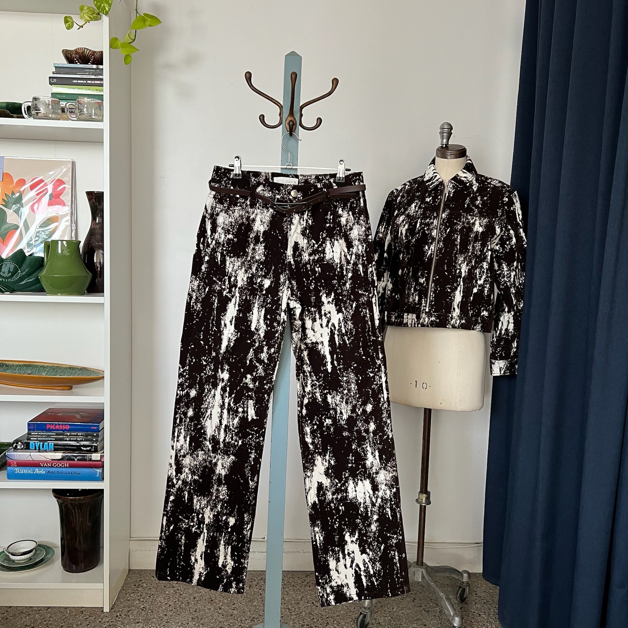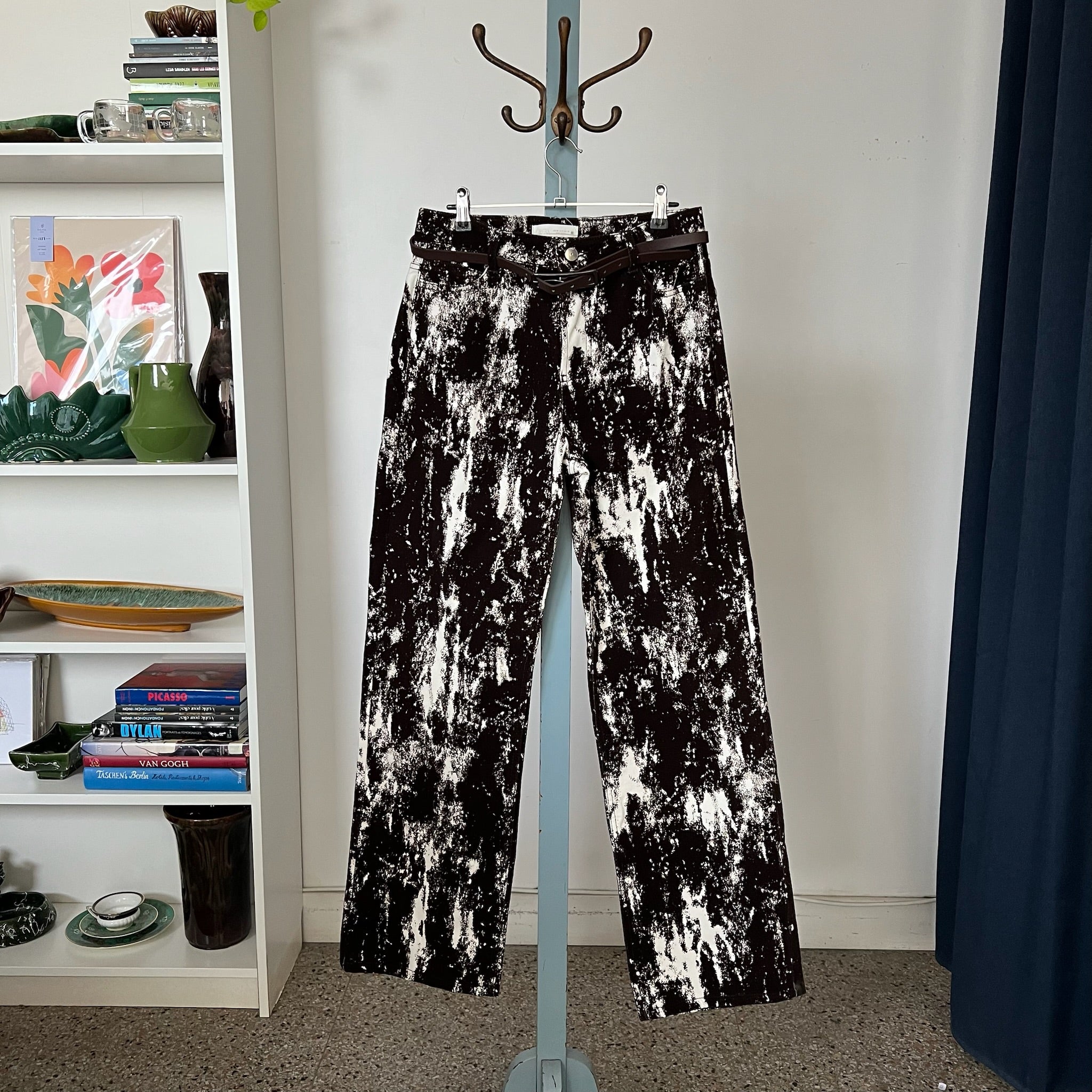 Pantalon jean taille haute et jambe large à imprimé animalier avec ceinture en faux cuir de la marque Zara. Détails en tissu floqué, style velours-corduroy-flocked fabric. Veste assorti également disponible.